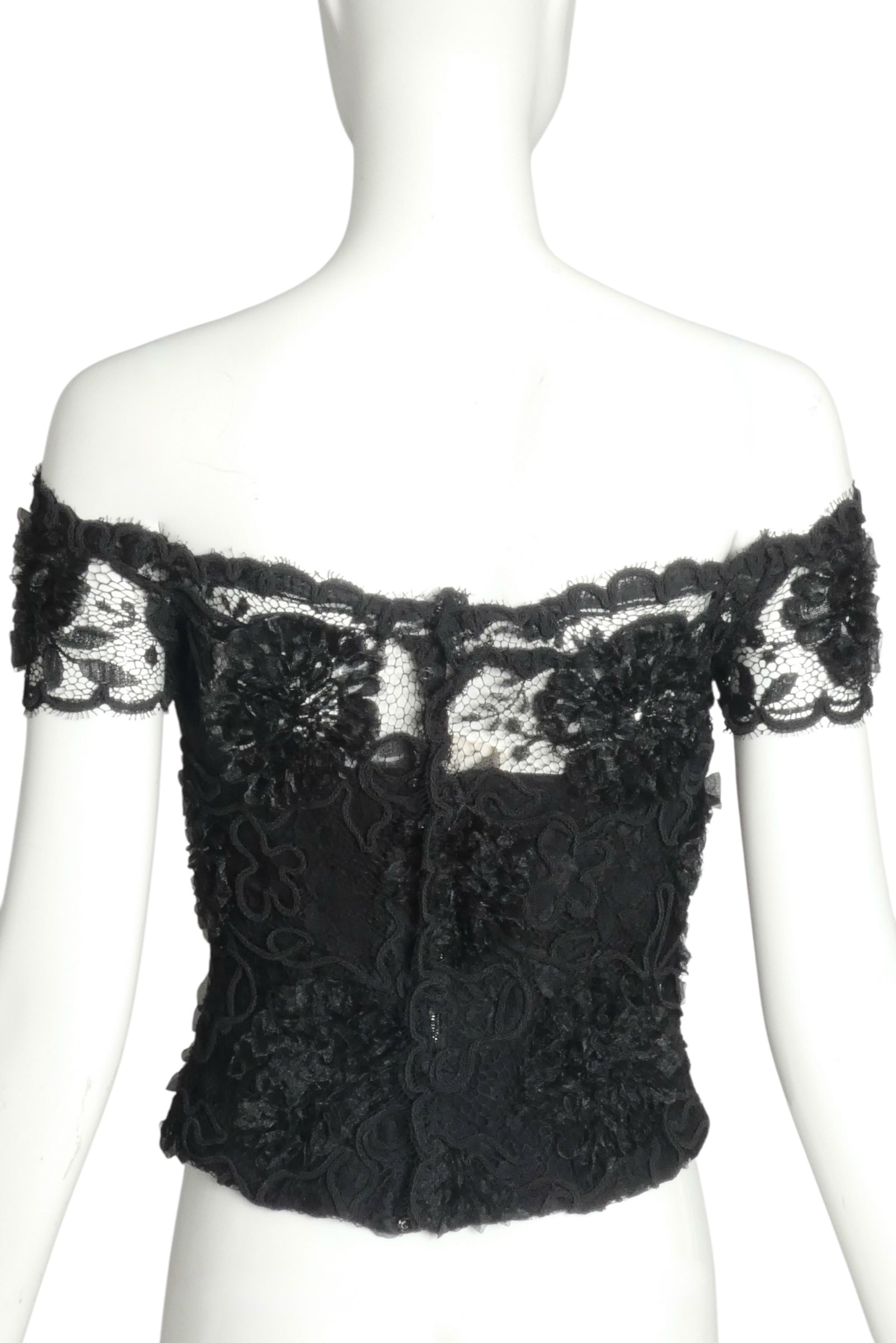 Description: A coveted Chanel bustier top from F/W 1995. Crafted in black lace with striking black ruffled organza ribbon detailing throughout, this piece epitomizes the house's sensual aesthetic. The off-shoulder silhouette features a graceful scoop neckline and delicate short sleeves, while an integrated underwire construction provides structured support. A sophisticated statement piece that captures Chanel's mastery of luxury fabrication and refined seduction—essential for serious vintage couture collectors.