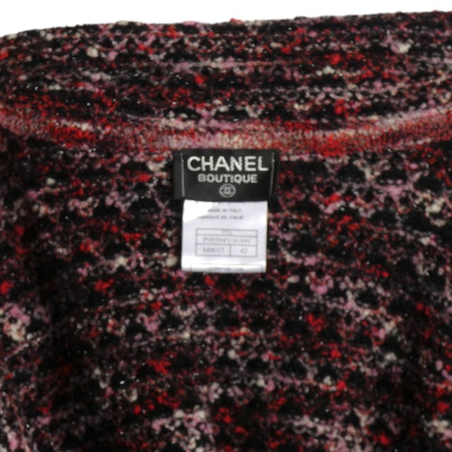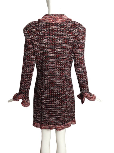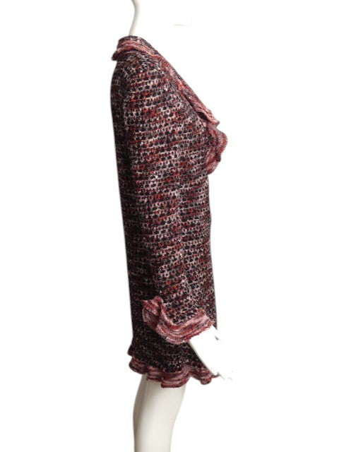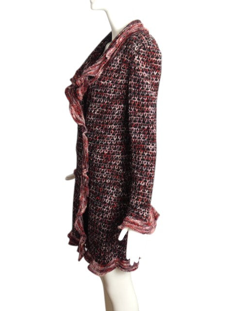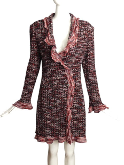 Description: Add a pop of color to your wardrobe with this stunning CHANEL 1997 Multi Color Ruffle Knit Cardigan! The beautiful shades of pink and red, combined with a touch of sparkly silver, create a mesmerizing pattern that will turn heads. This cardigan features a charming ruffle design down the front, on the wrists, and along the hemline, adding a playful and feminine touch. The double breasted button closures, proudly displaying the iconic "CC" logo, complete the look of this must-have piece. Elevate your style and embrace the luxurious experience of owning a CHANEL cardigan!