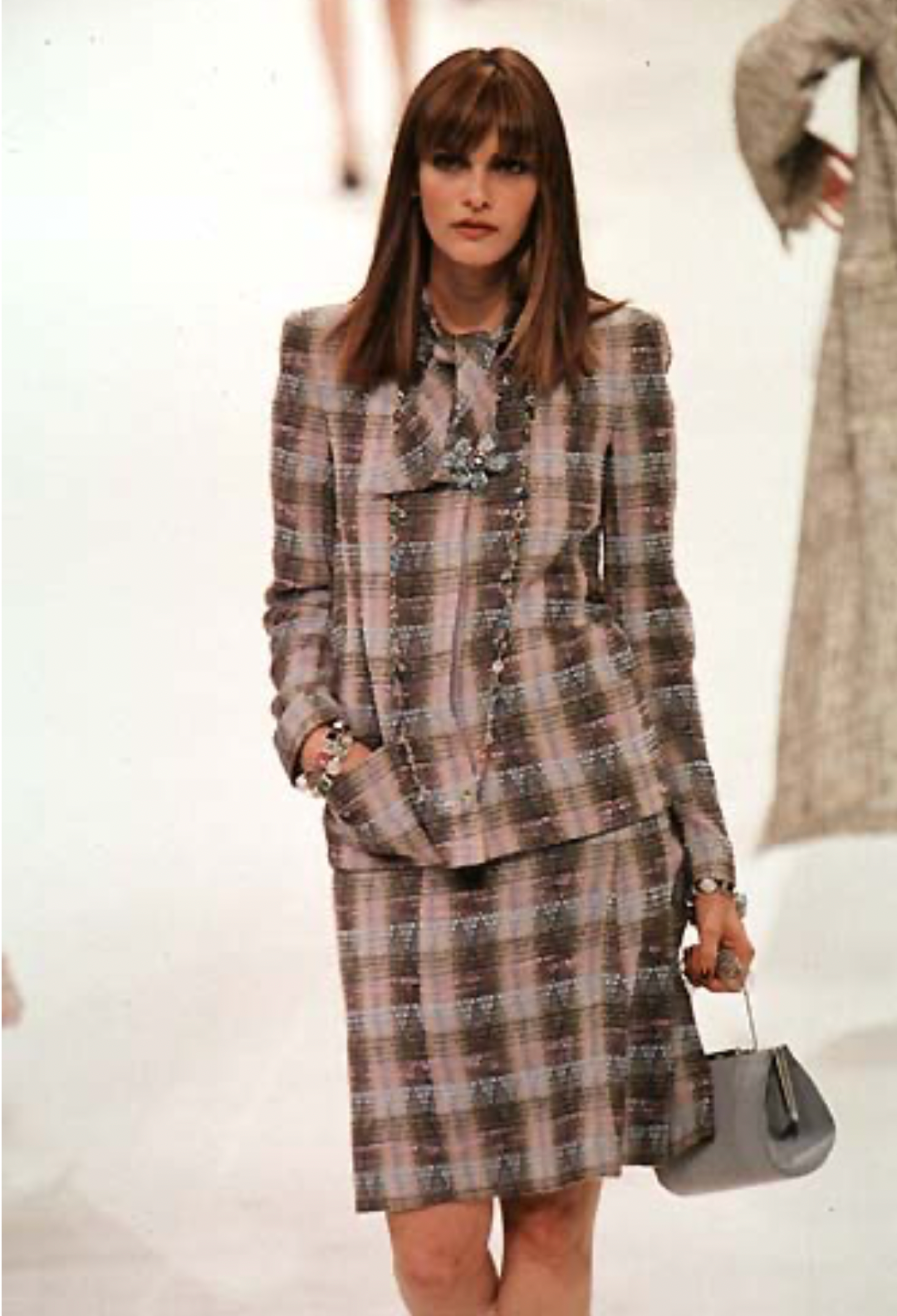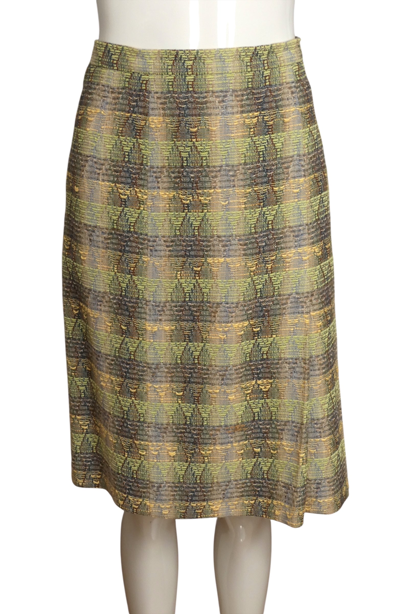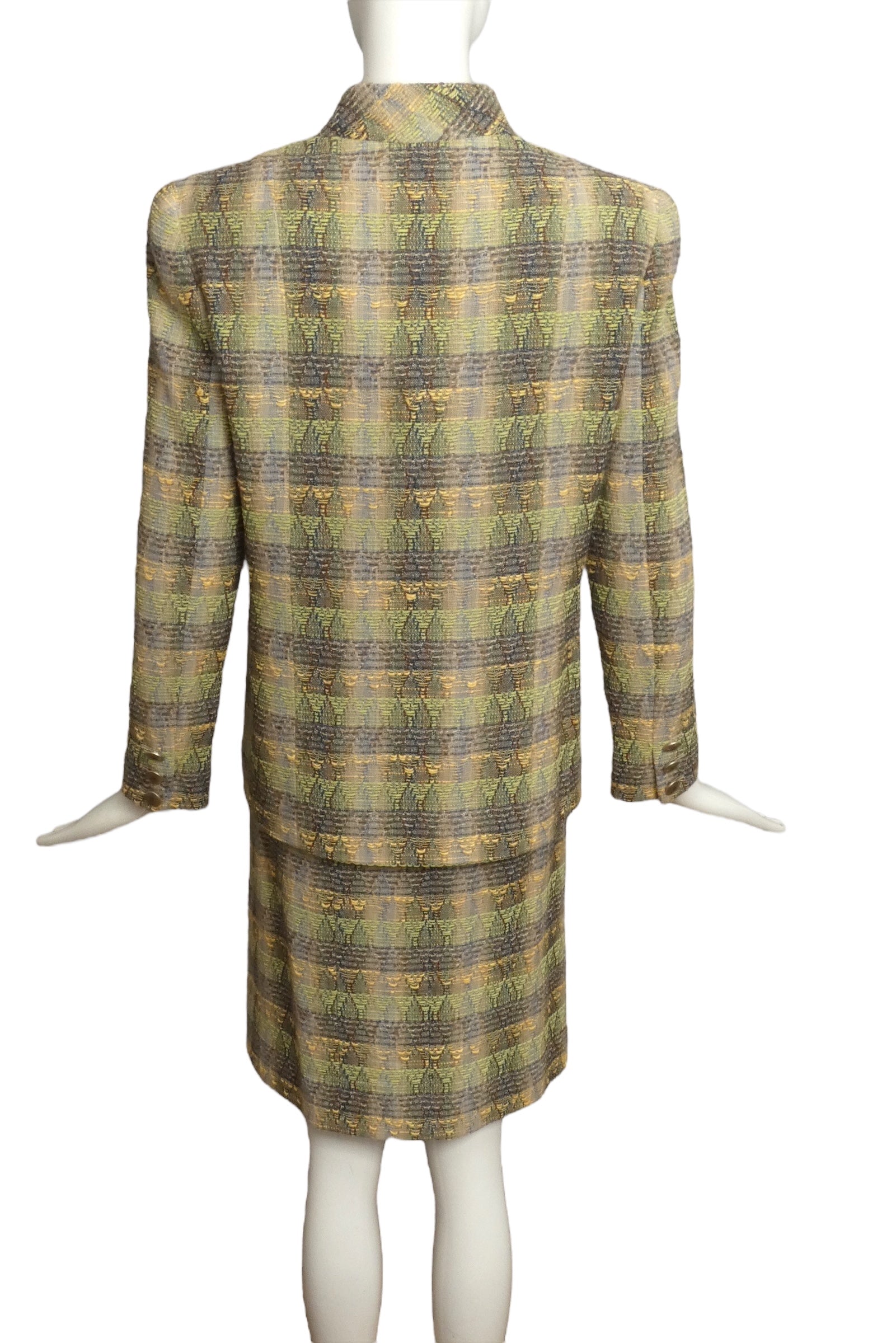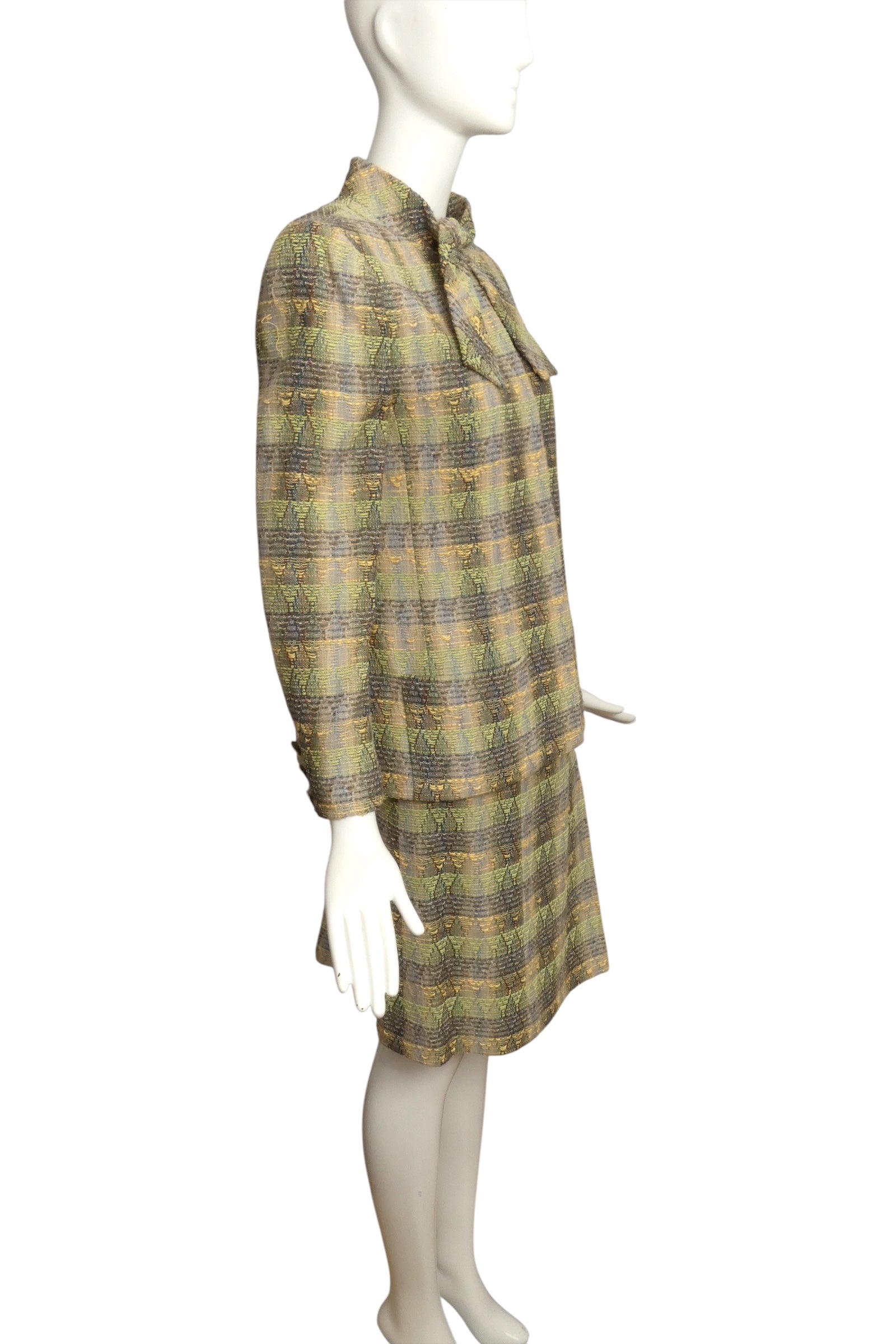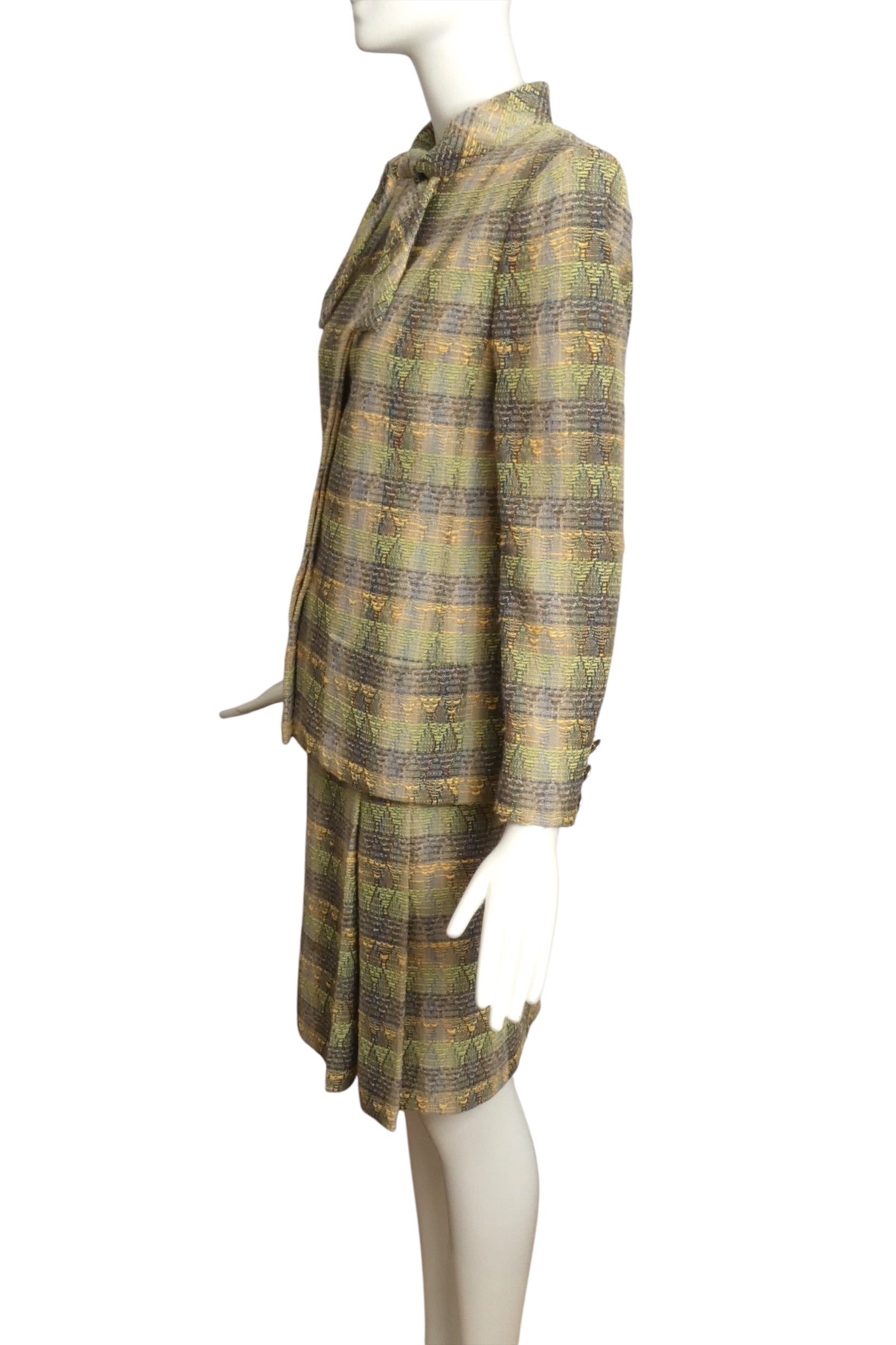 Description: Step into chic with this fabulous Chanel suit from the Spring 1989 runway! Made from a cozy blend of green, grey, and yellow wool tweed, its playful plaid pattern turns heads. The boxy jacket rocks a built-in necktie and sneaky hidden buttons for a fresh take on classic style. The slim skirt flaunts flirty pleats on the lower left, while the secret chain inside the hem adds that unmistakable Chanel charm. This suit is your ticket to mixing bold fun with timeless elegance!