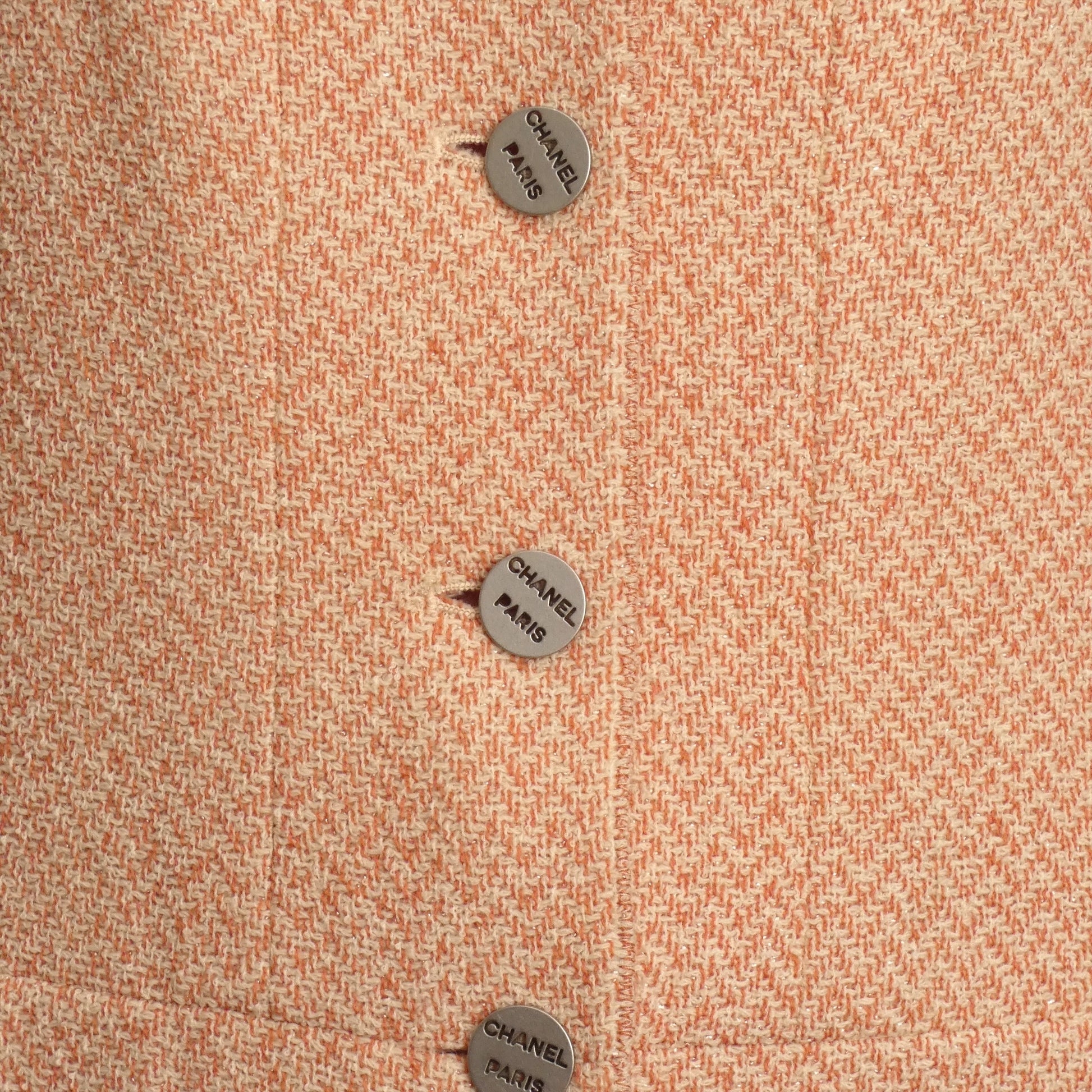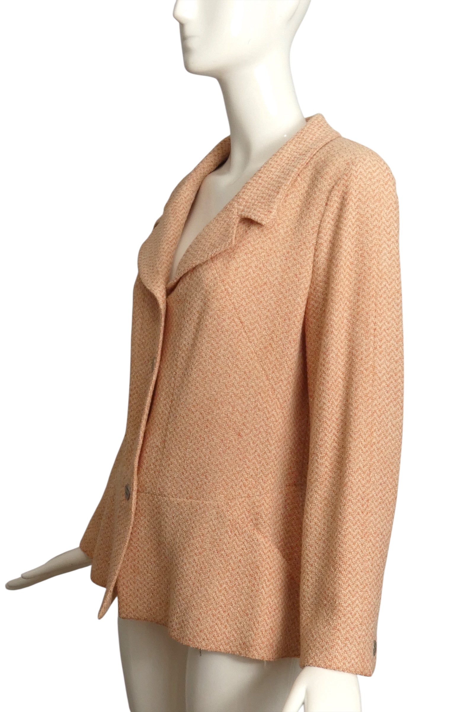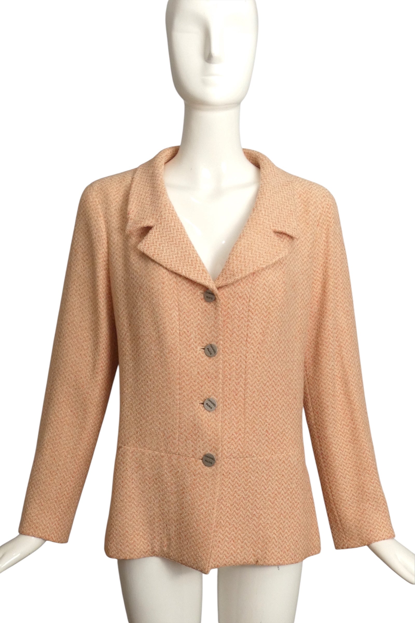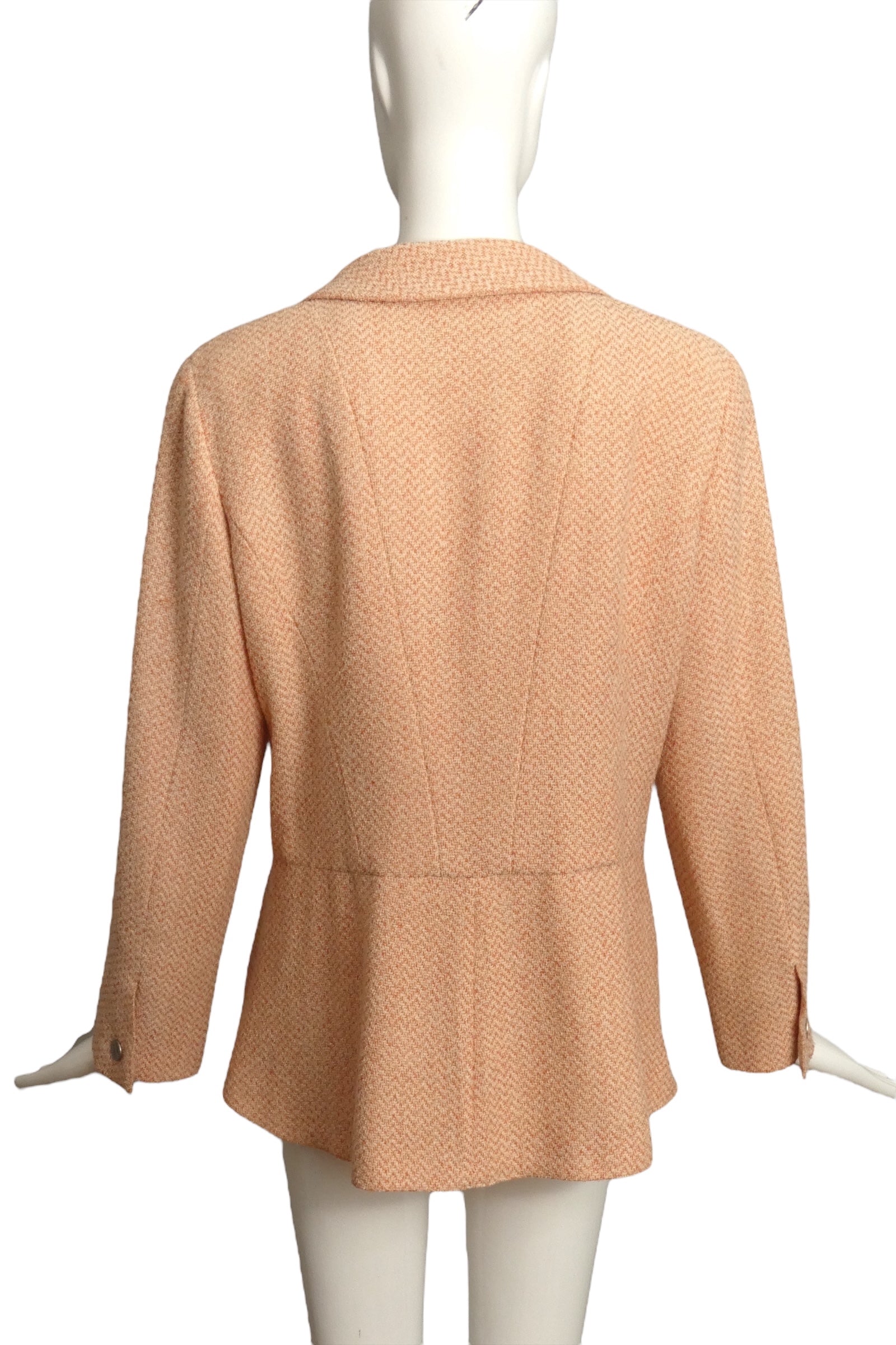 Description: Step out in style with this playful Chanel Cruise 2000 wool blazer, boasting a charming pale pink and ivory chevron pattern. The notched lapels and pewter buttons engraved with "Chanel, Paris" add a dash of chic sophistication. With handy inset hip pockets and a flattering peplum silhouette, it’s as functional as it is fabulous. Plus, the iconic chain inside the hemline lets you carry a little piece of fashion history wherever you go. Perfect for adding a luxurious twist to any outfit!