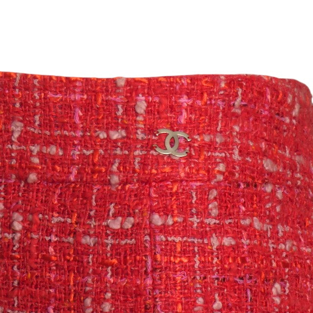 Description: Gorgeous cotton tweed skirt in a coral and pink weave. The slender skirt falls from a wide waistband in gores to the band around the hemline. a silver metal "CC" adorns the left side waist.