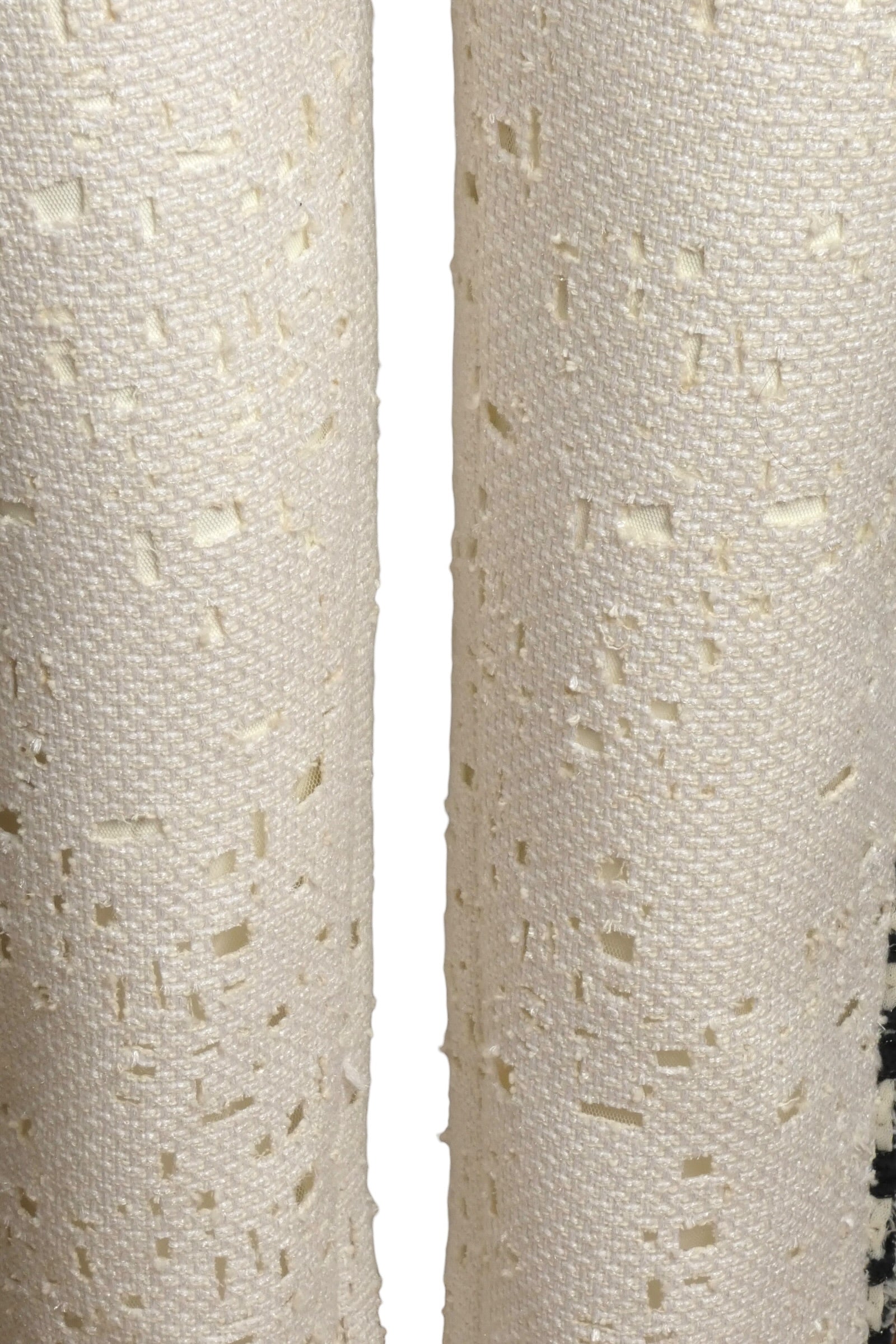 Description: Elevate your wardrobe with these exceptional Chanel trousers from the coveted Spring/Summer 2011 collection. Crafted from pristine white cotton tweed, they showcase an intricate laser-cut pattern paired with striking black boucle trim running down the sides—a signature detail that exemplifies Chanel's refined design philosophy. The structured tweed fabric offers both sophistication and comfort, while the contrasting side trim creates a modern silhouette. Never worn, these size 8 trousers represent a rare opportunity to own a piece from one of fashion's most celebrated seasonal collections. Perfect for the discerning collector or anyone seeking investment-worthy designer pieces.