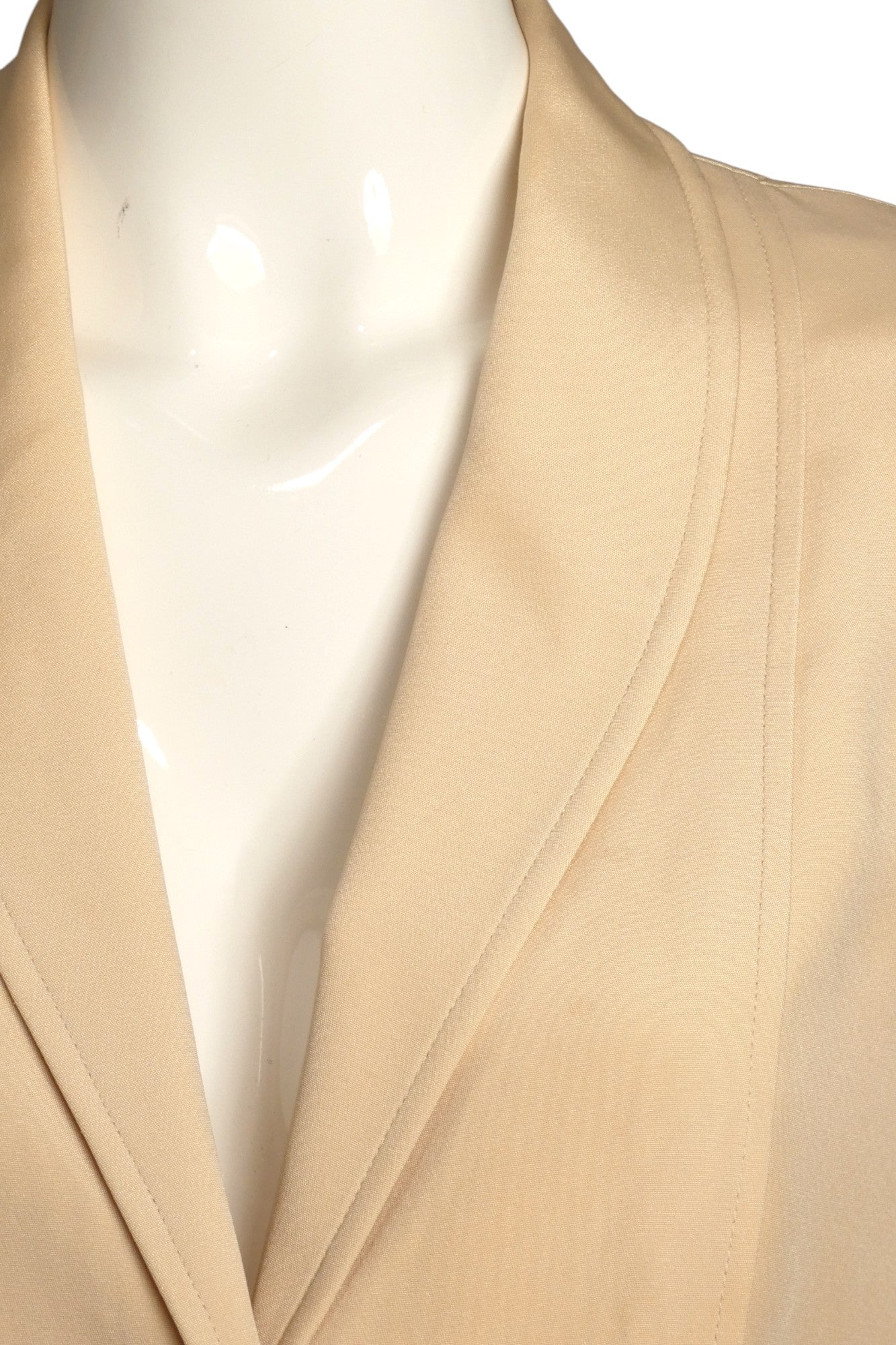 Description: This exceptional 1980s ensemble in luminous ivory silk exemplifies Chanel Boutique's meticulous attention to silhouette and detail. The jacket features architectural shawl lapels that frame the décolletage with characteristic elegance, while the precision-engineered button closures create a streamlined front profile. Most notably, the suit is adorned with 13 exquisite shamrock-shaped Chanel buttons—a distinctive design element that not only authenticates the piece but infuses it with dynamic visual interest. These signature fastenings, crafted with the house's renowned precision, transform this already sophisticated garment into a collector's item that embodies the refined aesthetic sensibilities of late 20th century Chanel craftsmanship.
