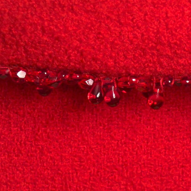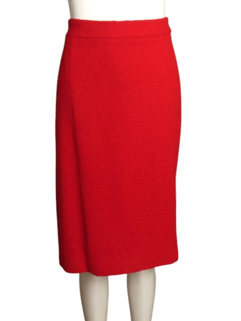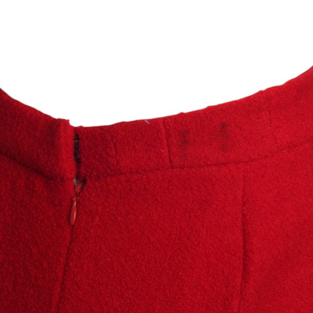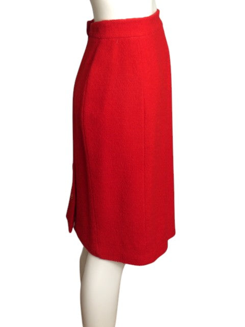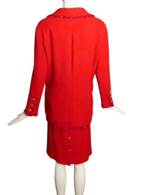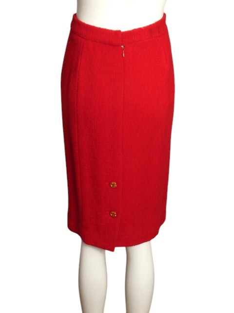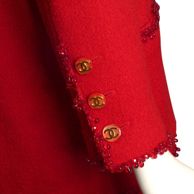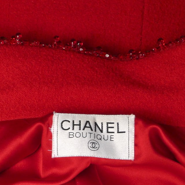 Description: Indulge in a truly luxurious experience with this exquisite Chanel cocktail suit in vibrant red wool boucle. The jacket boasts elegant notched lapels and discreet button closures, while expertly placed princess seams and dart fittings effortlessly flatter your figure. Adorned with stunning glass teardrop and faceted beads, this suit exudes sophistication and refinement. The wrists and back of the lower skirt are adorned with red lucite and Gold metal "CC" buttons, adding an additional touch of glamour. The accompanying skirt drapes gracefully from a wide waistband, perfectly completing the overall look.