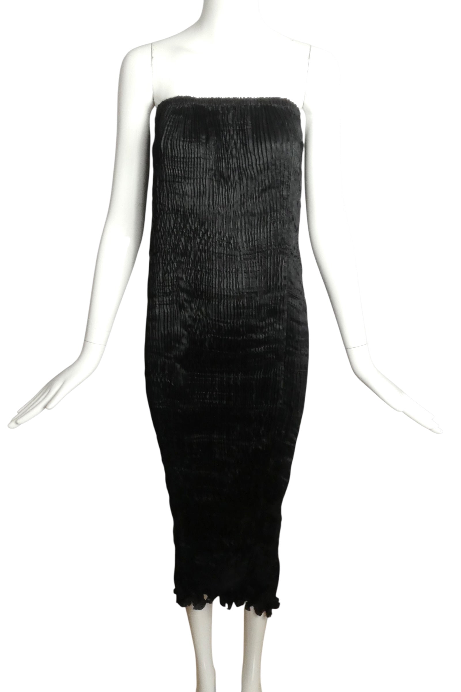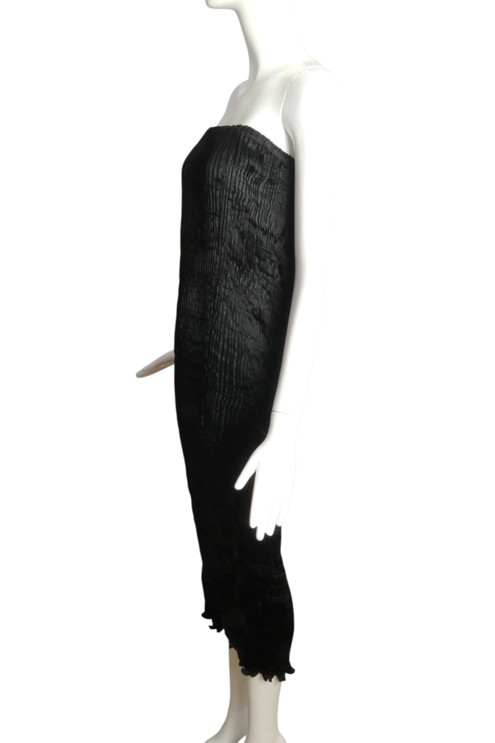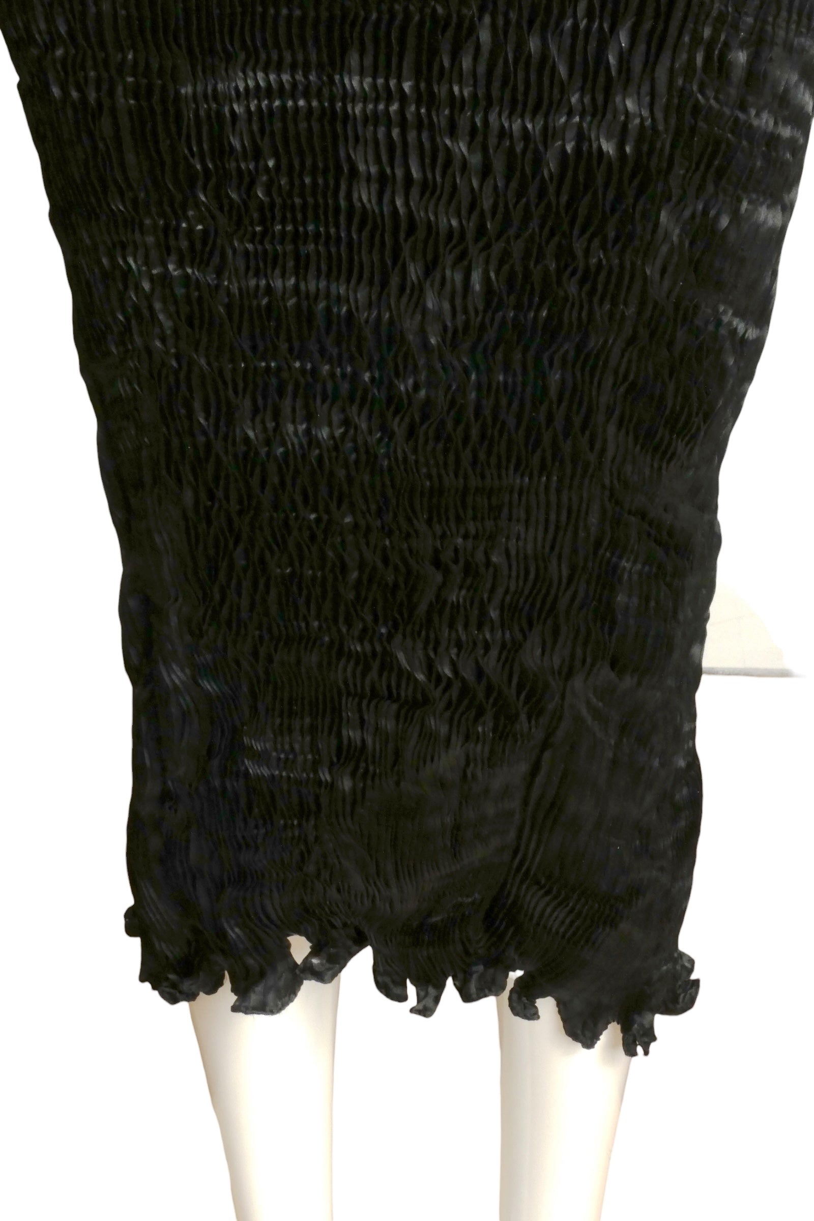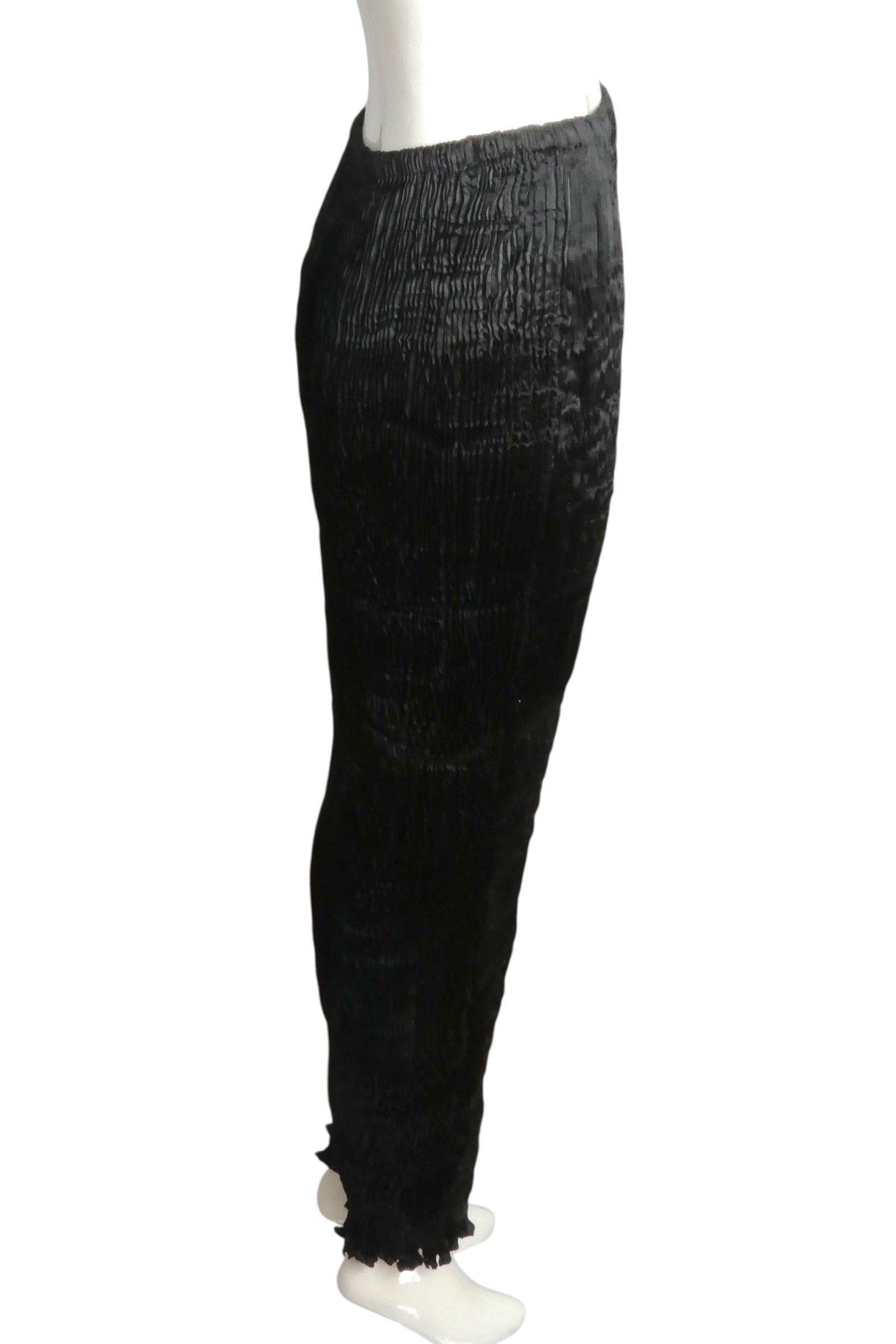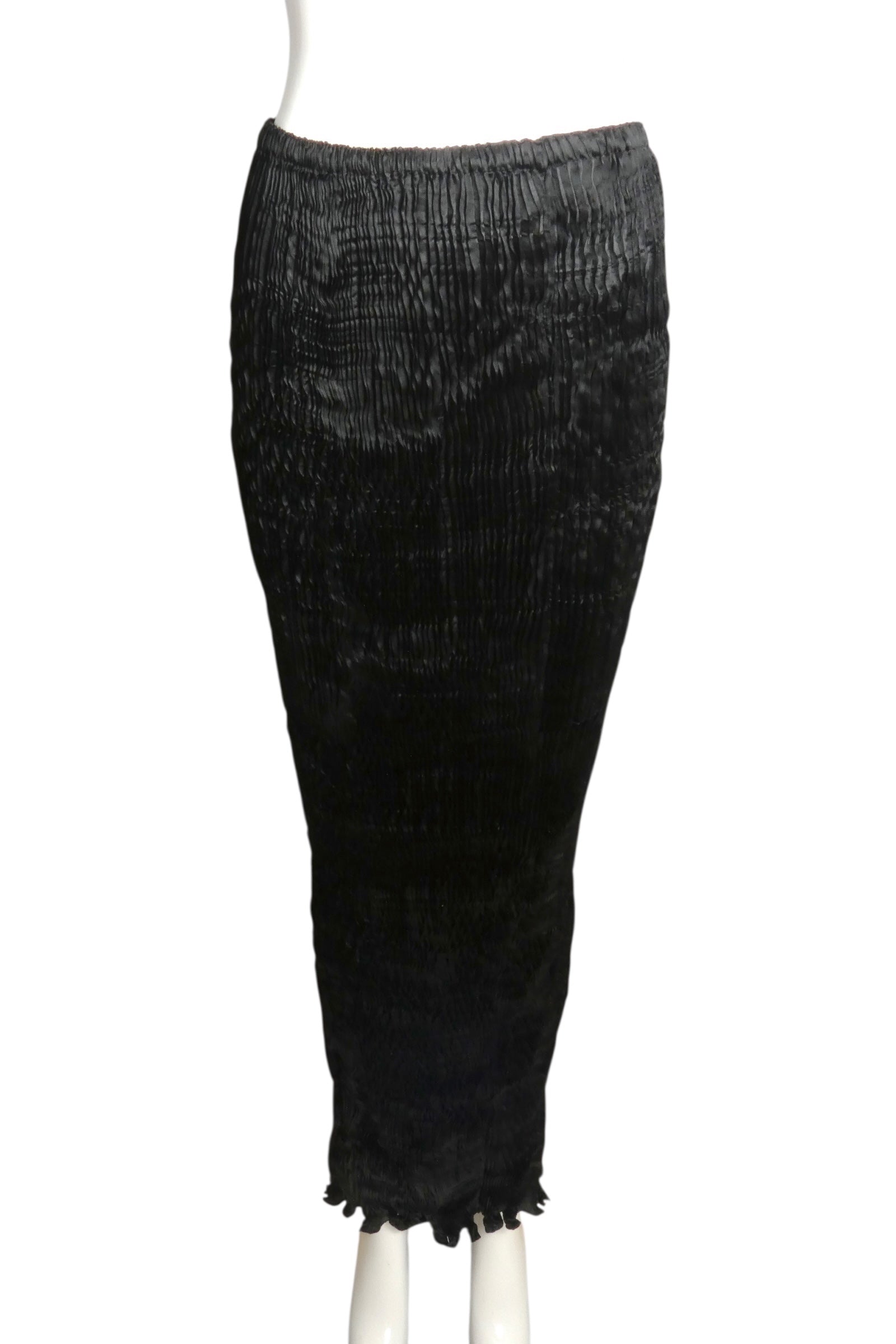 Description: Channeling the legendary Fortuney aesthetic, Charles and Patricia Lester showcase their mastery of plissé pleating in this exquisite silk skirt. The elastic waistband allows for effortless wear while the fabric drapes elegantly along a slender silhouette, culminating in a delicate self-ruffle at the hem. A testament to meticulous craftsmanship, this 1980s piece arrives in its original drawstring bag—a protective cocoon befitting such refined artistry.