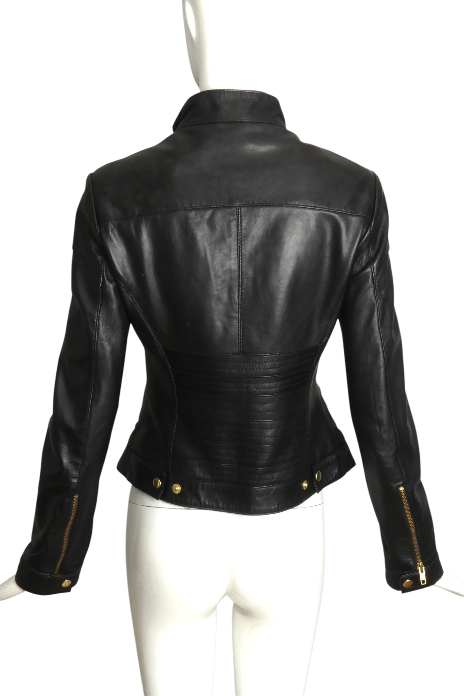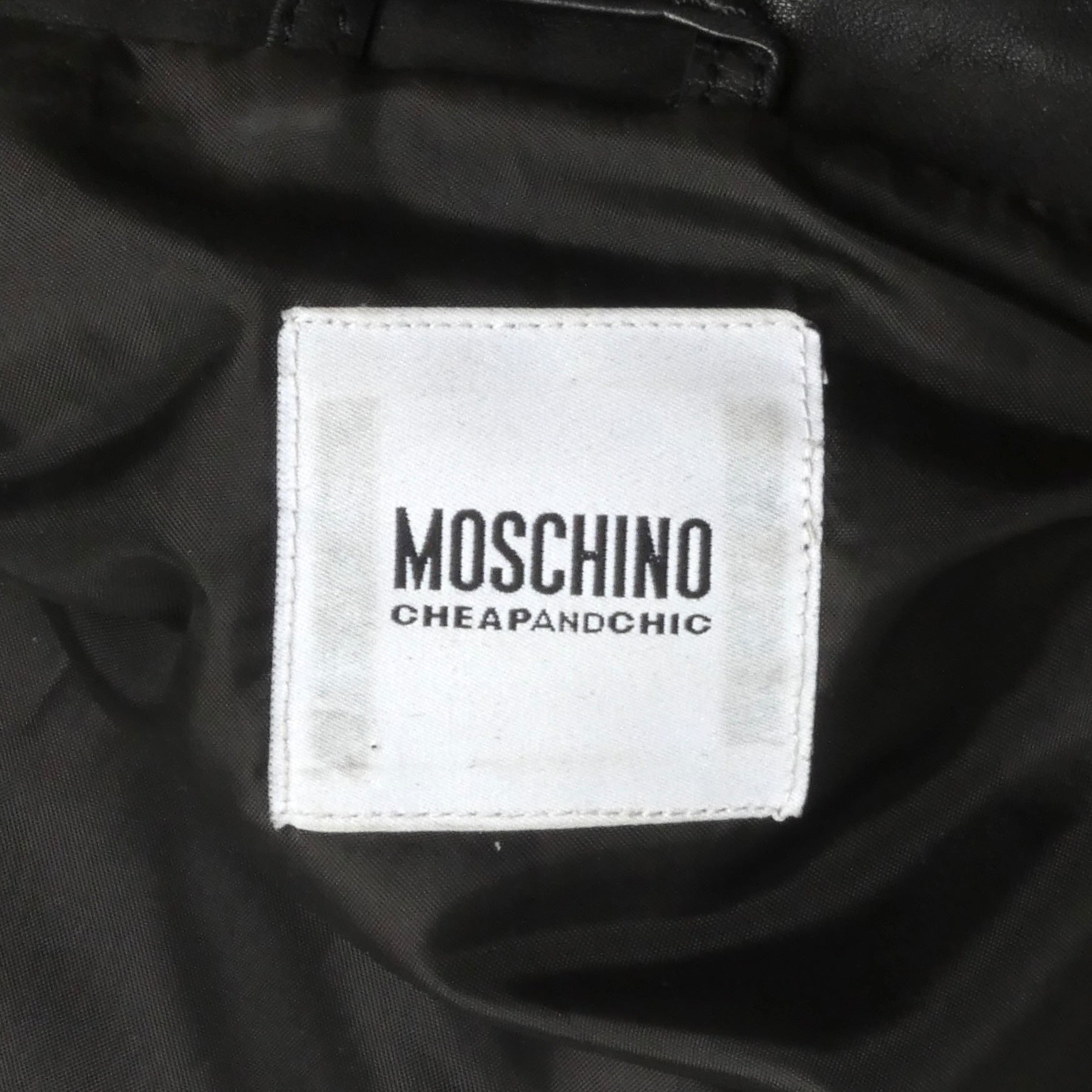 Description: Experience refined edge with this CHEAP & CHIC by Moschino black leather moto jacket, size 6, brand new with tags. Crafted from exquisitely soft, buttery leather, it features a sleek snap-closure neck band and a front zipper accentuated by stylish ruffles along each side. Functional diagonal zippered pockets provide secure storage, while long sleeves end with zip and snap-cuff details for a tailored finish. This jacket perfectly melds classic moto design with feminine flair, offering both luxury and versatility at a remarkable value.