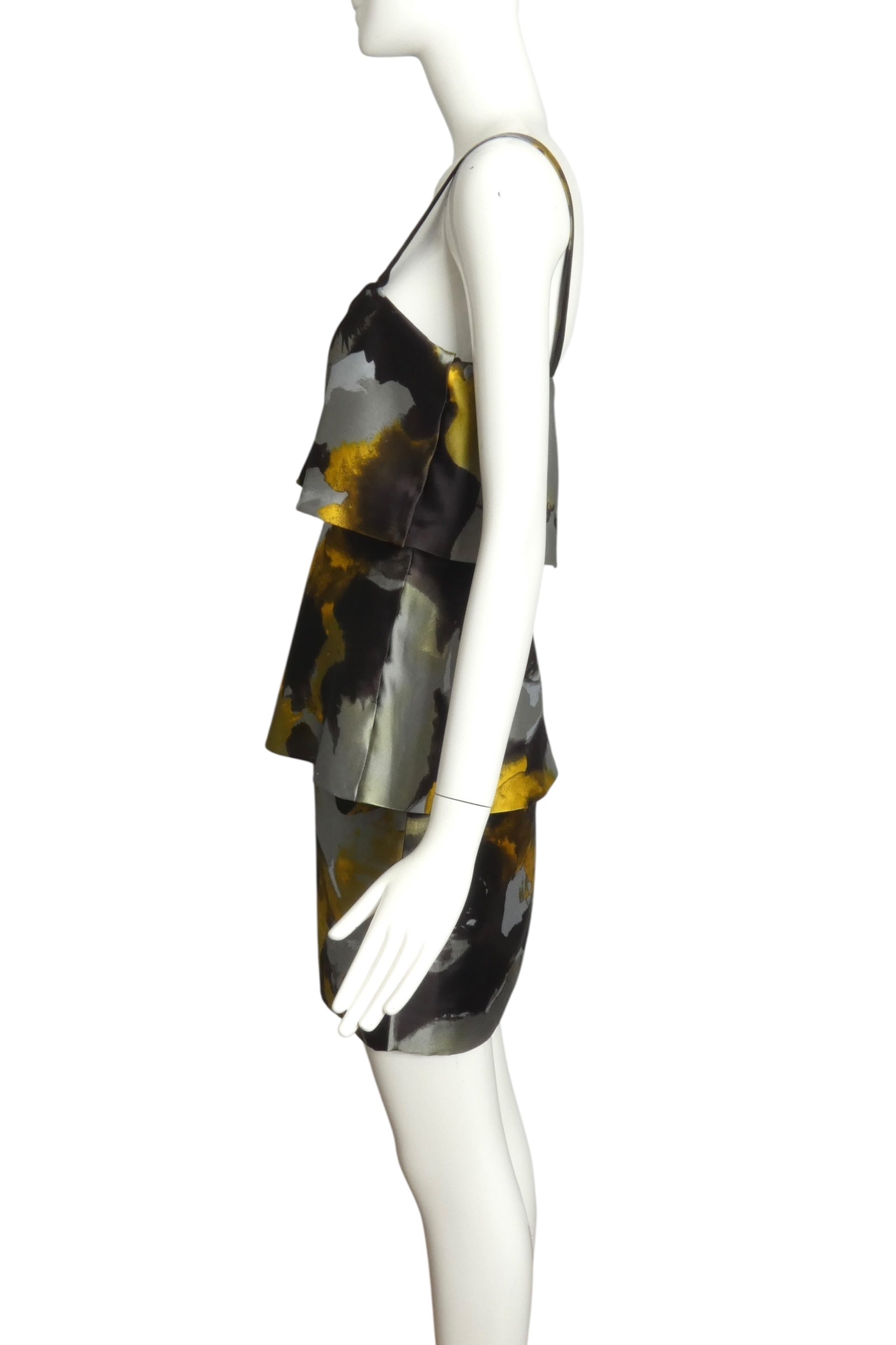 Description: This CHEAP & CHIC MOSCHINO dress features a printed silk twill fabric with expertly crafted bias tiered ruffles that elegantly cascade around the body. The dart-fitted silhouette enhances the natural shape, while wide shoulder straps provide comfortable support. Perfect for summer, this dress combines refined design with ease, making it a standout piece for stylish, warm-weather occasions.