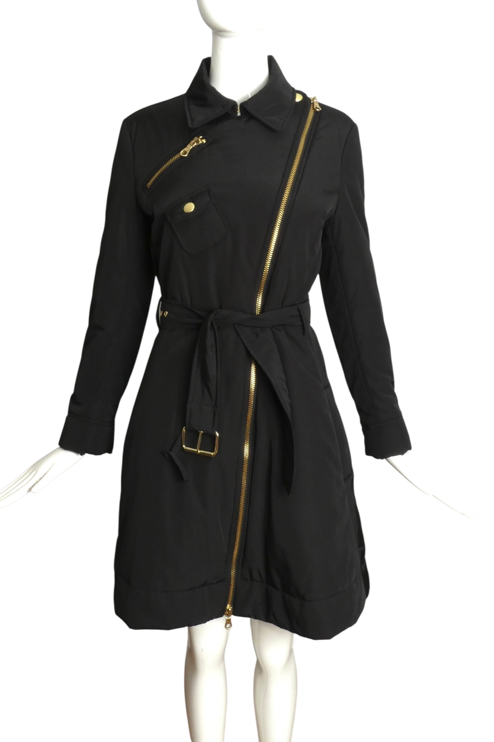 Description: Stay warm this winter without sacrificing style in the CHEAP & CHIC MOSCHINO black puffer coat. Featuring a unique diagonal zipper from left shoulder to right hem, a handy zippered chest pocket, and a snap-closure breast pocket, this coat blends function with flair. The matching belt cinches your waist for a chic silhouette. Brand new with tags and priced at $895, it's a trendy statement piece you won't want to miss!