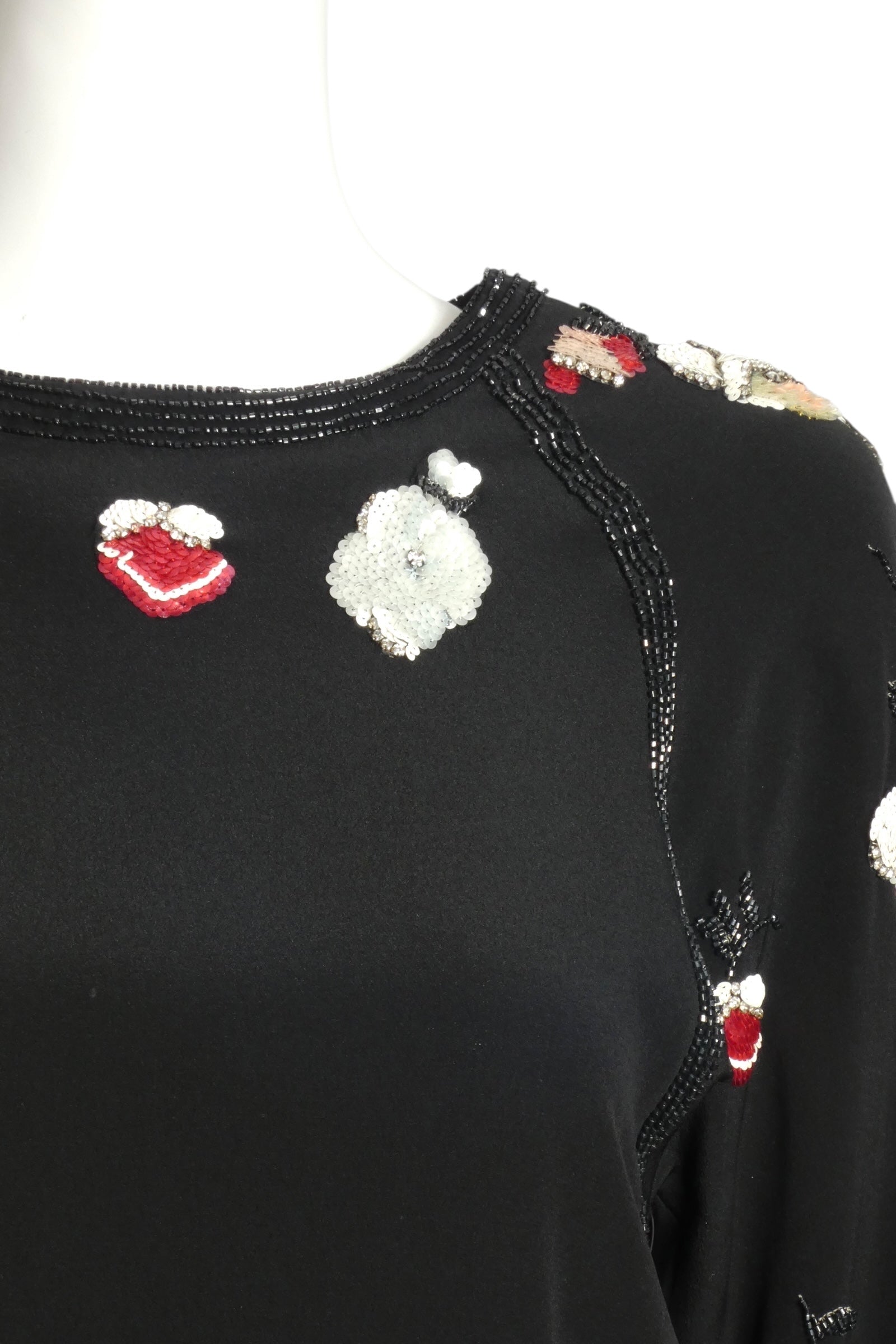 Description: This exquisite 1980s Chloé blouse exemplifies the opulent design sensibilities of the era. Crafted from luxurious black silk, the piece features distinctive raglan sleeves and a structured taffeta peplum designed to be tucked at the waist for a refined silhouette. The blouse's true artistry emerges through its dimensional floral embellishments—meticulously adorned with sequins, intricate beading, and luminous rhinestones that create movement and depth. Each petal appears to dance with light, capturing the sophisticated glamour characteristic of high-end 1980s couture. A remarkable investment piece for the discerning vintage collector.