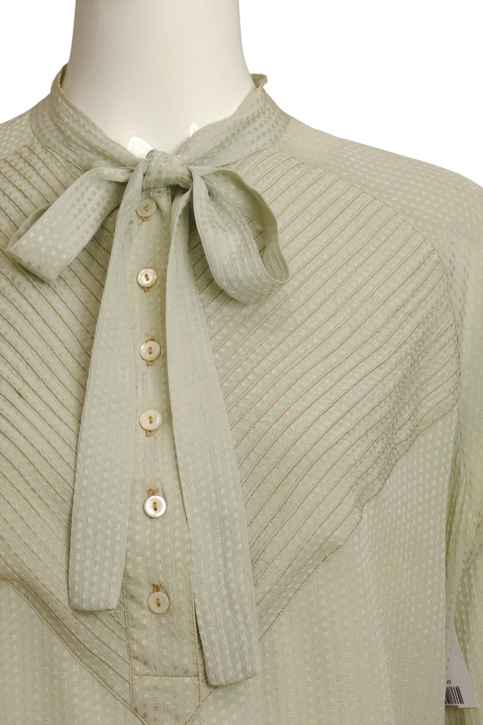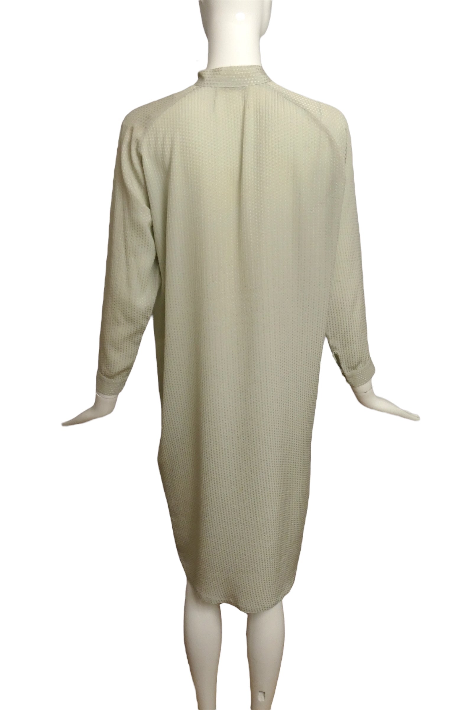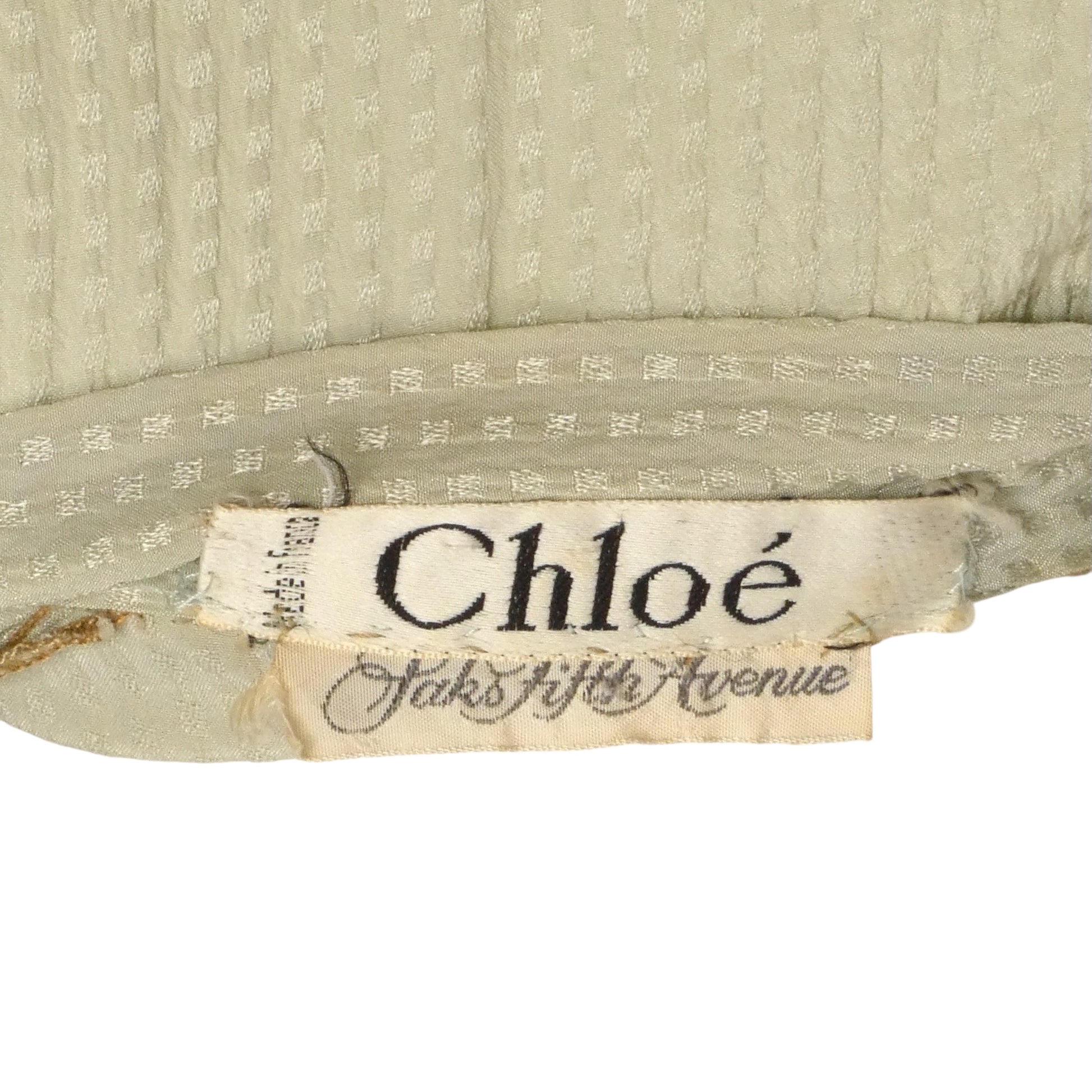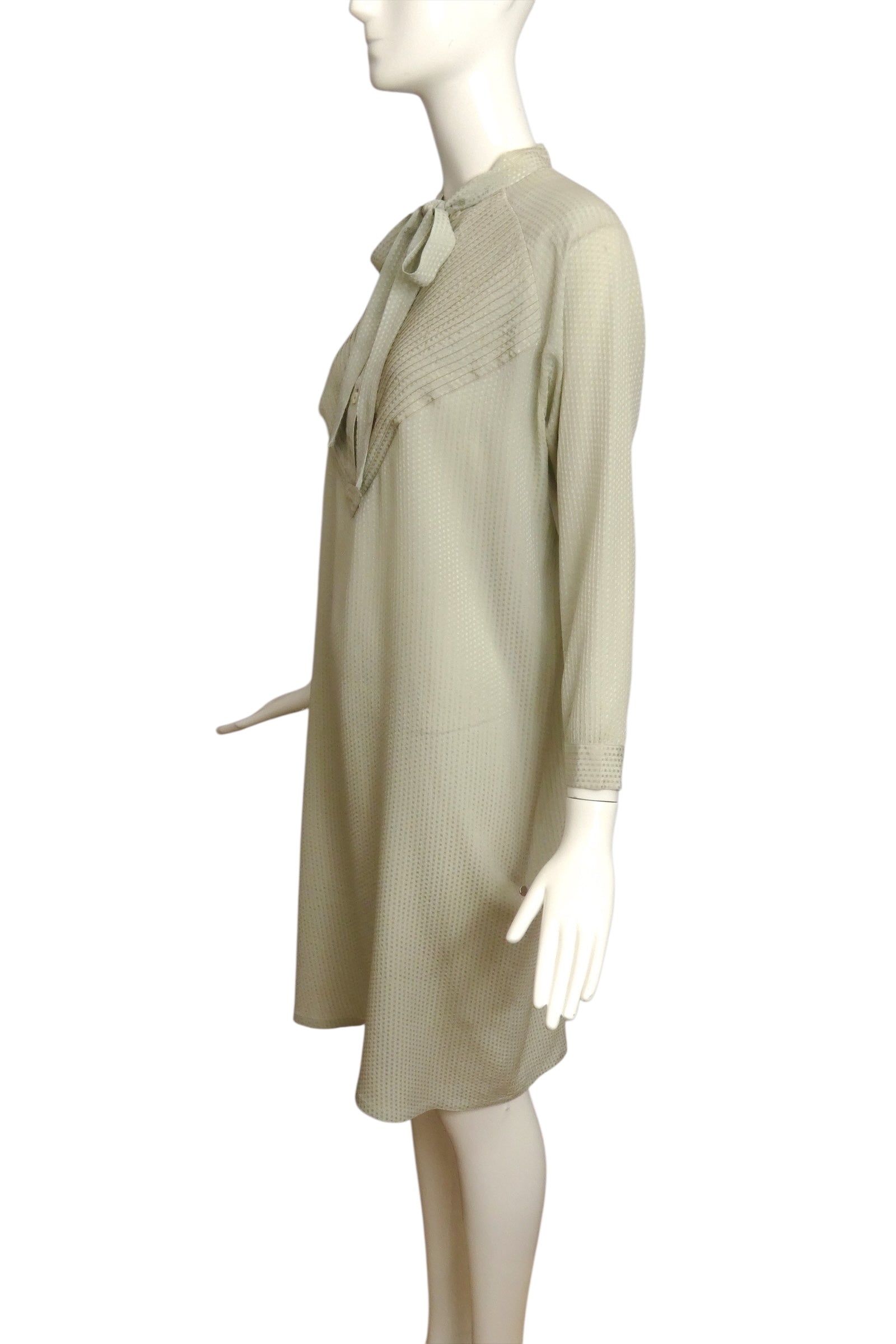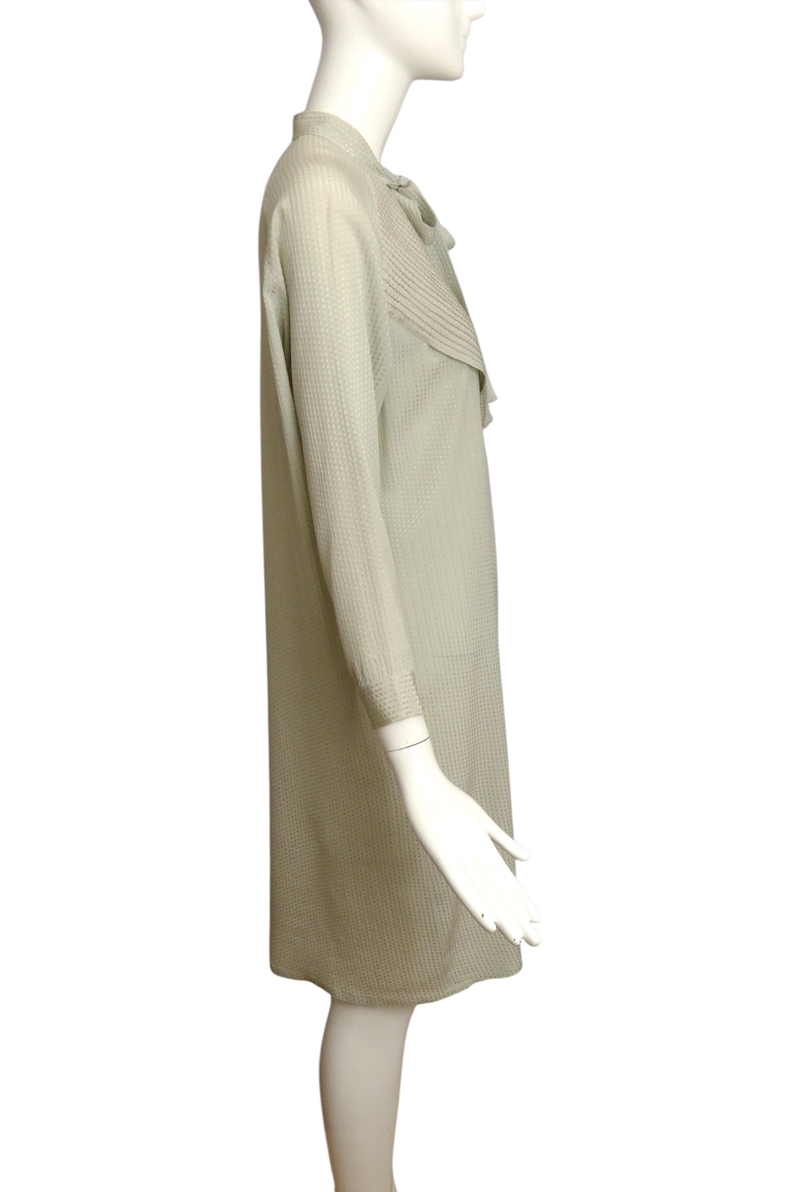 Description: This 1980s Chloe dress in tissue silk brocade shifts from grey to a hint of green depending on the light. It features a pin-tuck front yoke, button closures down the front, and a charming neck tie. The long sleeves finish with buttoned cuffs. Add your favorite belt to turn it into the perfect playful summer outfit.