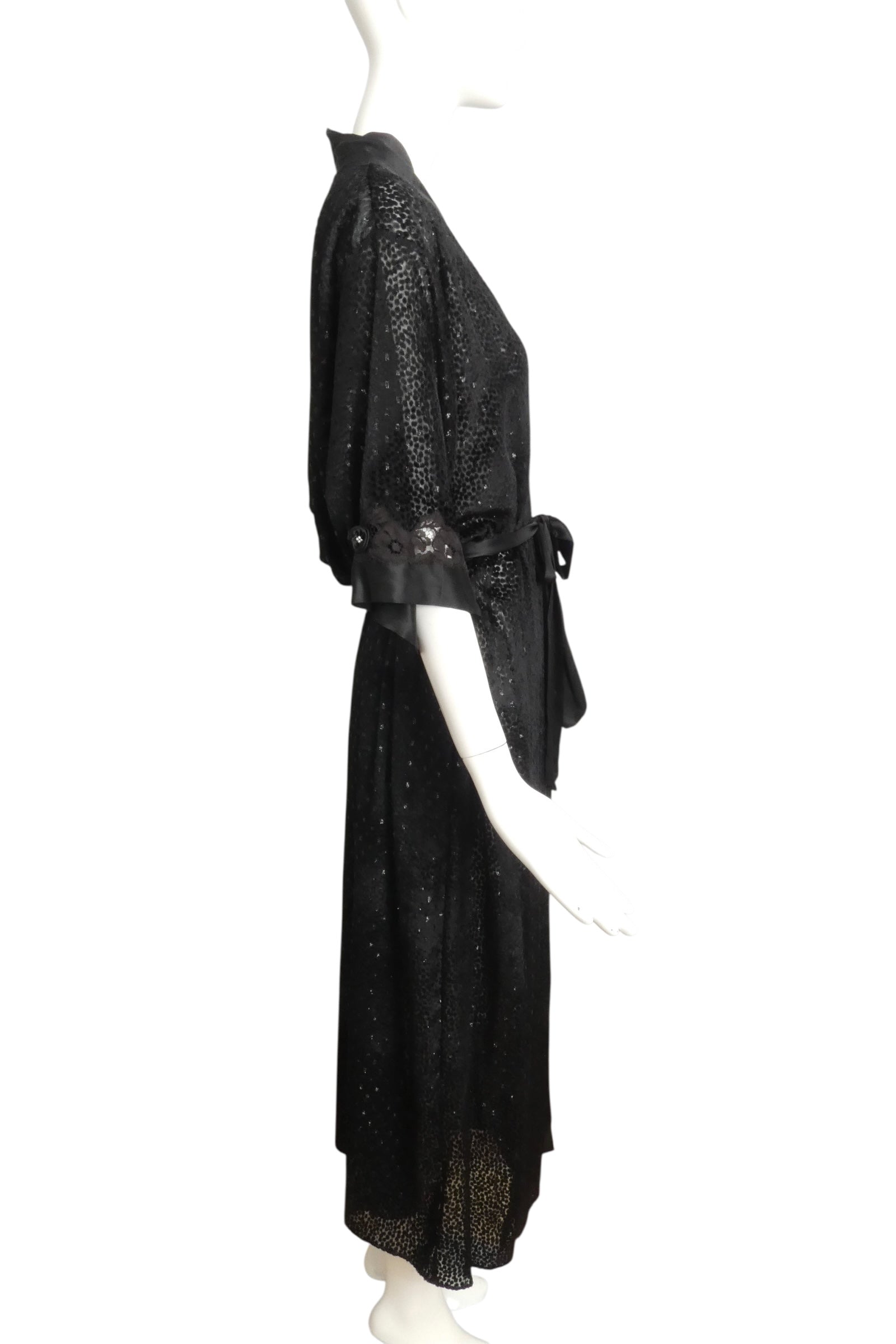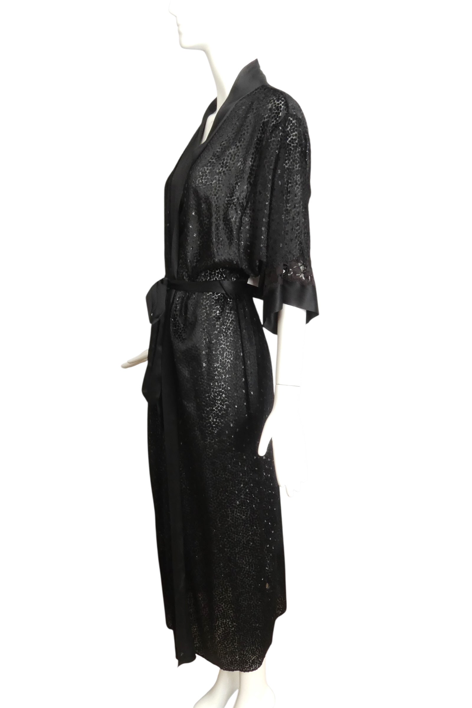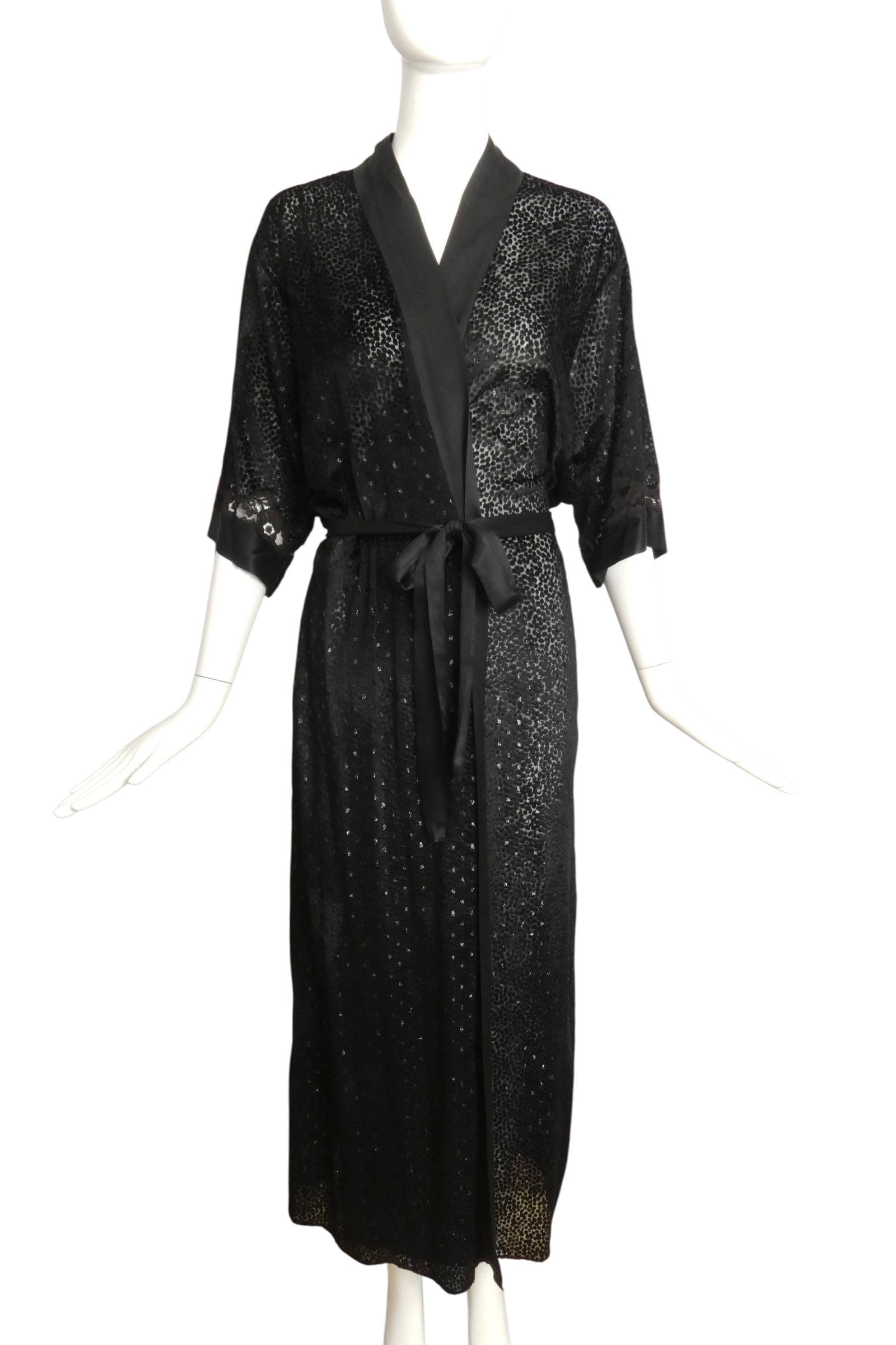 Description: Step into vintage glamour with this 1980s Christian Dior black robe! Made from plush voided velvet with playful metallic black lamé eyelash dots, it’s a chic twist on cozy. Satin shawl lapels and a waist sash add a flirty, elegant touch—perfect for lounging in style or turning heads at your next gathering. Size small and full of personality, this robe is your new go-to for effortless sophistication with a wink.