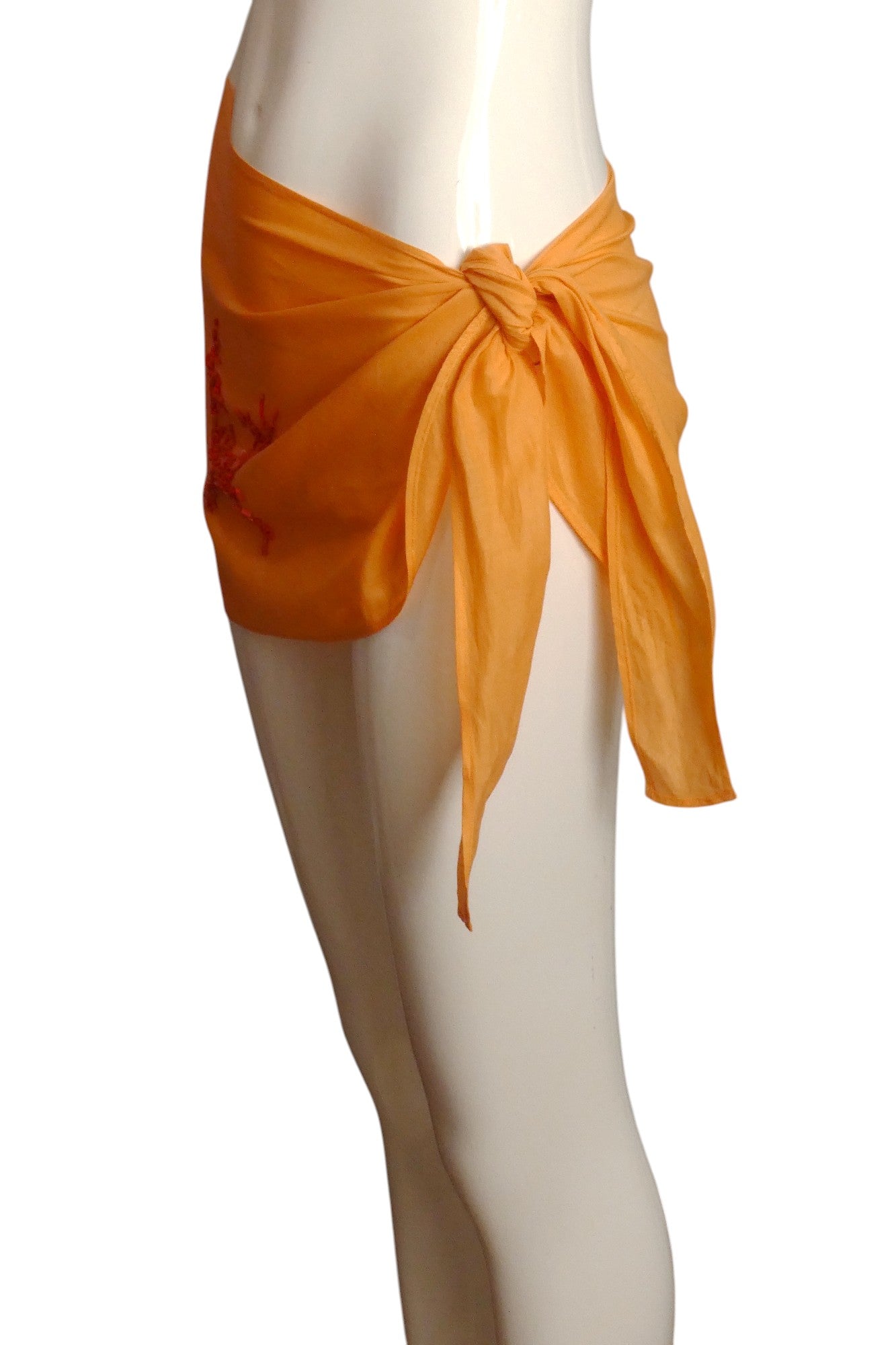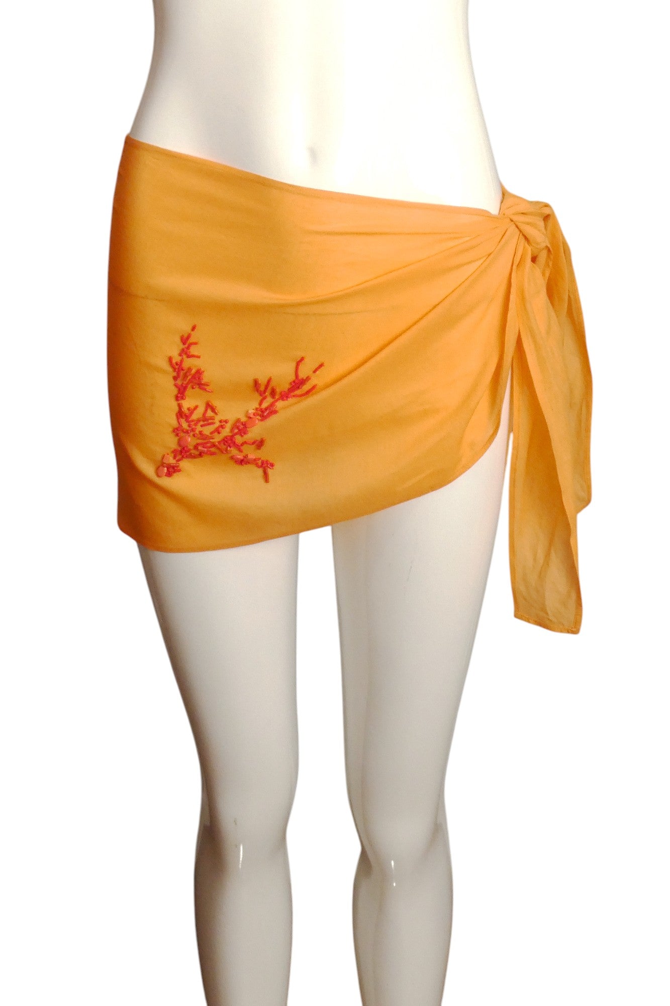 Description: Turn heads at your next beach getaway with this stunning orange batiste sarong skirt by CHRISTIAN DIOR. This swimsuit cover-up features exquisite red beaded coral embellishment on one side, creating a luxurious asymmetrical detail that demands attention. Perfect for making a stylish statement while lounging poolside or strolling along the shore!
