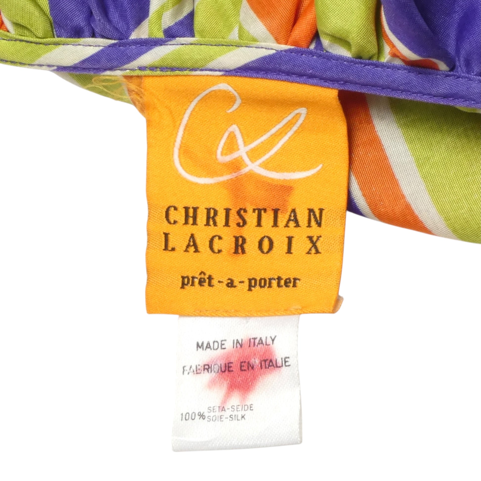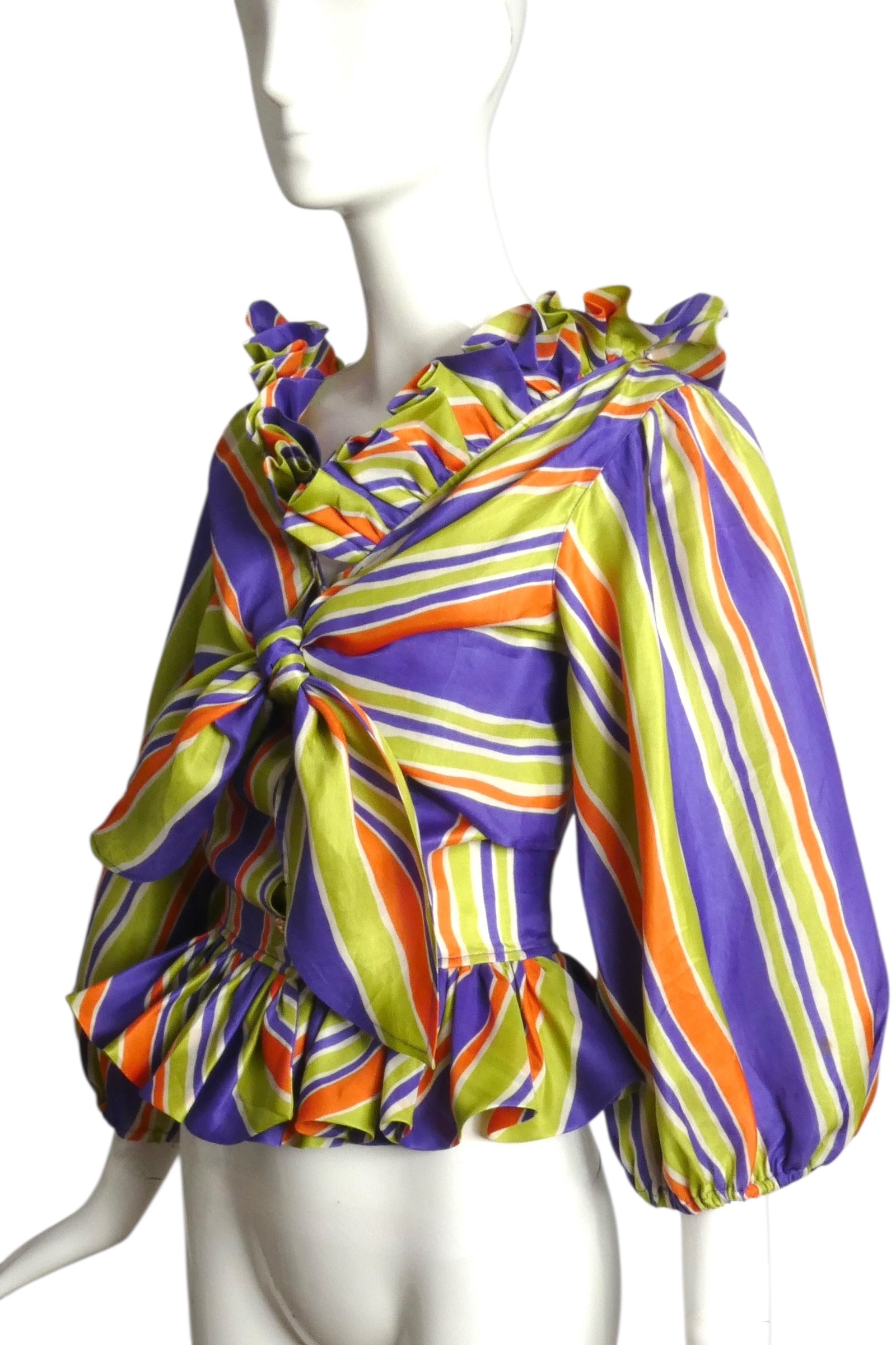 Description: A stunning example of early-90s runway, this Christian Lacroix silk blouse captures the designer's theatrical aesthetic. Crafted from lustrous striped silk gazar, it features the house's signature embellishments: button front, voluminous blouson bodice with peplum ruffle, and ruffled collar detail. The distinctive three-quarter lantern sleeves are anchored by coordinating sash ties that originate at the armholes and tie at the front, creating an architecturally sophisticated silhouette. An investment piece for serious vintage designer enthusiasts seeking authentic 1991 couture craftsmanship.