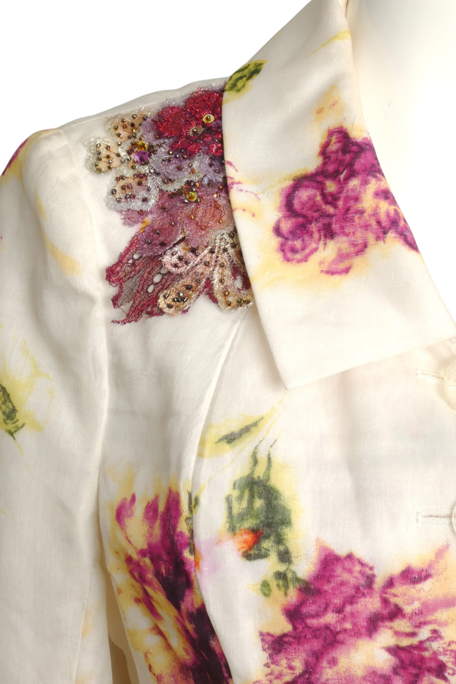 Description: A striking piece from Christian Lacroix's 1999 runway collection, this rayon blazer showcases the designer's signature maximalist aesthetic. Rendered in crisp white with an intricate floral pattern, the jacket features a dramatic oversized platter collar and sculptural three-dimensional beaded flower appliqués adorning the right shoulder. Dart-fitted silhouette with three-quarter sleeves and decorative acrylic flower button at the neckline, complemented by round acrylic buttons down the front. A refined statement piece that captures the opulent spirit of late-90s haute couture.