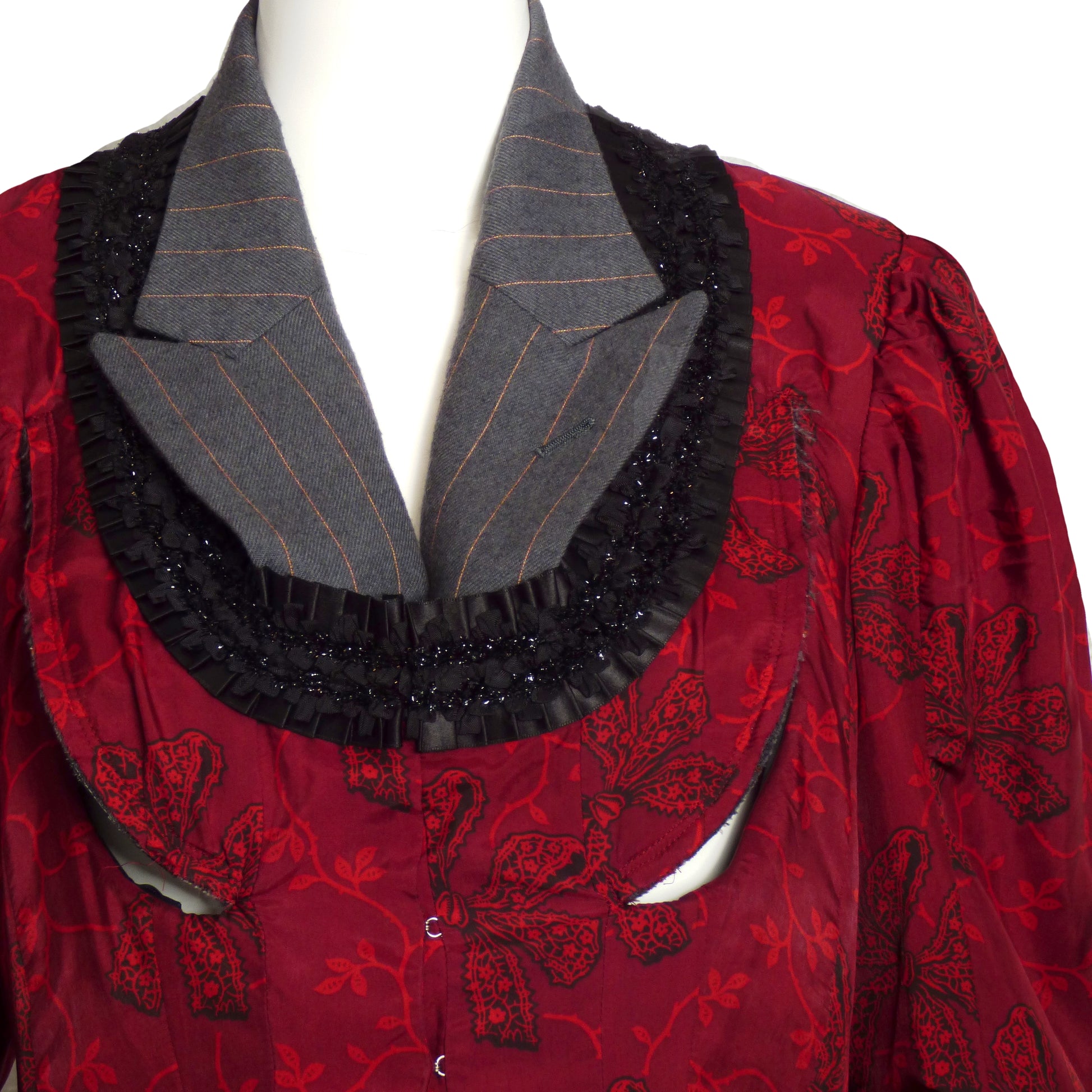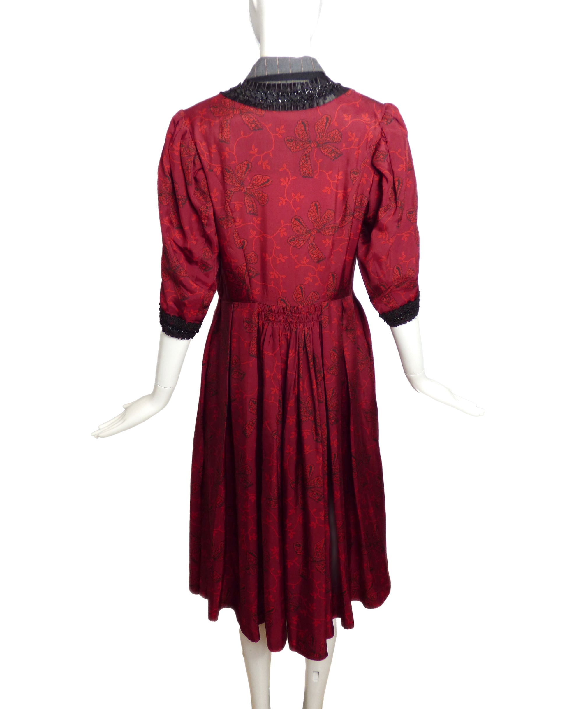 Special Features: Victorian inspired dress in red printed sateen with a low scooped neckline and hook closures down the front. A wool pinstripe waistcoat is attached at the neckline and has a single button closure. The neckline of the dress is trimmed in jet bead trimming as well as the sleeve bands. Full skirt falls in pleats from the natural waistline seam. The dress was recently purchased on our shopping trip to France.