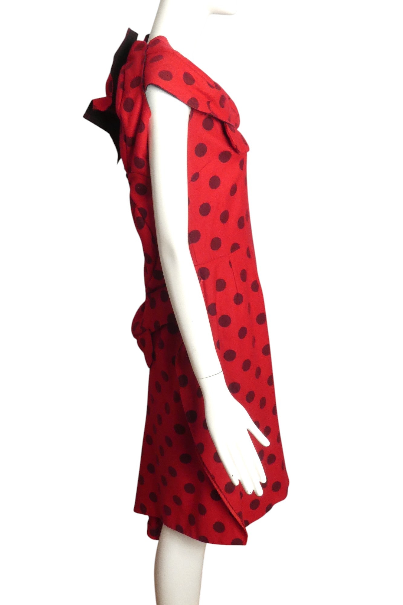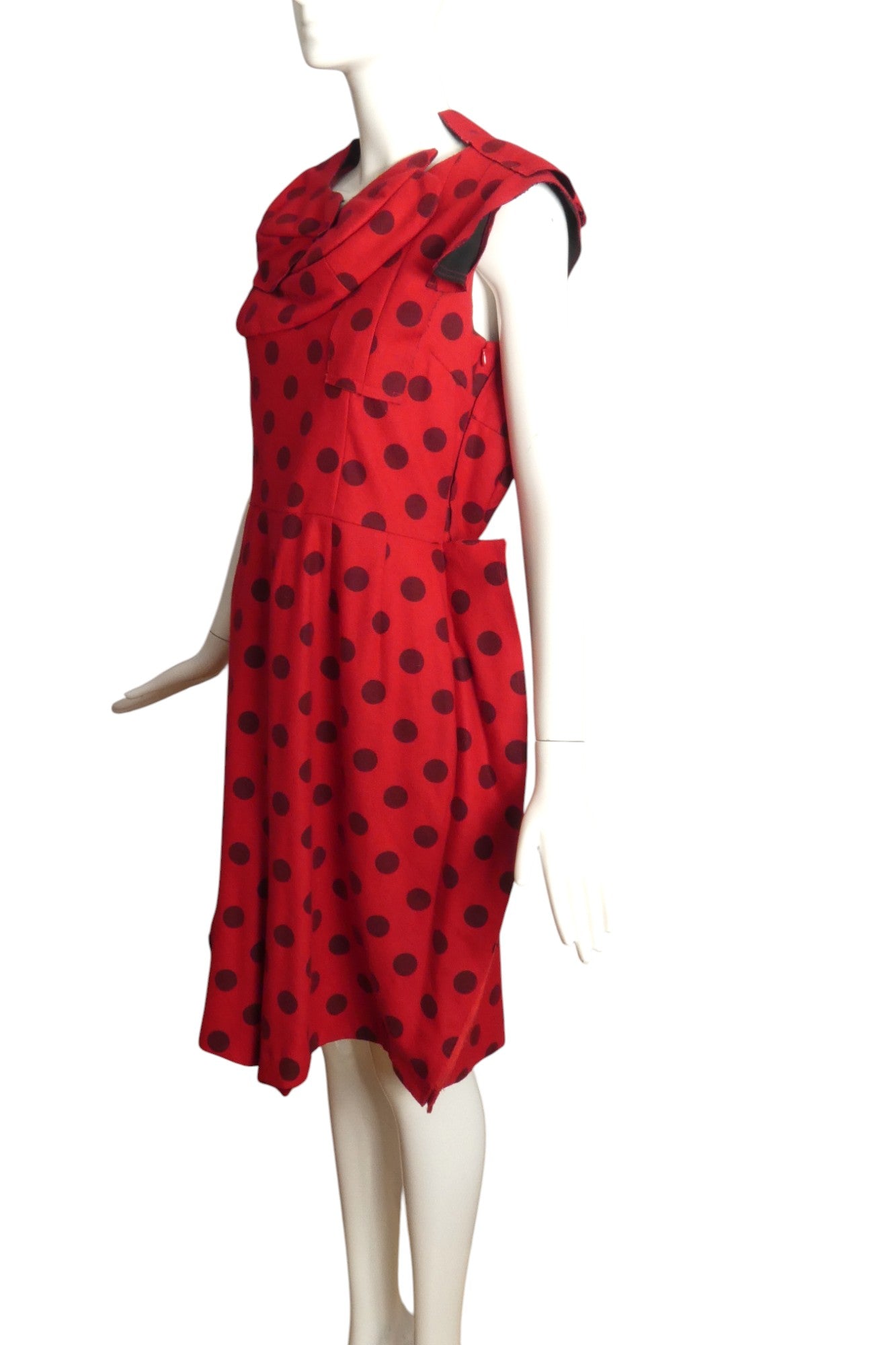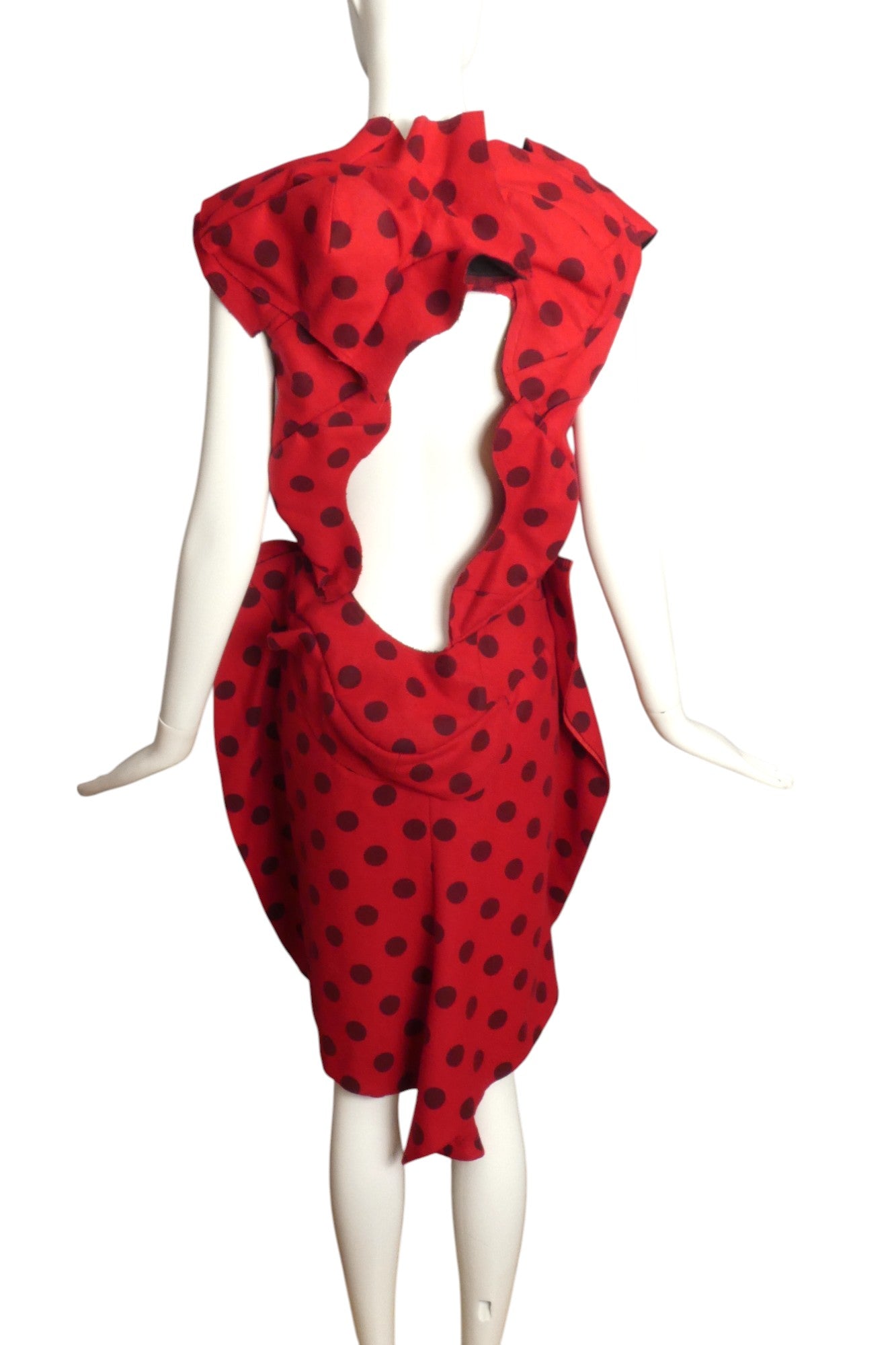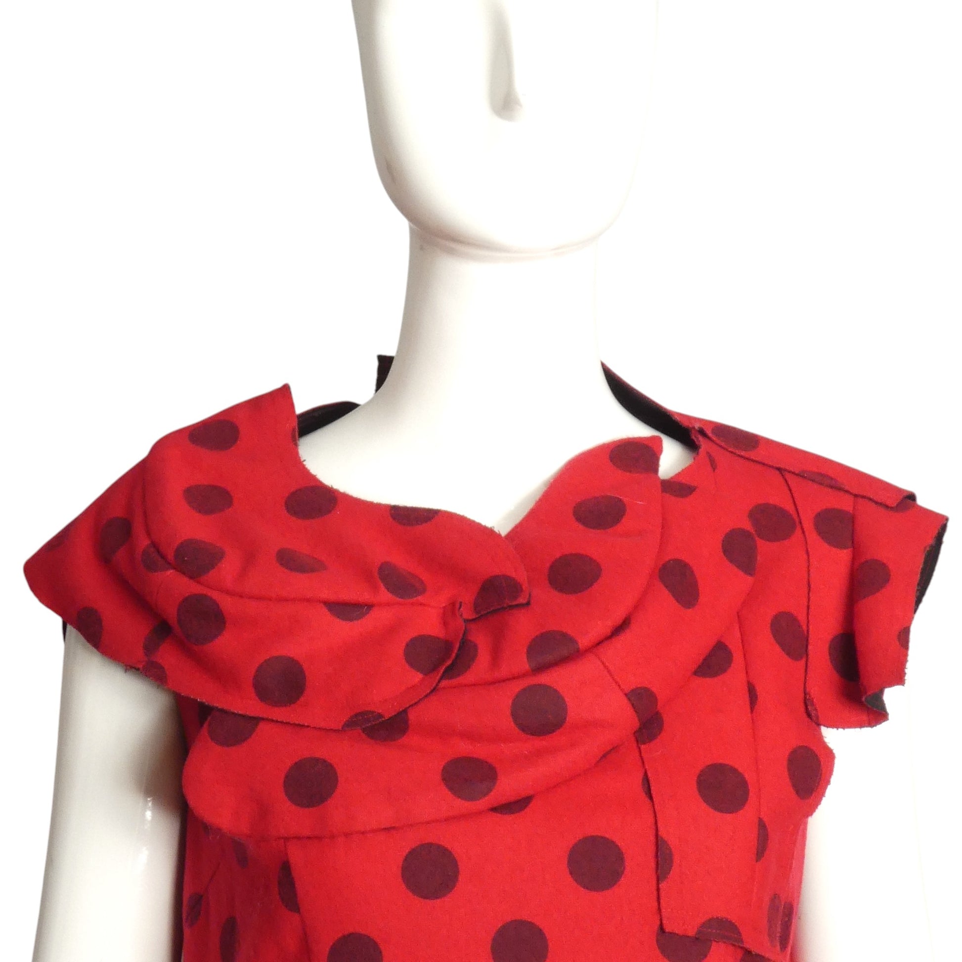 Description: Straight from the spring 2010 catwalk, this extraordinary red wool shift dress by COMME DES GARCONS captivates with its subtle black polka dot motif. The distinctive design features an innovative puffed drape encircling the neckline, complemented by a dramatic back cutout framed with sculptural appliquéd panels. The bold architectural elements transform this Size 8 garment beyond mere clothing into a wearable masterpiece that demands attention.