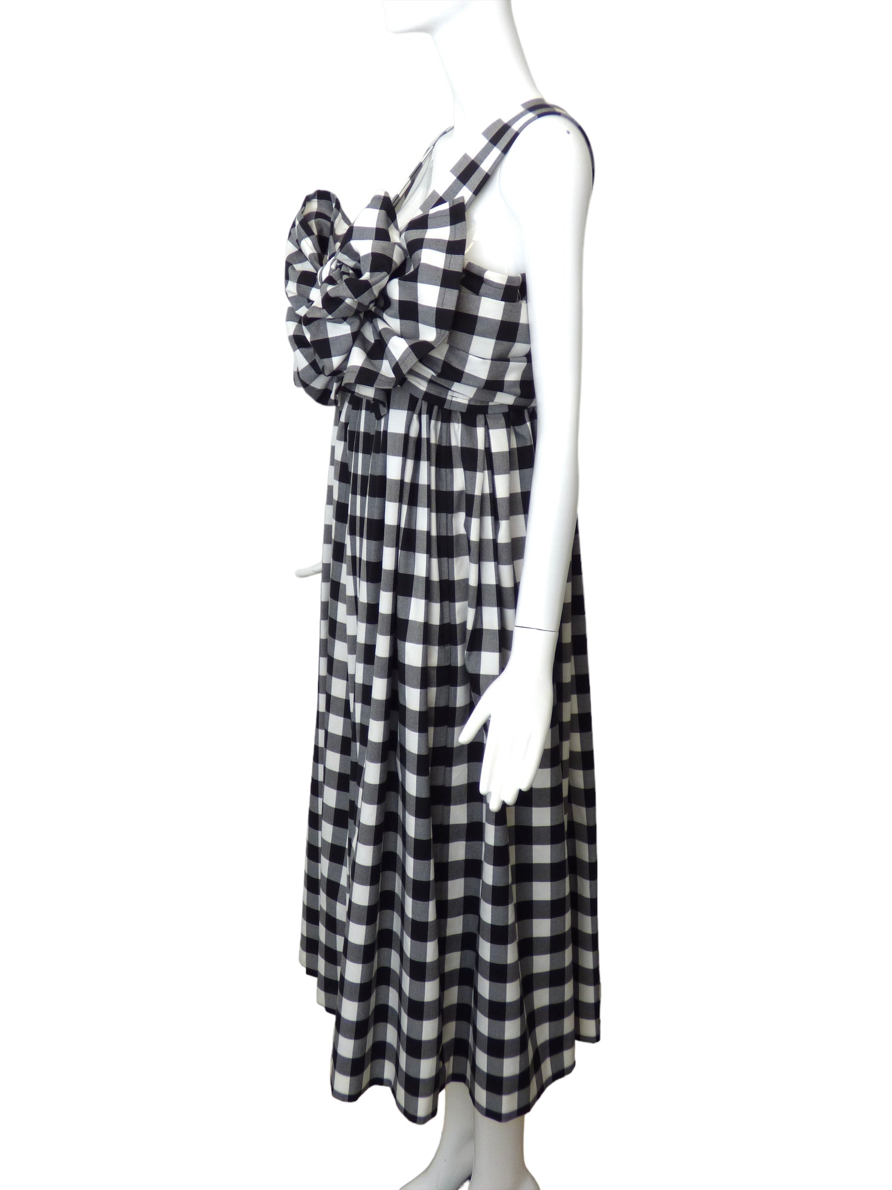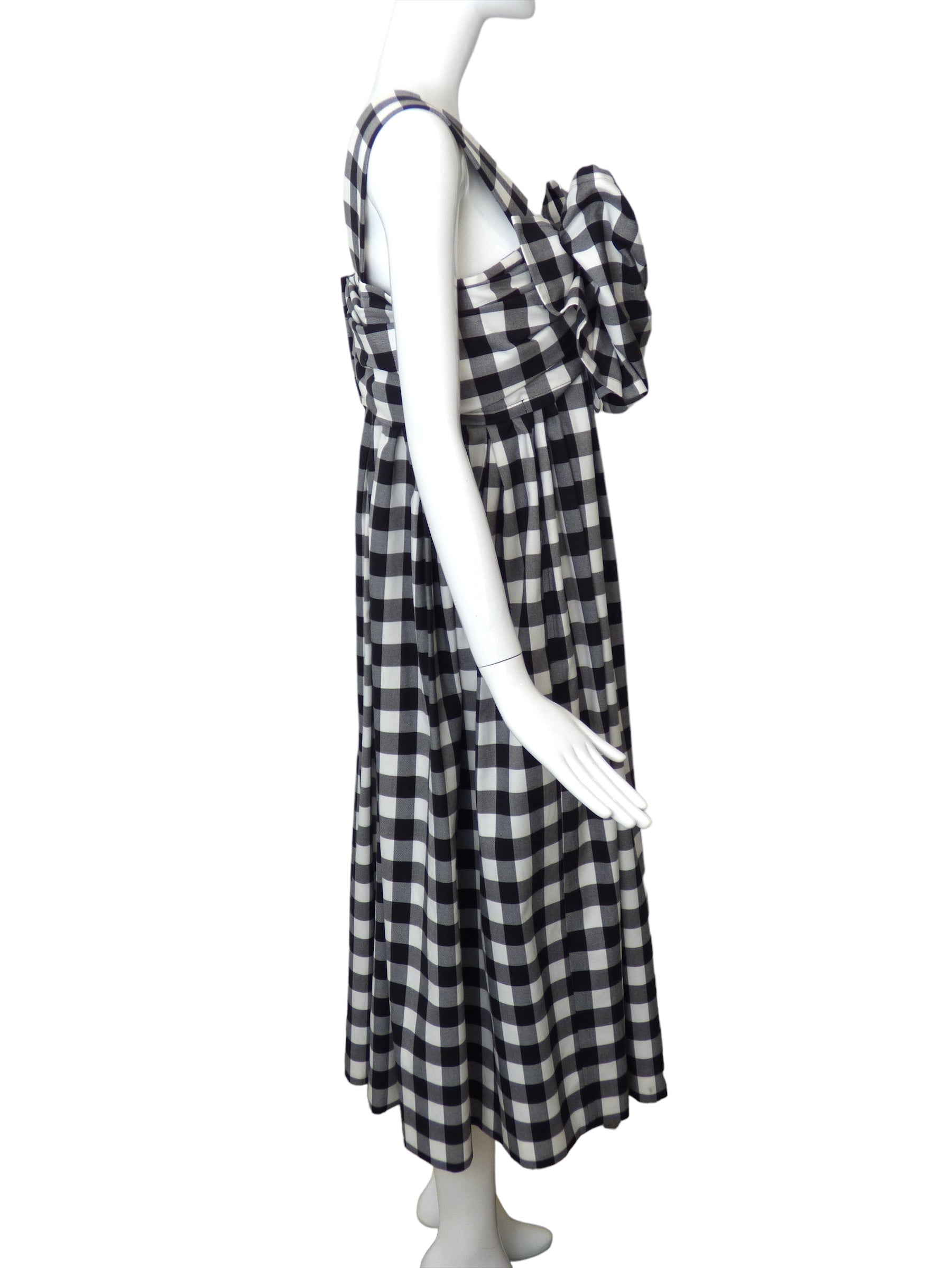 Description: This fabulous oversized dress features a classic black and white gingham pattern that will surely make a statement. With wide shoulder straps and a giant bow across the front, this dress exudes confidence and style. The full skirt, falling in pleats from the raised waistline, adds a touch of playfulness to the overall design. Complete with a center back zipper closure, this dress is sure to turn heads. Embrace its beauty and make a statement with this must-have piece!
