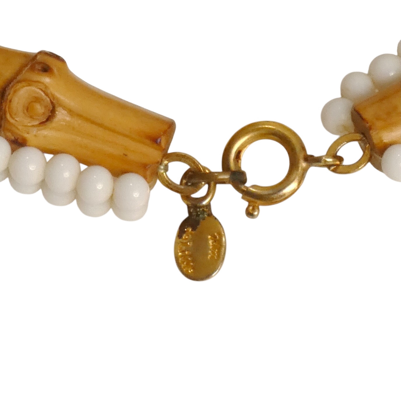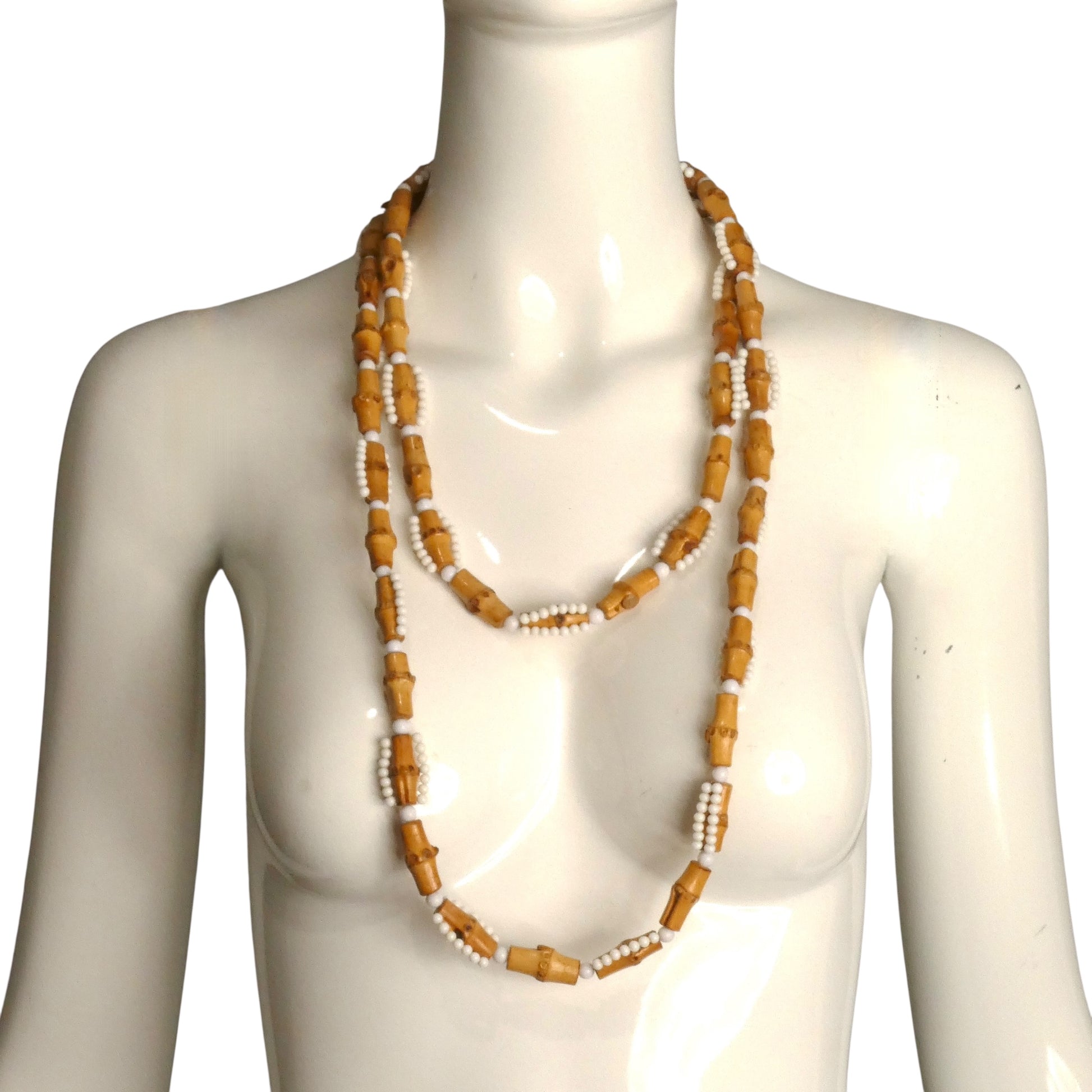 Description: This 1970s bamboo and bead necklace showcases glazed bamboo beads accented by smaller white glass beads, offering a distinctive vintage look. Designed for versatility, it can be worn long, doubled or even tripled, making it ideal for stylish summer days at the beach. Its natural materials and classic design provide both lightweight comfort and timeless appeal.