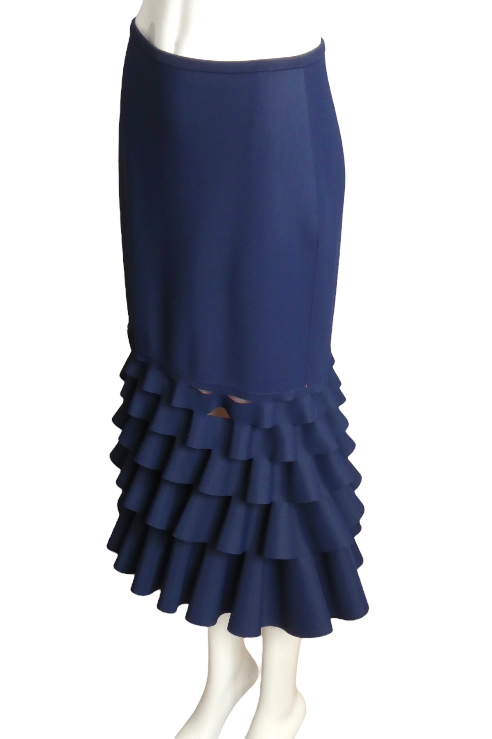 Description: This elegant navy skirt by DION LEE is crafted from a substantial knit fabric, tailored with precise darts at the hips and waist, and finished with a slim waistband. The flared lower portion features horizontal slashes that expose a vibrant pink double-faced lining, adding a captivating ruffle detail. Brand new with original tags and an initial price of $1175, this kirt delivers a striking, refined look with an innovative blend of color and design.