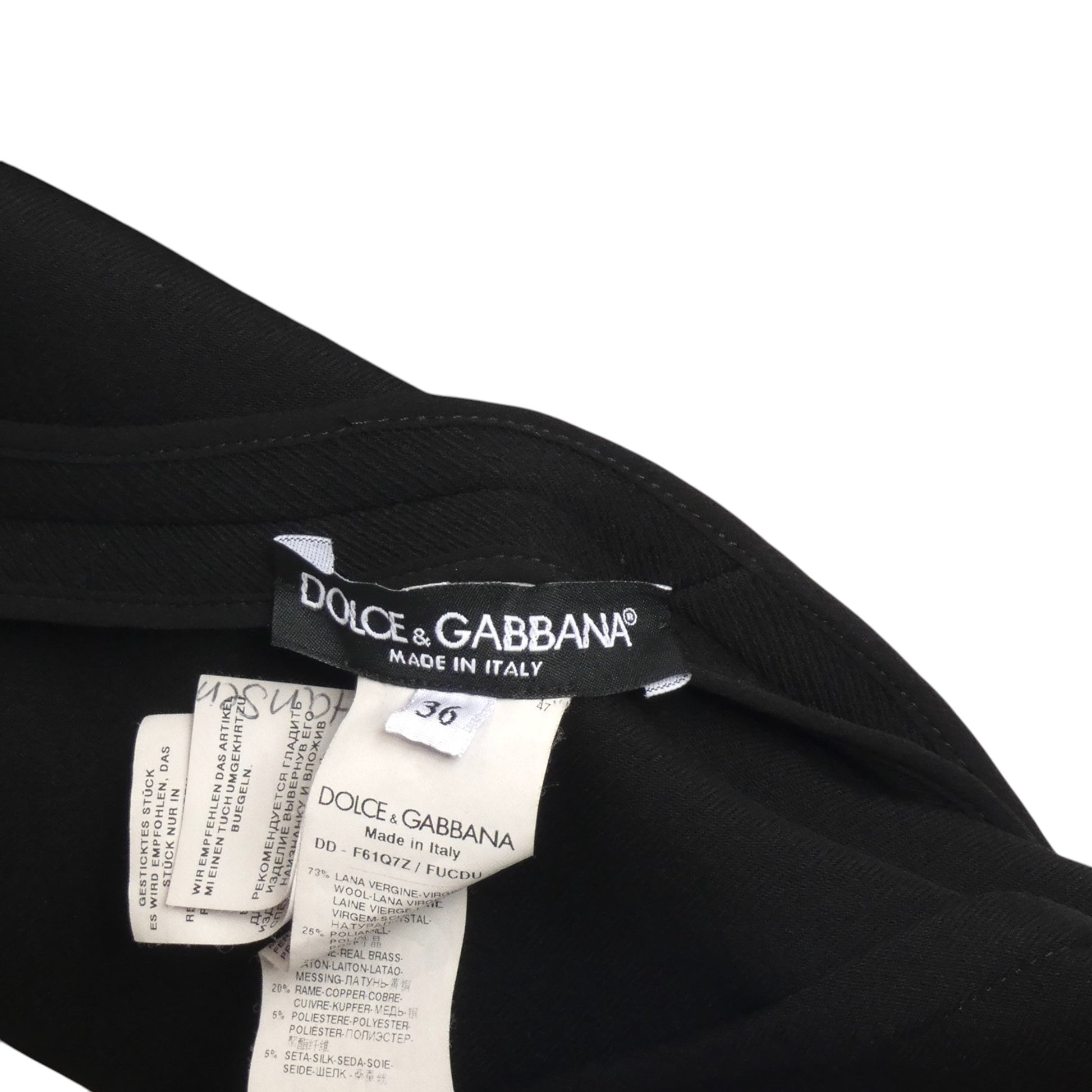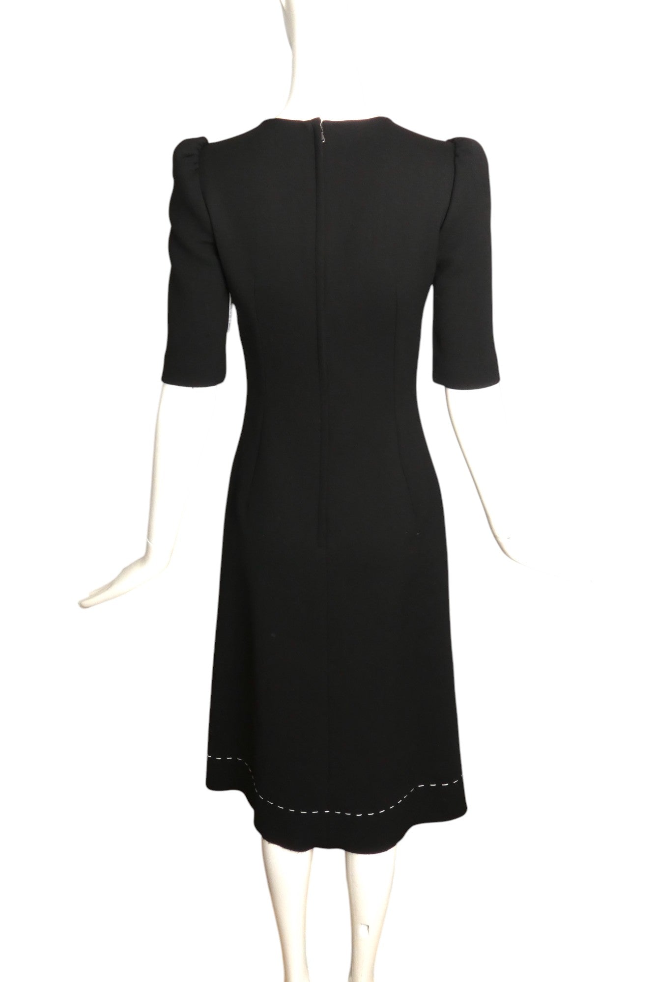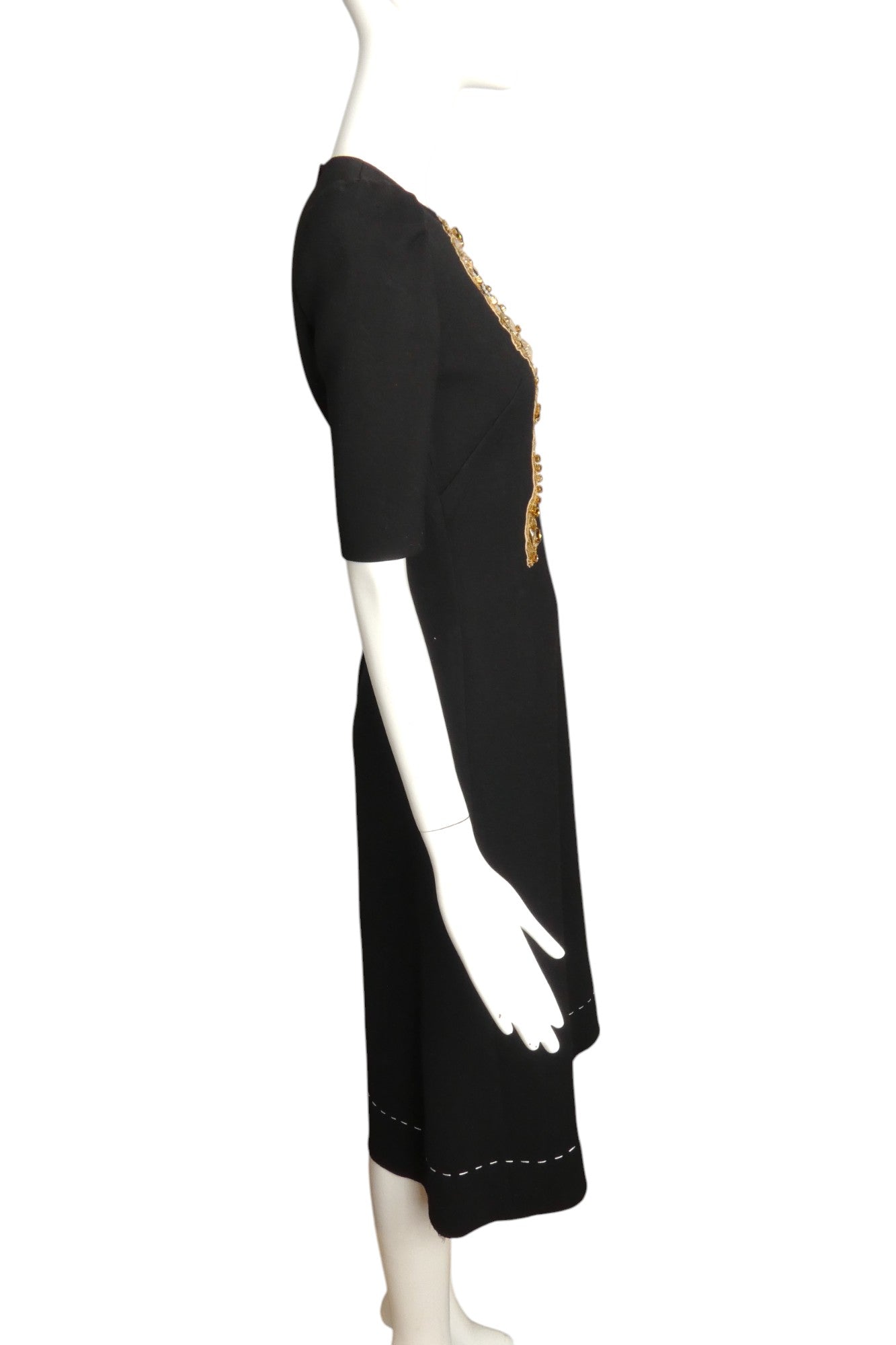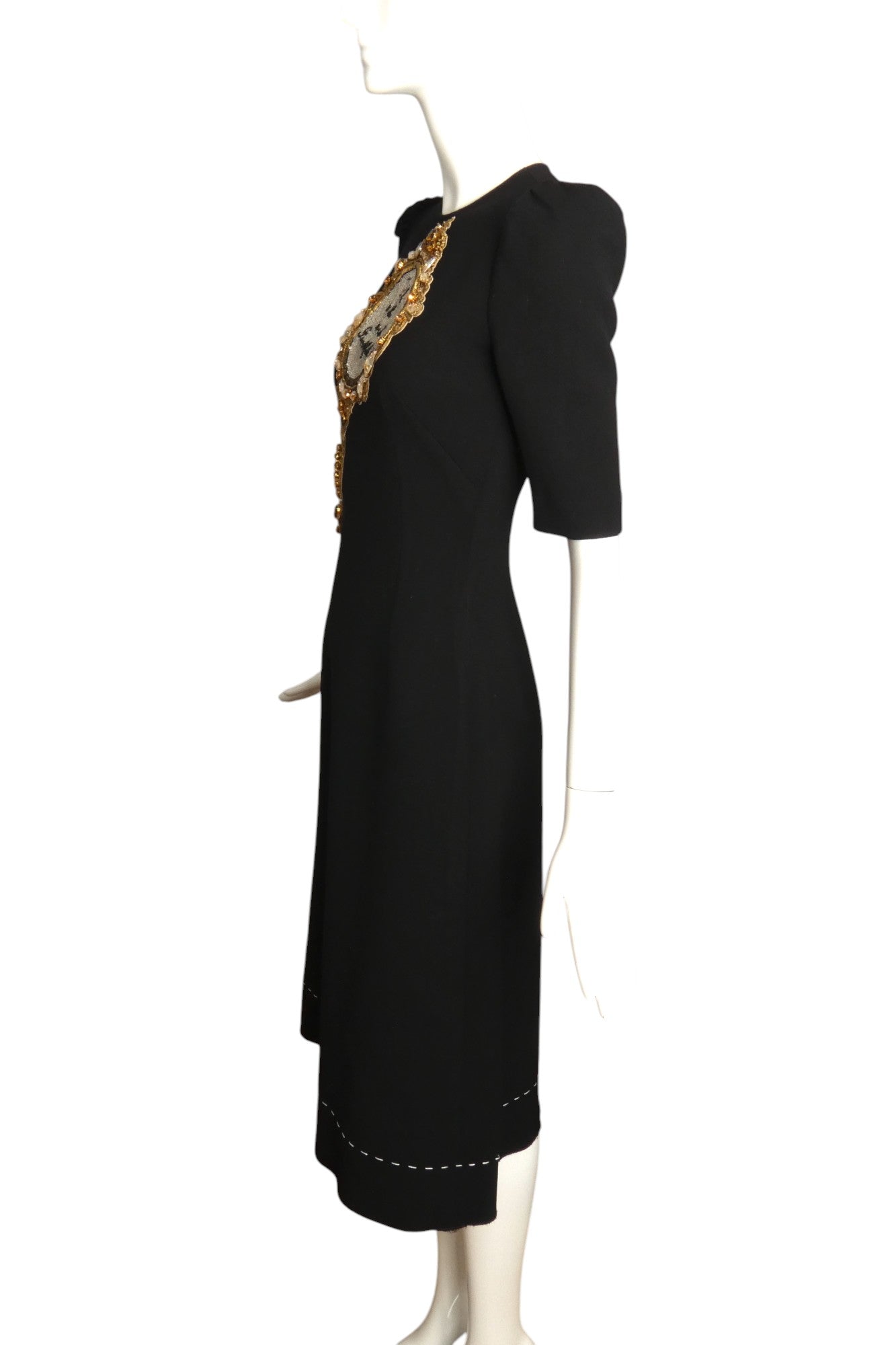 Description: Step into a world of elegance with the Dolce & Gabbana Black Wool Crepe Dress from the enchanting Fairy Tale collection. This stunning piece, showcased on the Fall 2016 runway, features exquisite gold embroidery and a captivating hand mirror sequin appliqué on the chest, adding a touch of whimsy to its sophisticated silhouette. Perfect for evening events or special occasions, this dress effortlessly combines luxury and artistry, making it a must-have addition to your wardrobe. Embrace your inner fairy tale and make a statement that is both timeless and unforgettable.