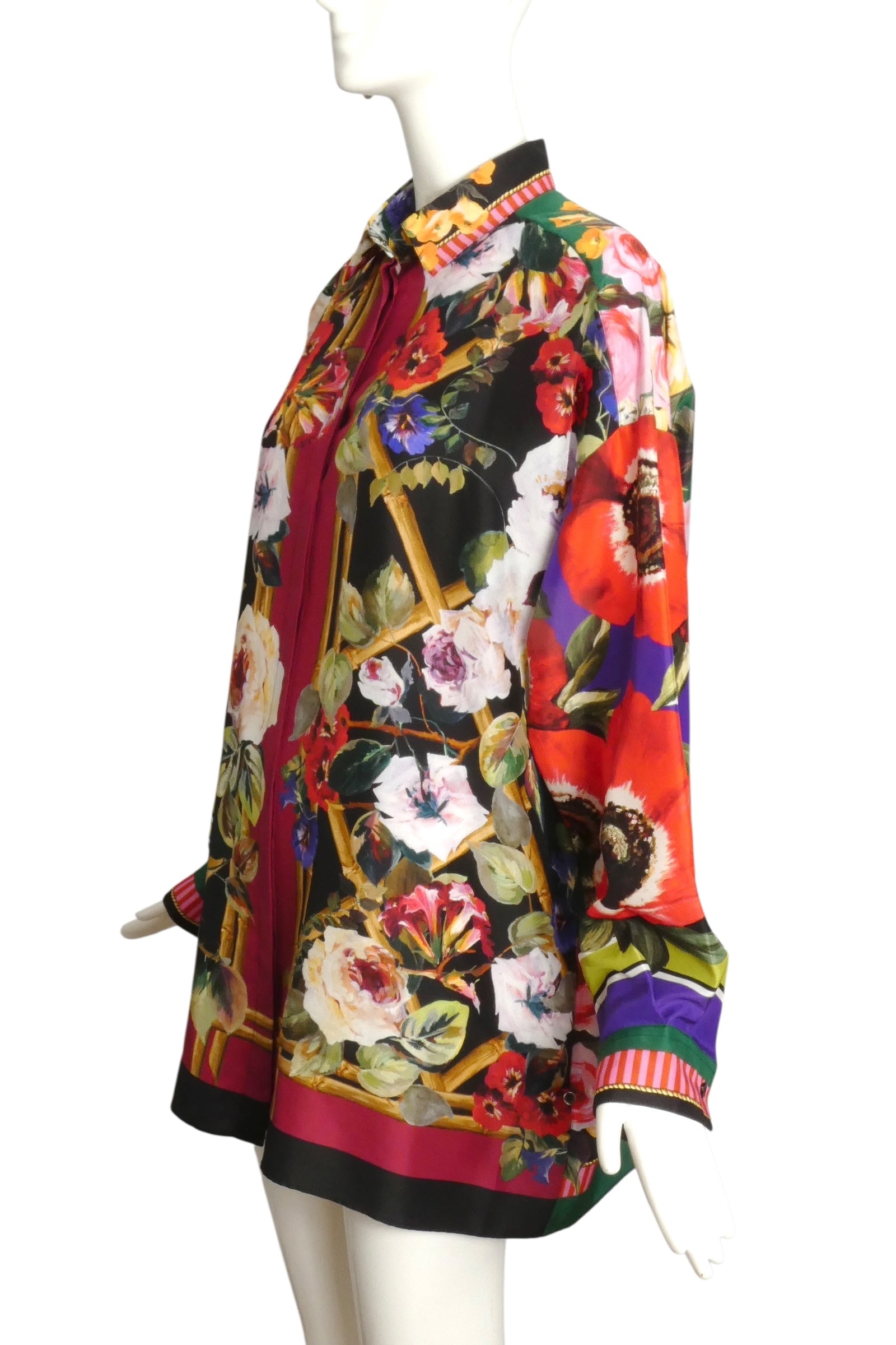 Description: This Dolce & Gabbana oversized silk blouse brings a touch of Italian artistry to your wardrobe with its delicate floral design. Crafted from light, breezy silk, it features a charming small collar and hidden button closures for a sleek look. Long sleeves end in buttoned cuffs, perfect for adding a playful yet elegant flair to any outfit. Embrace effortless style and graceful comfort in this standout piece.