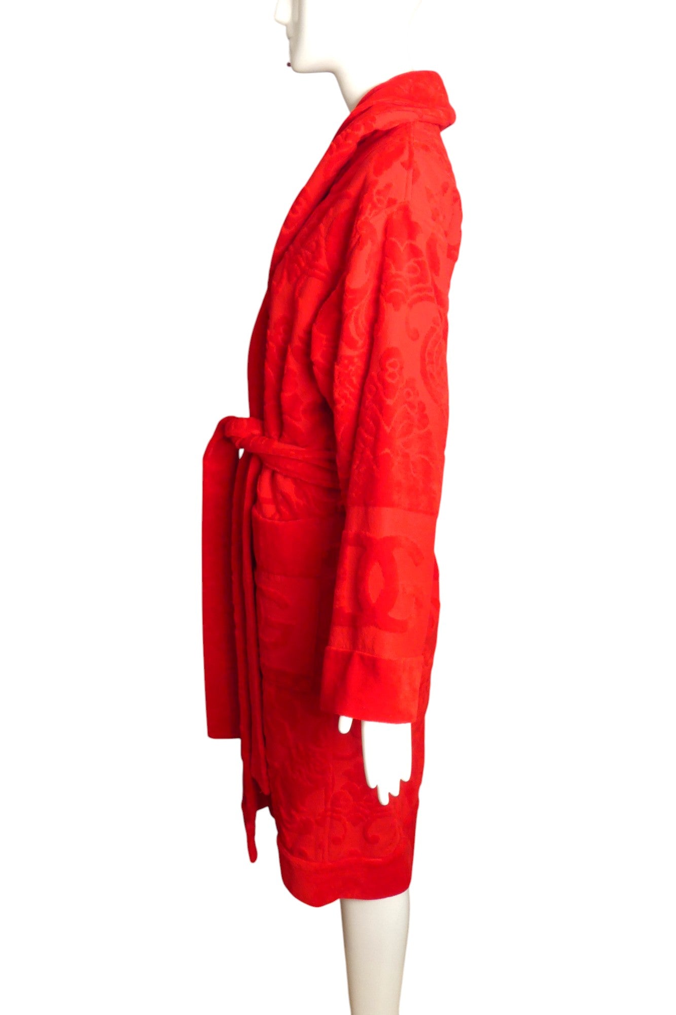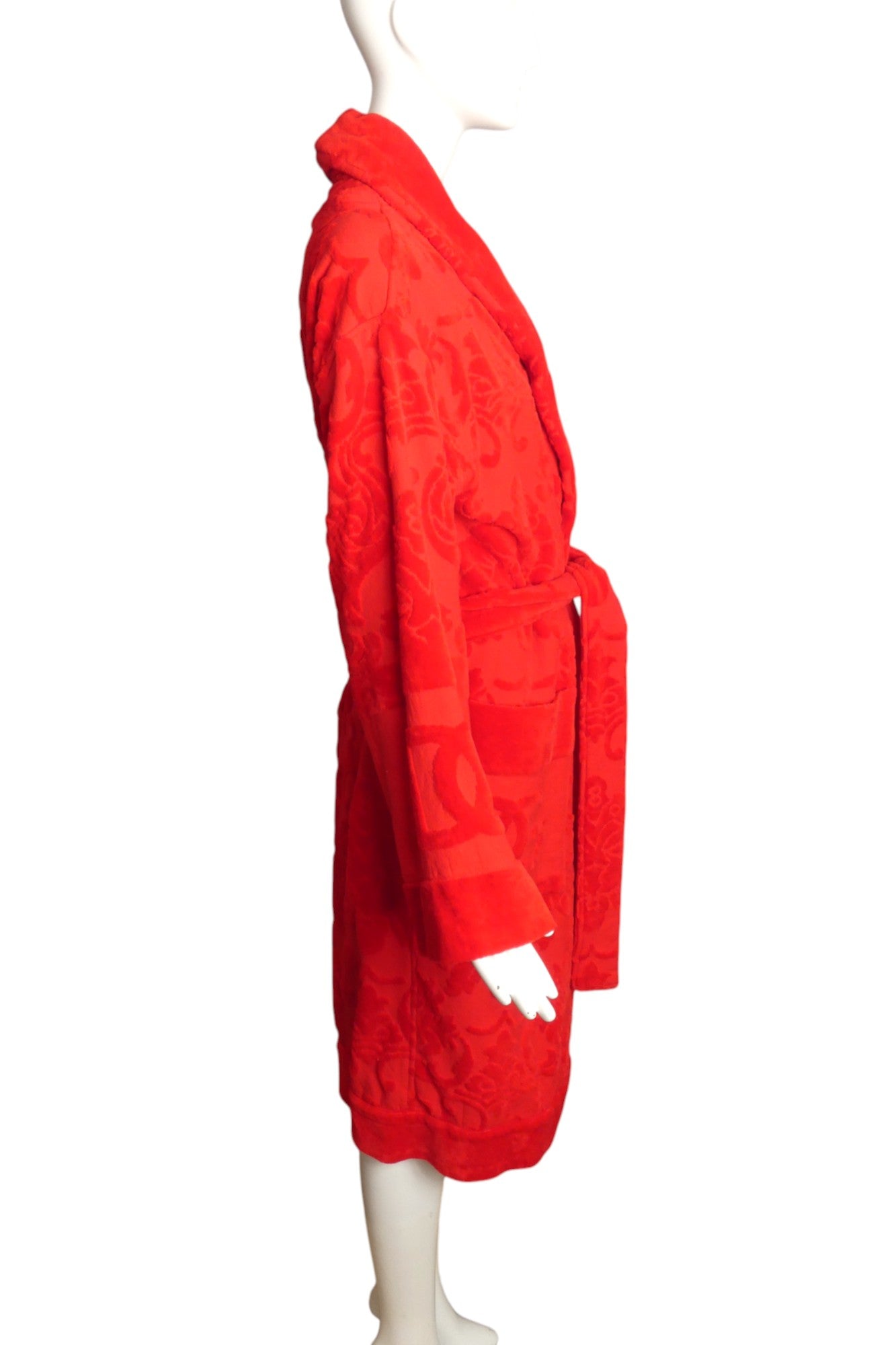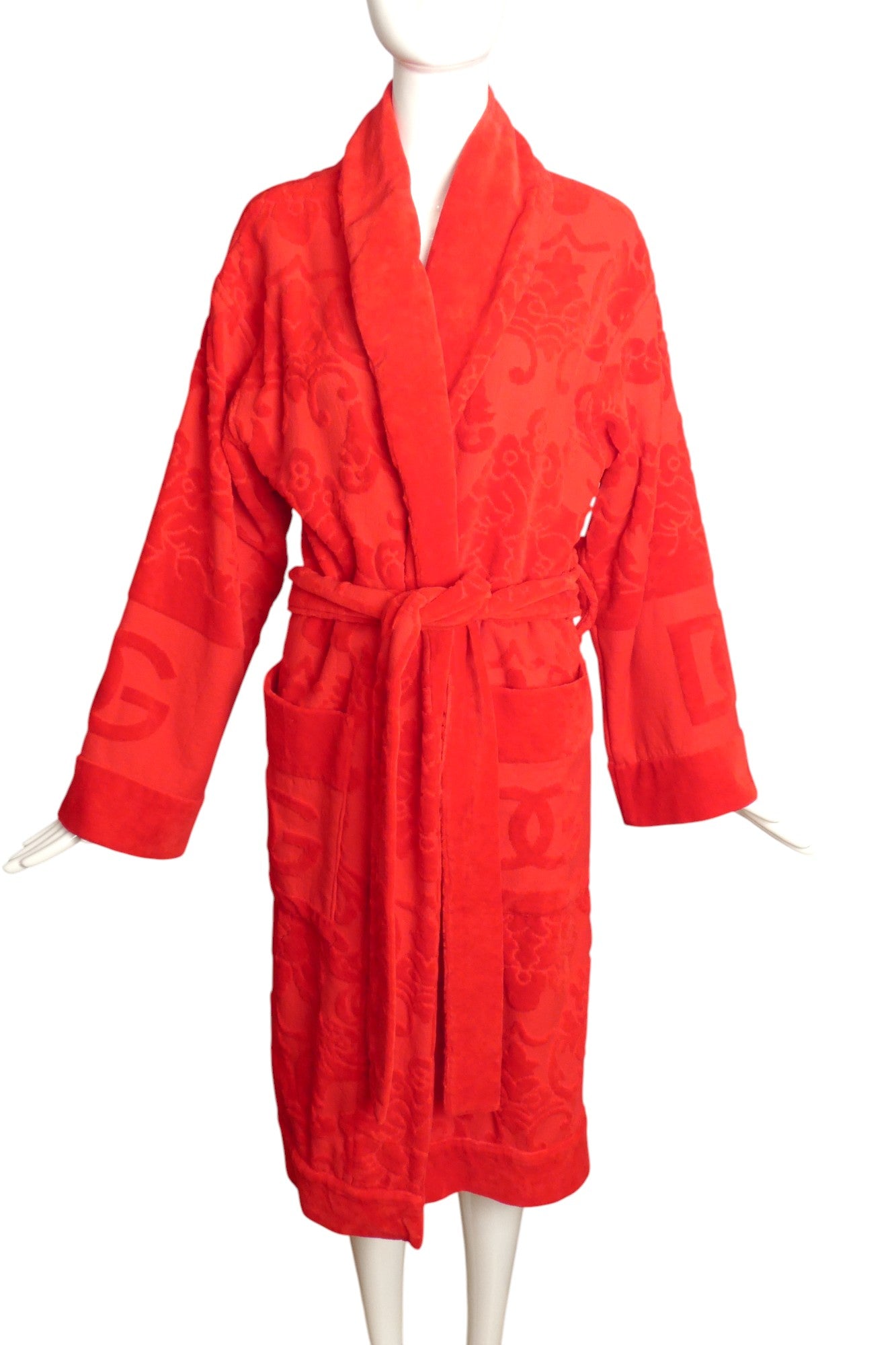 Description: Indulge in luxury with the Dolce & Gabbana Home Collection Red Bath Robe, a stunning piece crafted from plush terry cloth adorned with an exquisite baroque design. This eye-catching robe features a sophisticated black sash tie at the waist, ensuring a perfect fit while adding a touch of elegance. With large patch pockets on the hips, it combines style and functionality, making it ideal for lounging in comfort or stepping out in style. Elevate your homewear with this statement piece that embodies the essence of opulence and refinement.