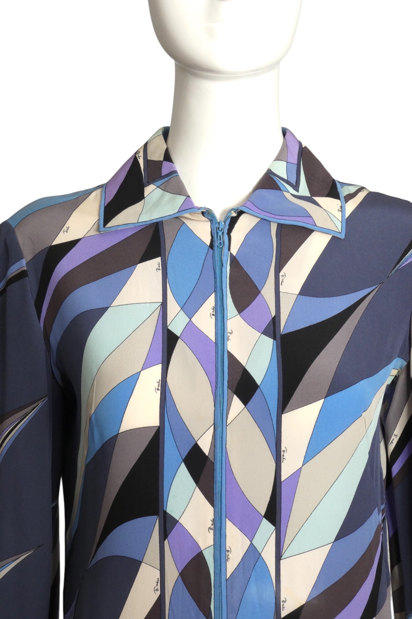 Description: Gorgeous maxi dress in a printed silk and with the iconic signature throughout in the pattern. The dress has a spread collar with a zipper closure down the front. Diagonal bust darts and long set in sleeves. The sleeves fall in gathers to the button closing cuffs.