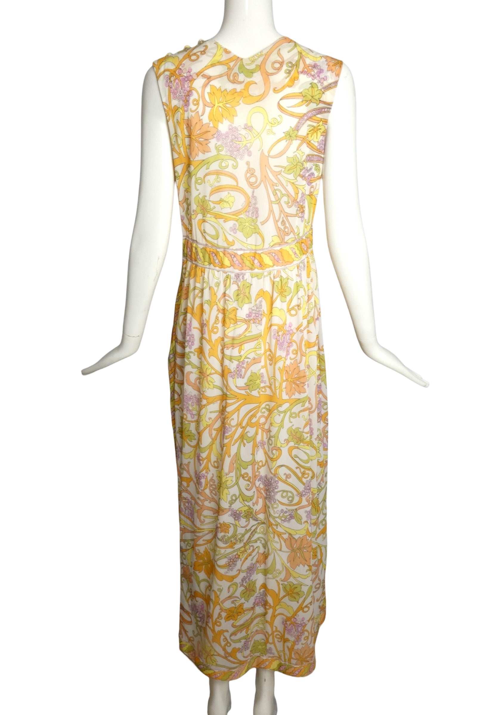 Description: This exquisite 1970s Emilio Pucci nightgown showcases the designer's signature aesthetic in a captivating colorful palette. Crafted from printed nylon, the piece features sophisticated diagonal bust darts for refined shaping and a generously elasticated waistband that sits comfortably at the natural waist. The gracefully gathered skirt flows from the waistband with a practical side slit, creating elegant movement. Sized for a petite frame, this versatile piece transitions effortlessly from intimate sleepwear to a chic vintage dress for contemporary styling. A timeless example of 1970s luxury design.