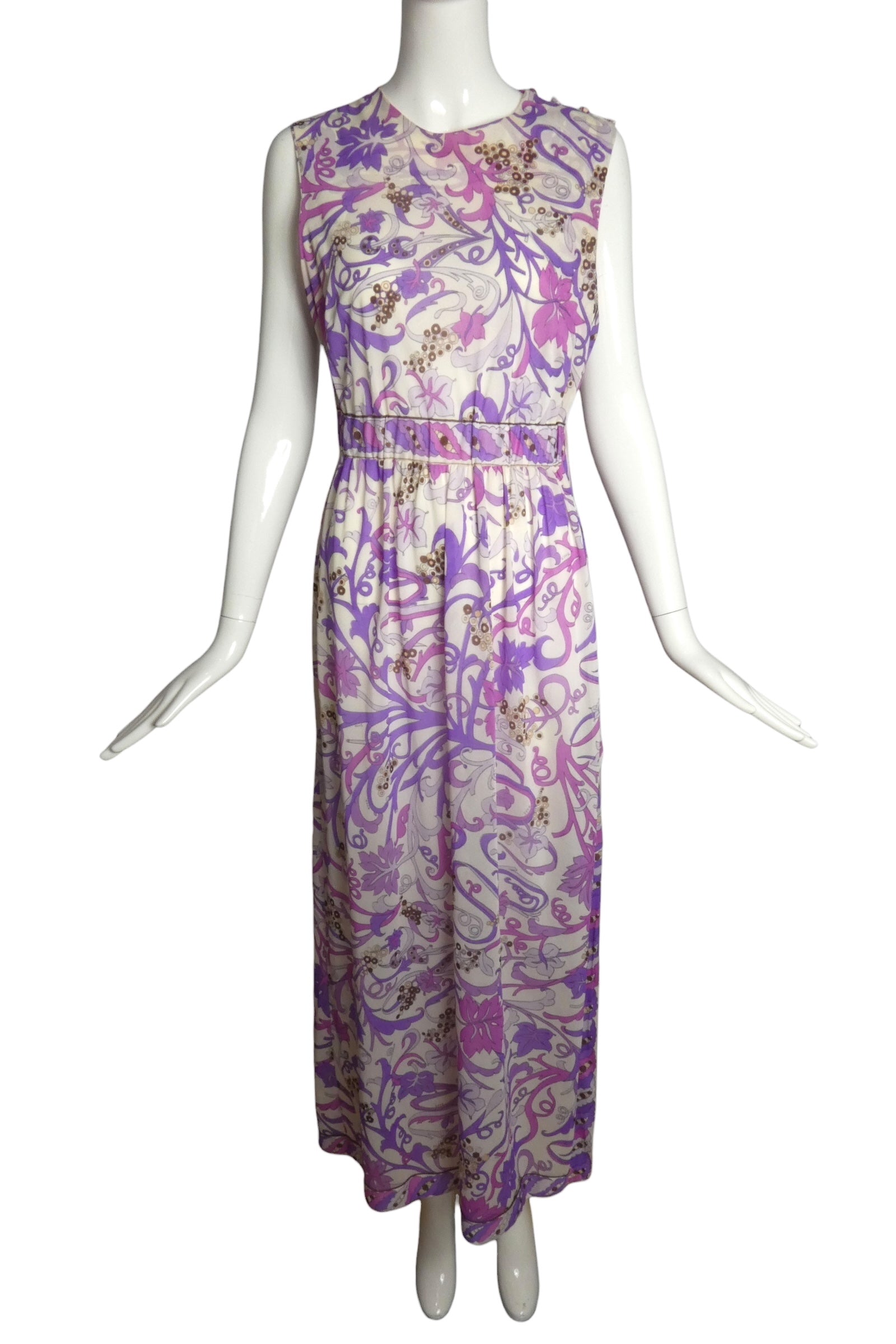 Description: This exquisite 1970s Emilio Pucci nightgown showcases the designer's signature aesthetic in a captivating purple palette. Crafted from printed nylon, the piece features sophisticated diagonal bust darts for refined shaping and a generously elasticated waistband that sits comfortably at the natural waist. The gracefully gathered skirt flows from the waistband with a practical side slit, creating elegant movement. Sized for a petite frame, this versatile piece transitions effortlessly from intimate sleepwear to a chic vintage dress for contemporary styling. A timeless example of 1970s luxury design.