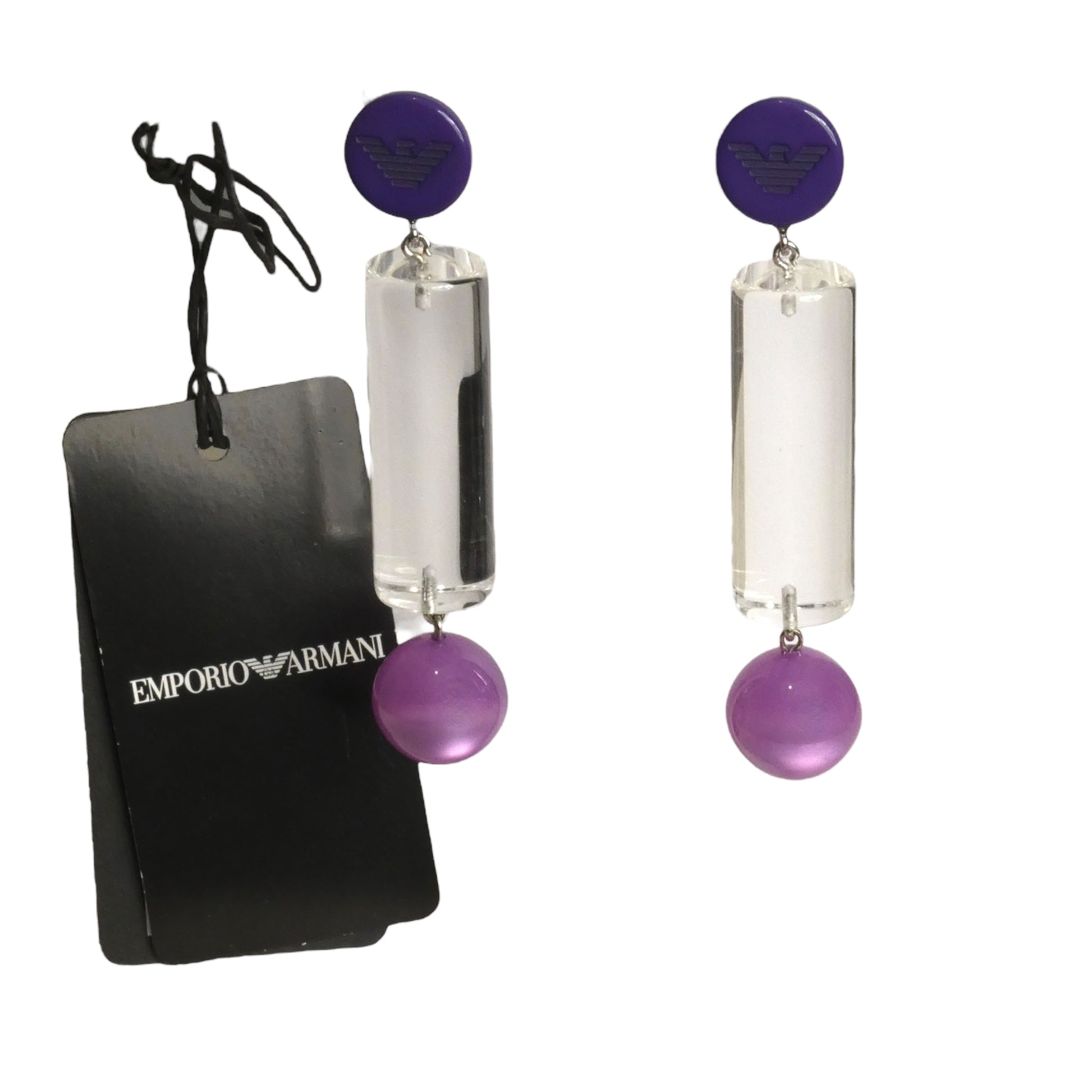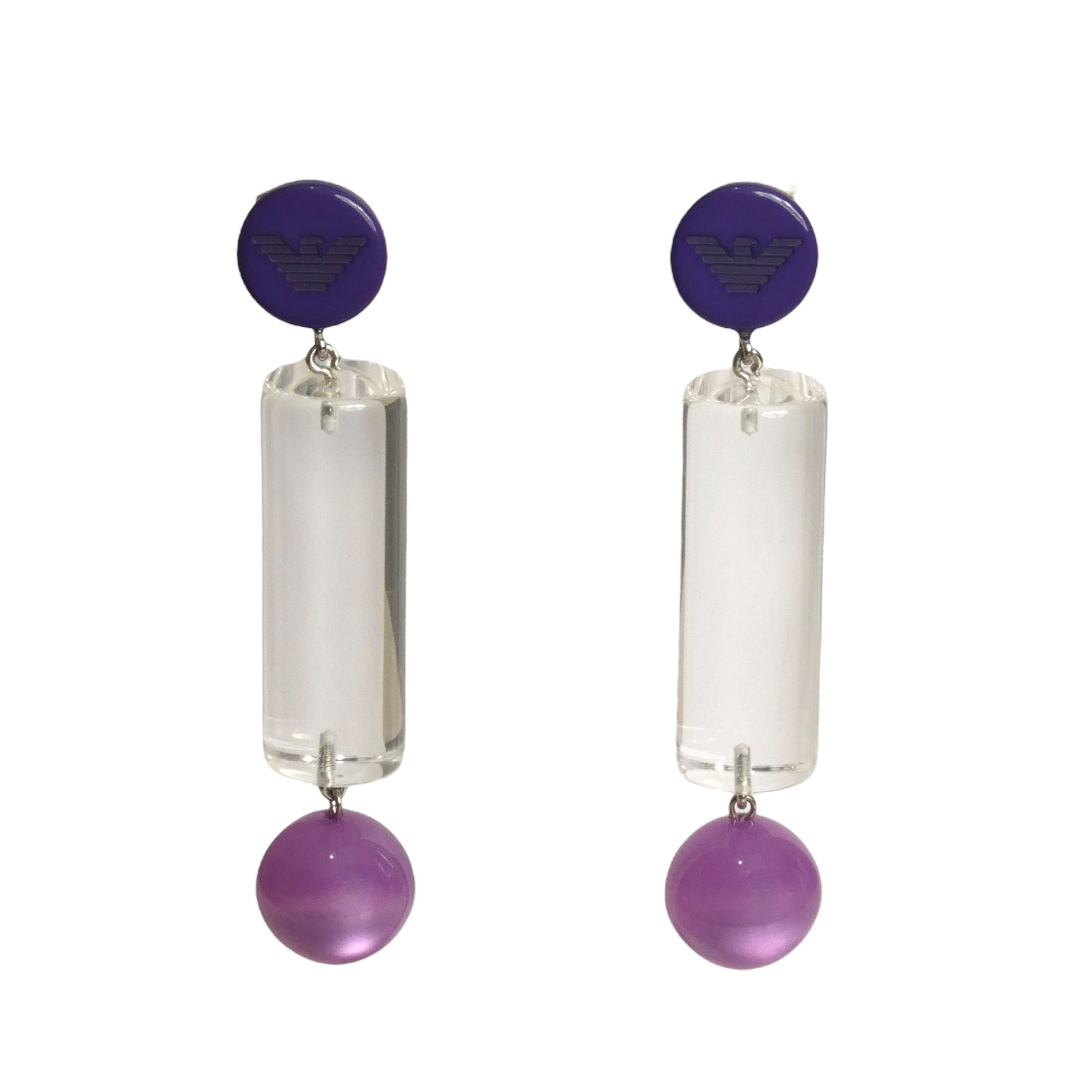 Description: These pierced, drop earrings feature a purple button top showcasing the Emporio Armani logo. Clear lucite cylinders hang elegantly from the earrings, ending with a purple lucite bubble at the base. They come with the original store tags still attached.