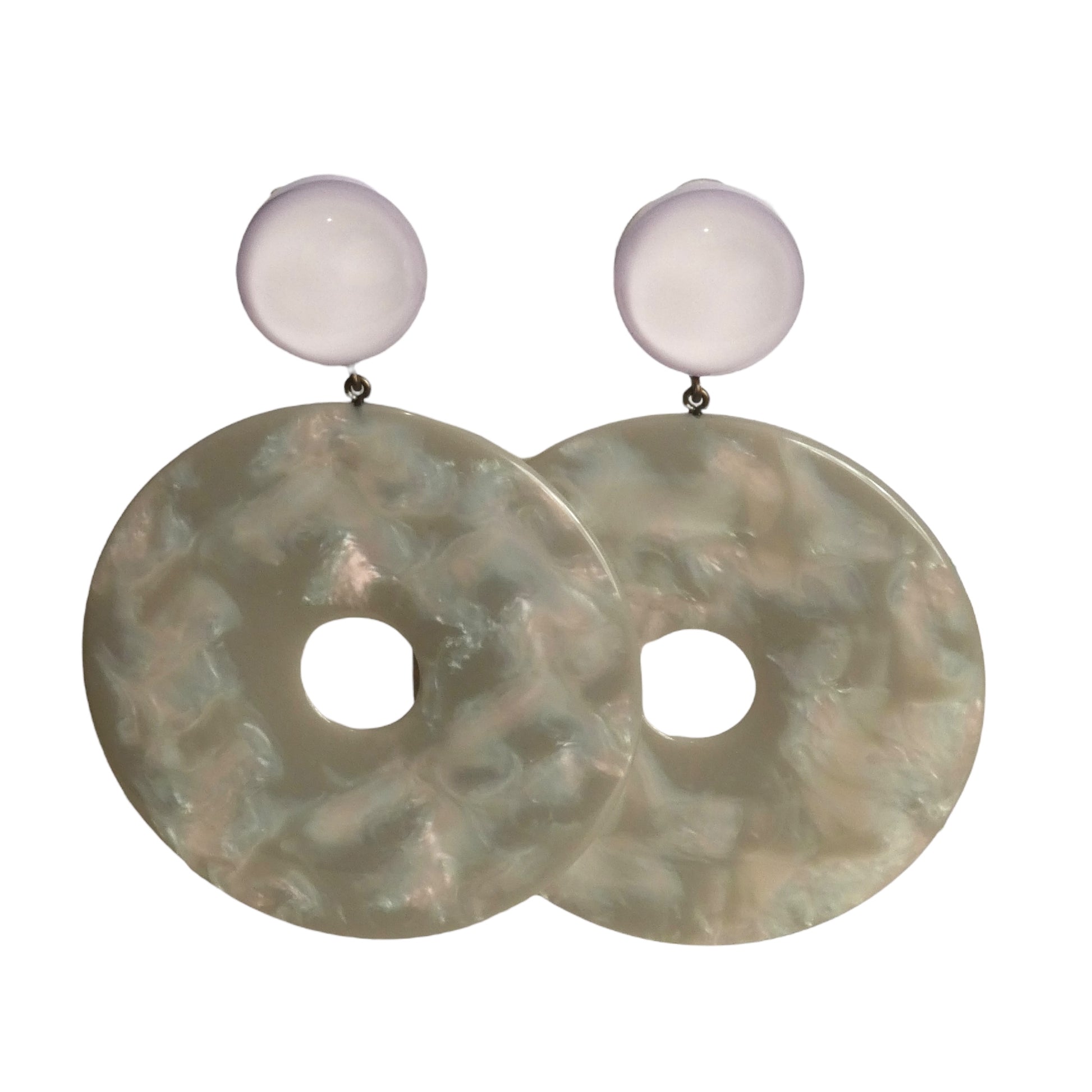 Description: These EMPORIO ARMANI lucite hoop earrings feature large grey marbled hoops with a subtle luminescent sheen, creating a distinctive and refined look. The hoops elegantly drop from lavender bubble button tops, adding a touch of color and modern design. Designed with clip backs, they offer comfortable, secure wear without the need for pierced ears. Perfect for adding a sophisticated statement to any outfit.