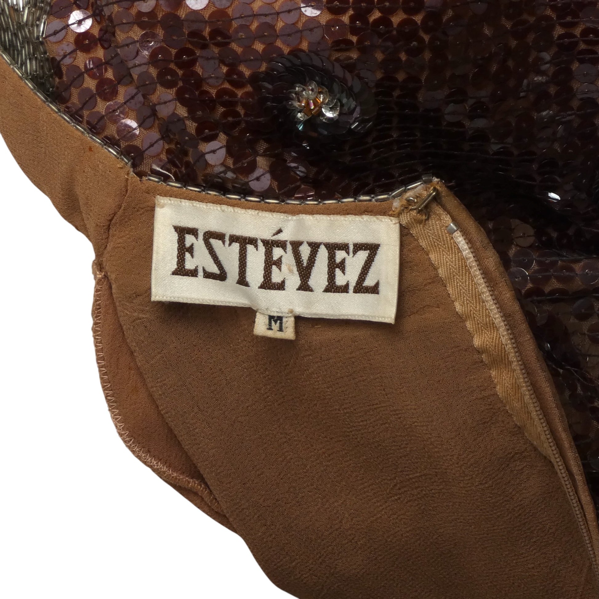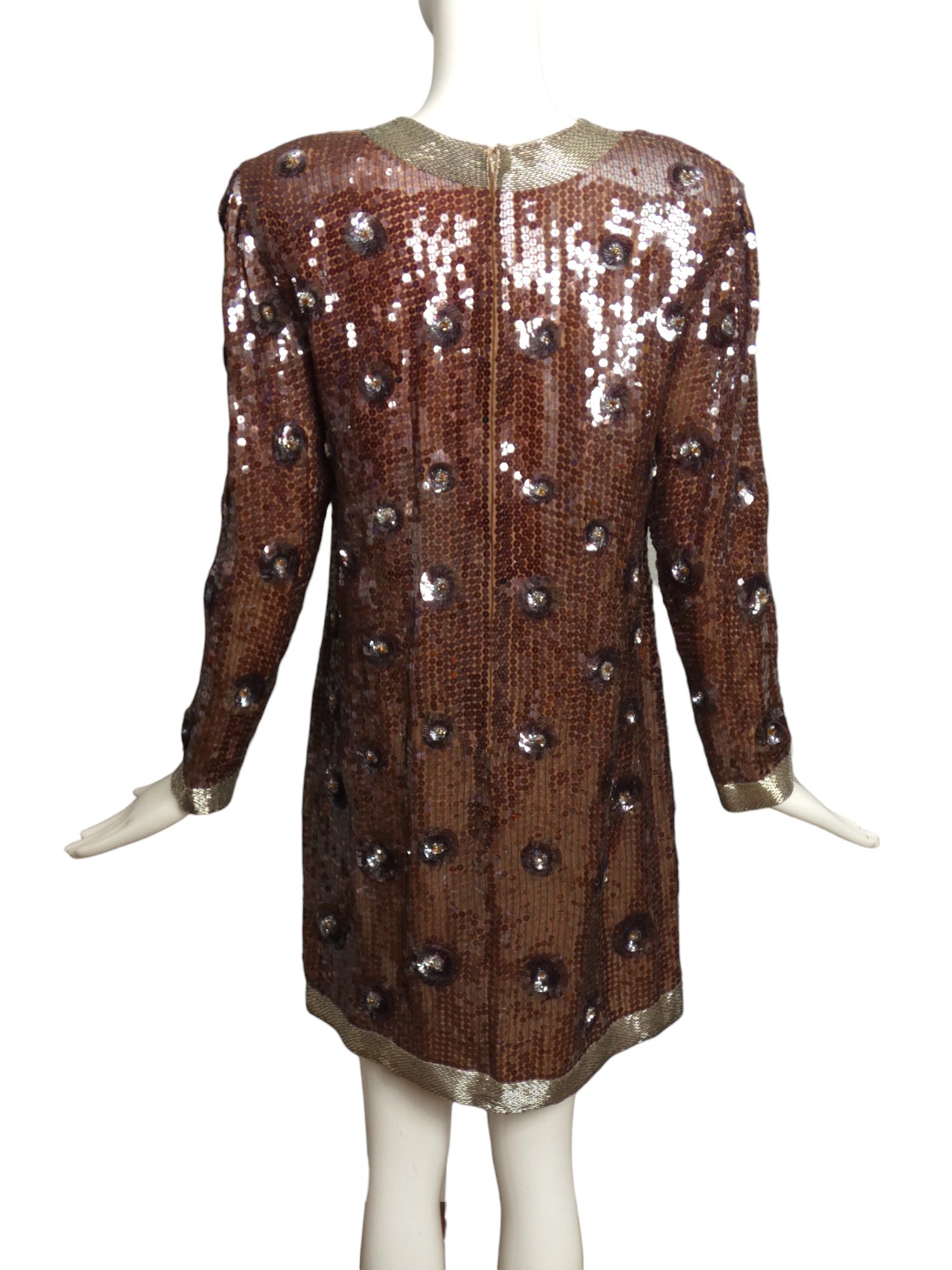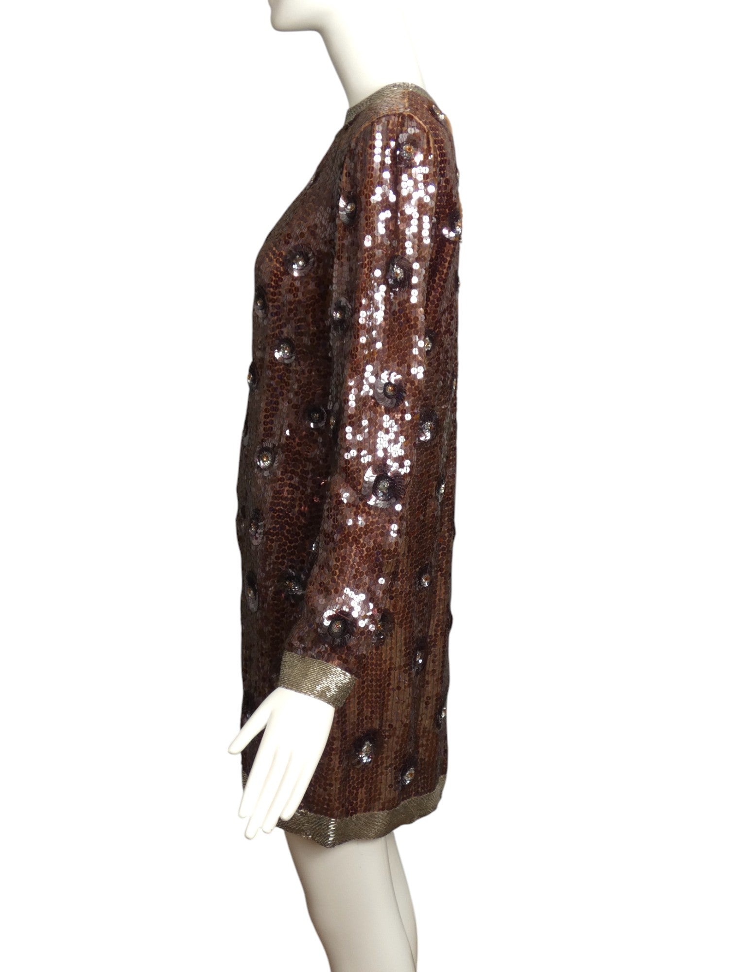 Description: Enhance your evening attire with this stunning brown silk chiffon party dress, adorned with glistening sequins. The dress features a metallic bugle beaded neckband, wristbands, and hem. Chic spirals of sequins with beaded accents embellish the dress, adding a touch of elegance.