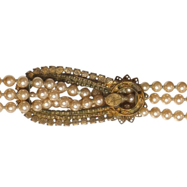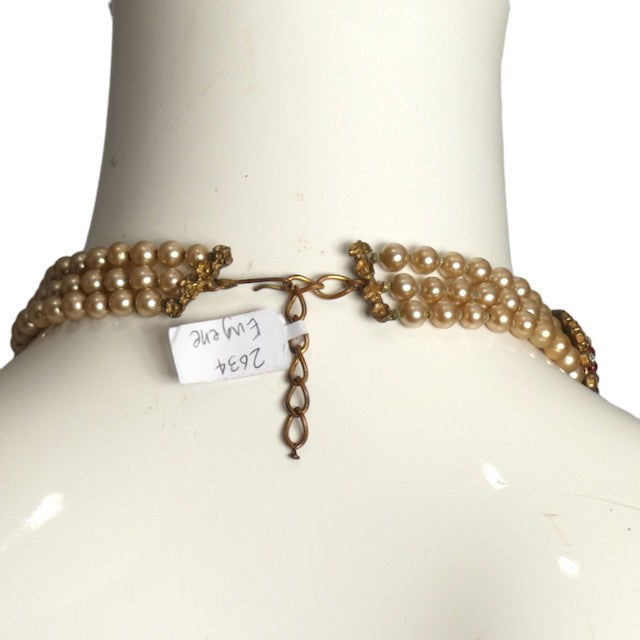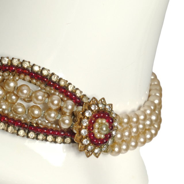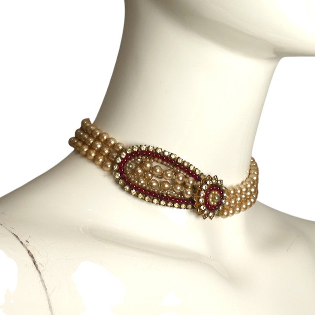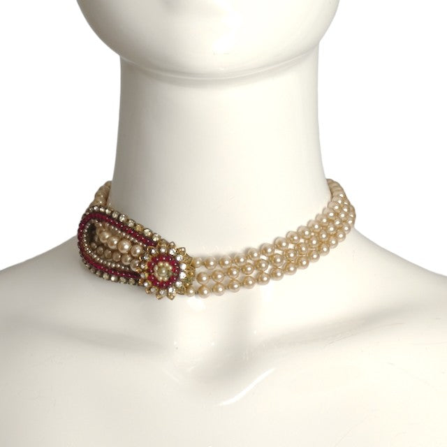 Description: Elevate your elegance with this exquisite 1950s choker, featuring three luxurious strands of ivory pearls that exude timeless sophistication. The stunning side slide-style buckle is adorned with sparkling rhinestones and vibrant red beads, adding a pop of color and glamour to any ensemble. Secured with a reliable hook closure at the back, this necklace is not only a statement piece but also a comfortable fit for any occasion. Perfect for special events or to enhance your everyday style, this choker is a must-have addition to your jewelry collection.
