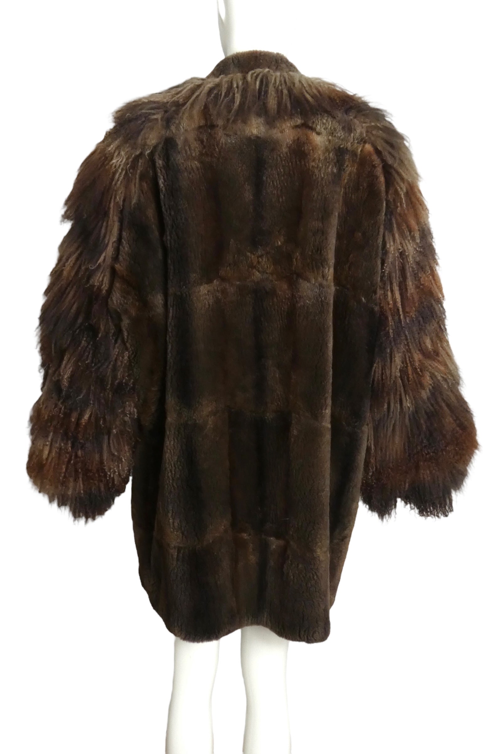Description: This 1984 FENDI fur coat combines luxurious brown shirred mink with soft Mongolian lamb, delivering timeless elegance and exceptional warmth. Featuring a classic spread collar and a single button closure, it offers a refined silhouette with convenient inset front pockets. Crafted for durability and style, this size large coat is a sophisticated investment that will keep you comfortably warm through many seasons to come.