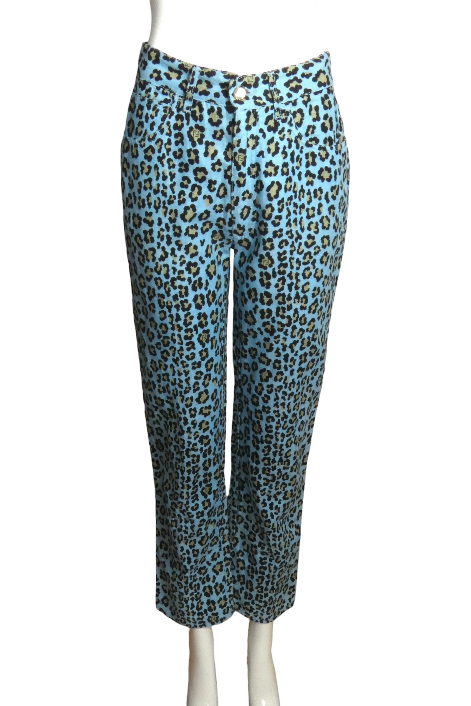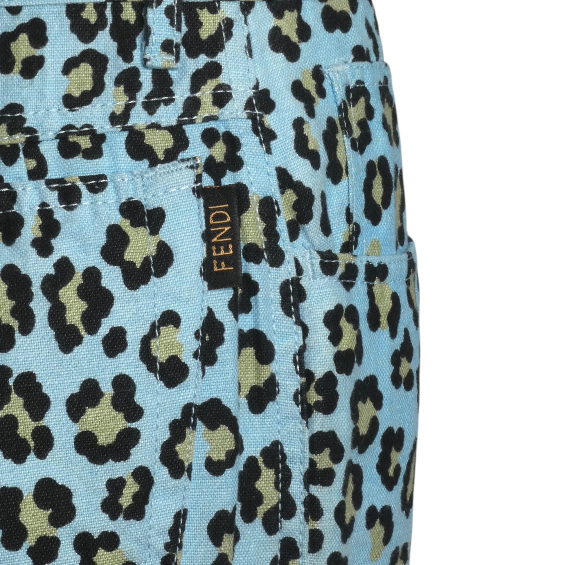 Description: A late 1990s Fendi pant in crisp linen featuring an allover leopard print subtly punctuated with the iconic "FF" monogram nestled within select spots. The design demonstrates Fendi's restrained approach to logo integration, allowing the animal print to command primary visual attention while the signature mark provides understated brand recognition. The pants adopt a classic jean cut with a substantial button waistband, inset front pockets, and patch back pockets that ground the silhouette in timeless proportion. The lightweight linen construction ensures effortless seasonality and refined comfort. A masterwork of branded luxury that balances recognizable heritage with editorial sophistication.