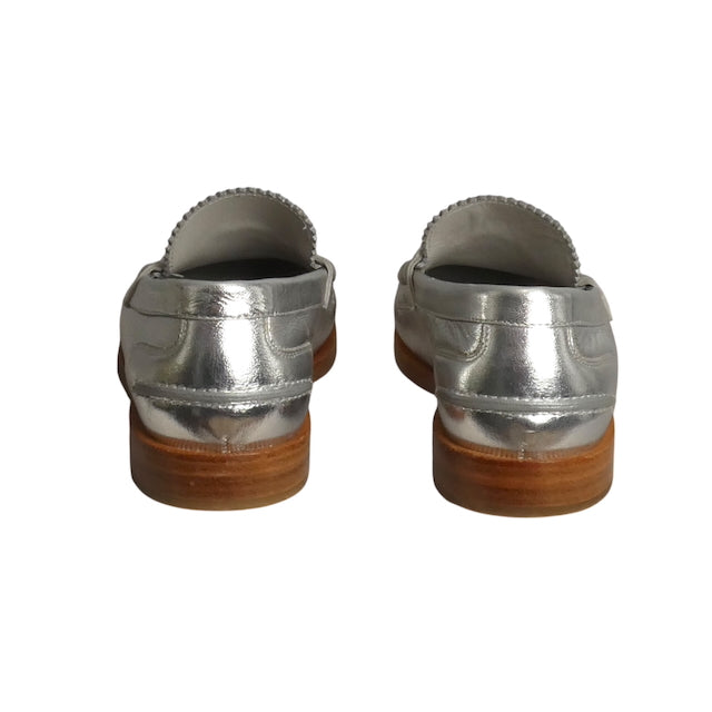 Description: The FENDI O'Lock Metallic Silver Loafers present a refined reinterpretation of the brand’s signature FF logo, showcased in gleaming O'lock hardware on a shimmering lambskin vamp. Crafted with expert precision, these size 39 loafers combine classic penny loafer design with luxurious metallic shine, complemented by supple leather soles for lasting comfort and elegance. Ideal for elevating both formal and casual ensembles with a contemporary edge.