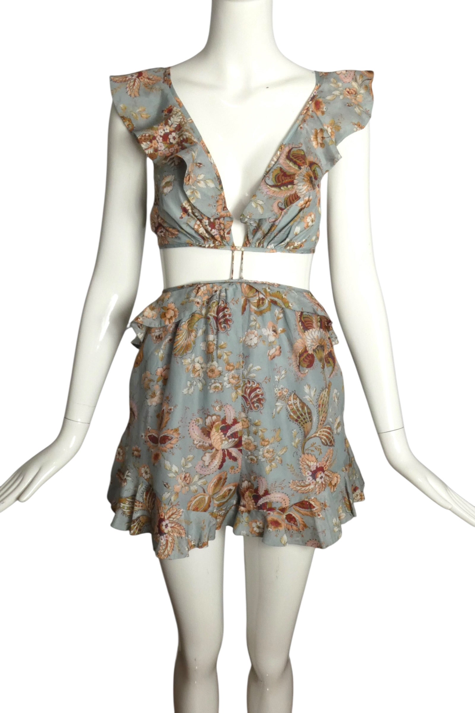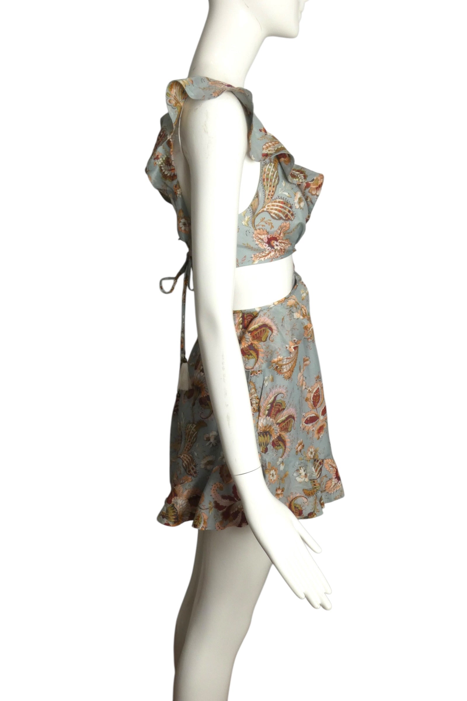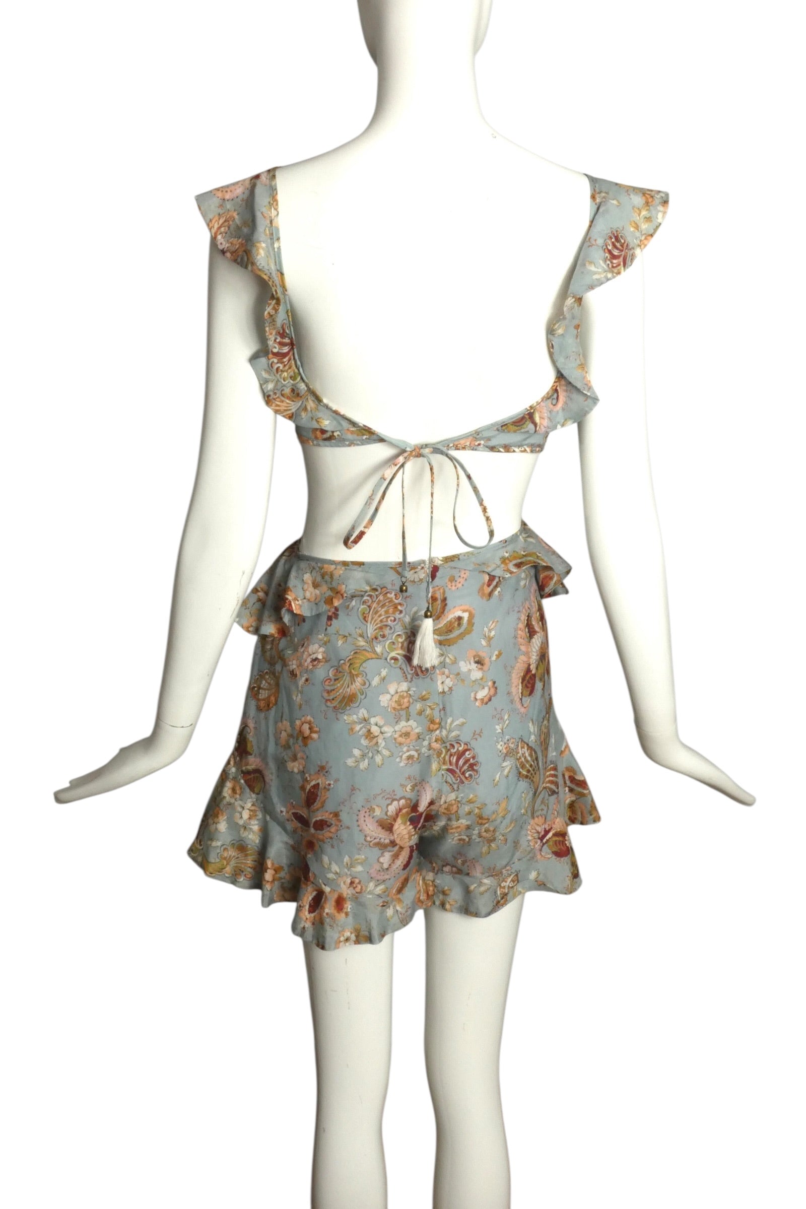 Description: A romantic, bohemian-leaning piece from Spring 2017, this printed mini dress blends soft femininity with playful, modern cutouts. Rendered in a muted blue base with intricate floral and paisley motifs in warm, earthy tones, it has an effortlessly airy, sun-washed feel. The silhouette features a deep V-neckline framed by delicate ruffled straps, adding movement and softness through the bodice. A cutout waist with slim connecting bands creates definition while keeping the look light and open. The skirt is softly flared with a ruffled hem, enhancing the fluid drape and giving the piece a breezy, youthful energy. The back is equally striking, with an open design and adjustable tie closure finished with tassel ends—both functional and decorative, reinforcing the relaxed, bohemian aesthetic.