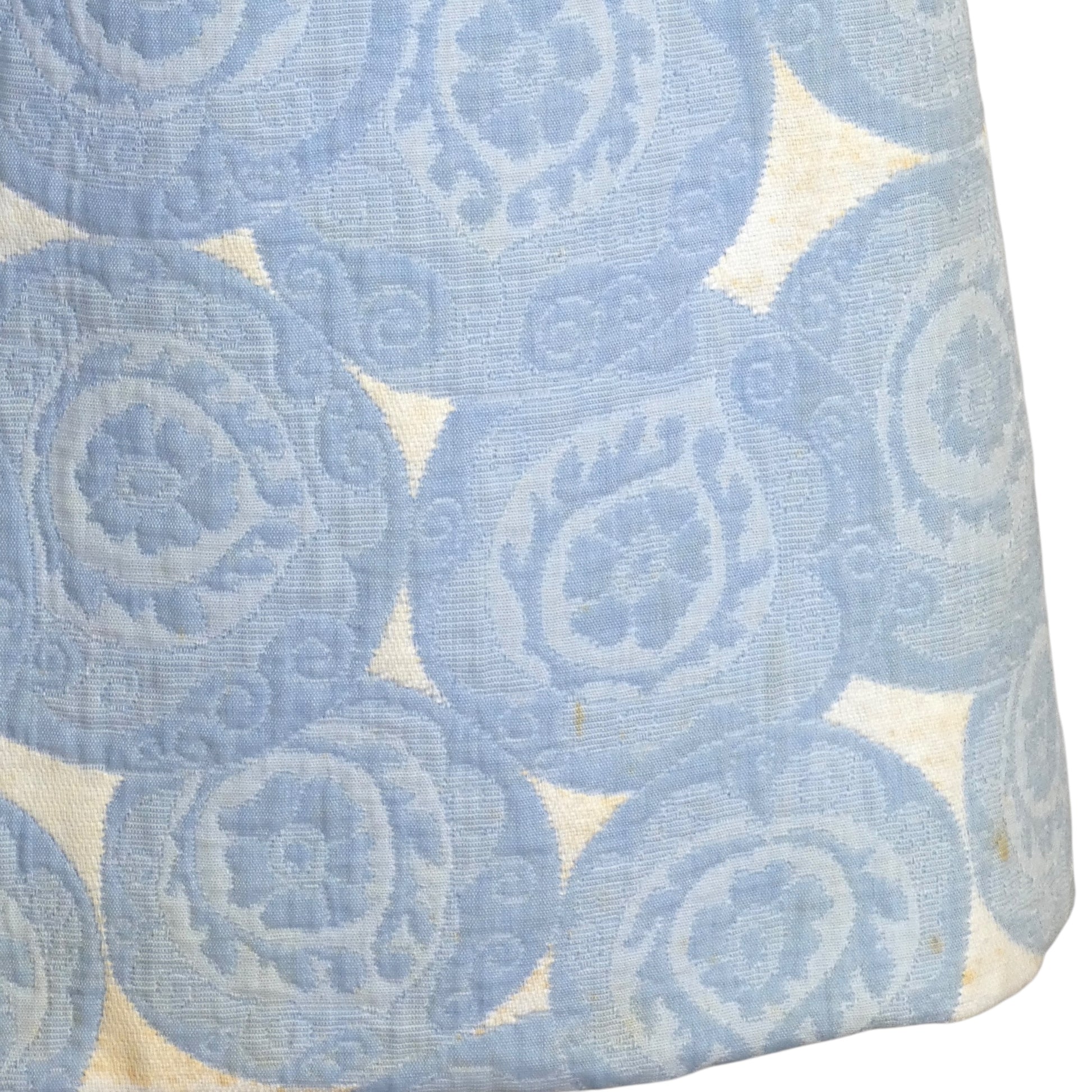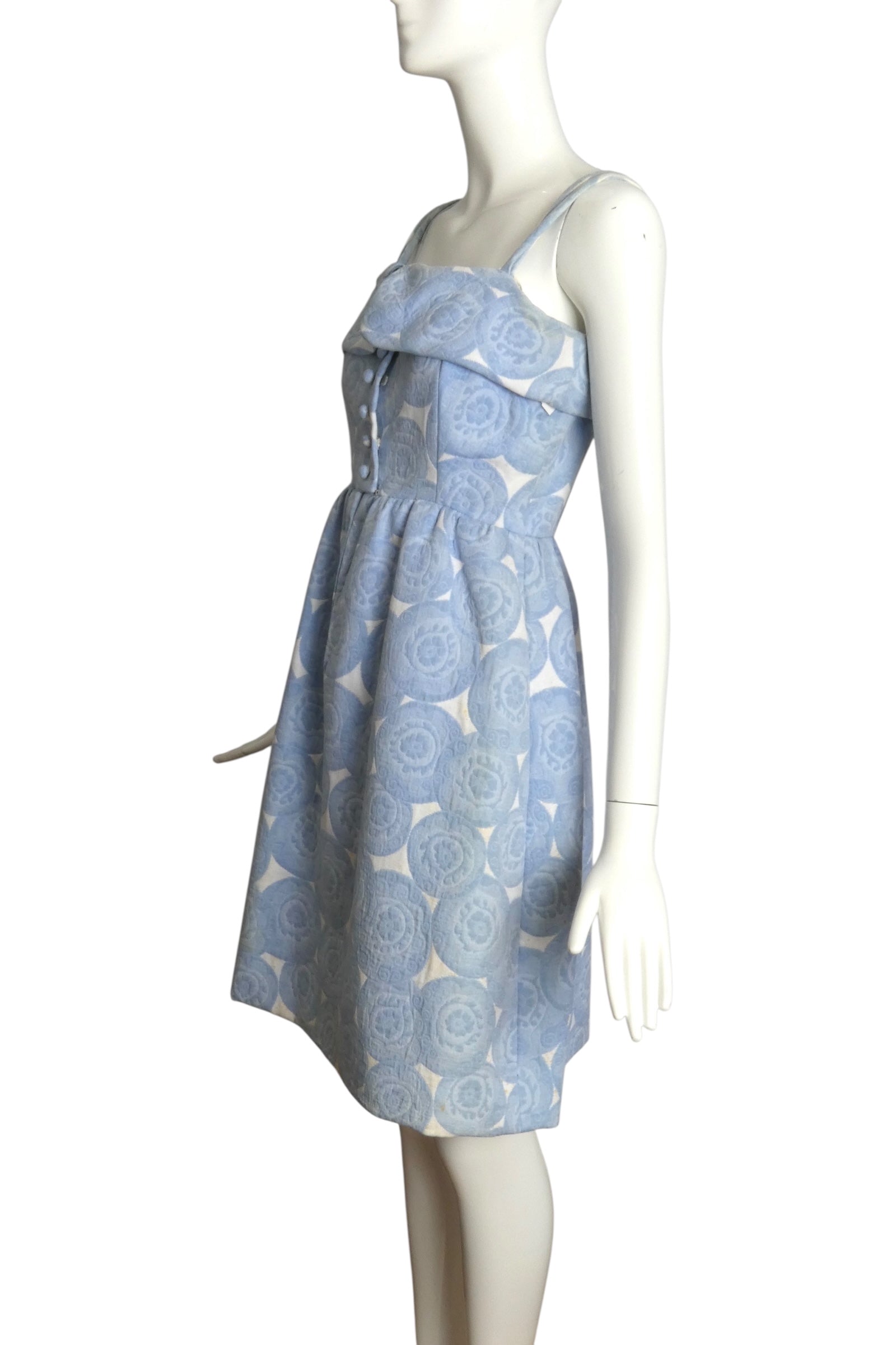Description: Step back into the ’60s with this playful Geoffrey Beene dress! Crafted from blue and white floral cotton jacquard, it features a dart-fitted bodice and double spaghetti straps that add delicate charm. The front’s decorative buttons draw the eye, while the slightly raised waistline flows into a gathered bell-shaped skirt for twirl-worthy fun.