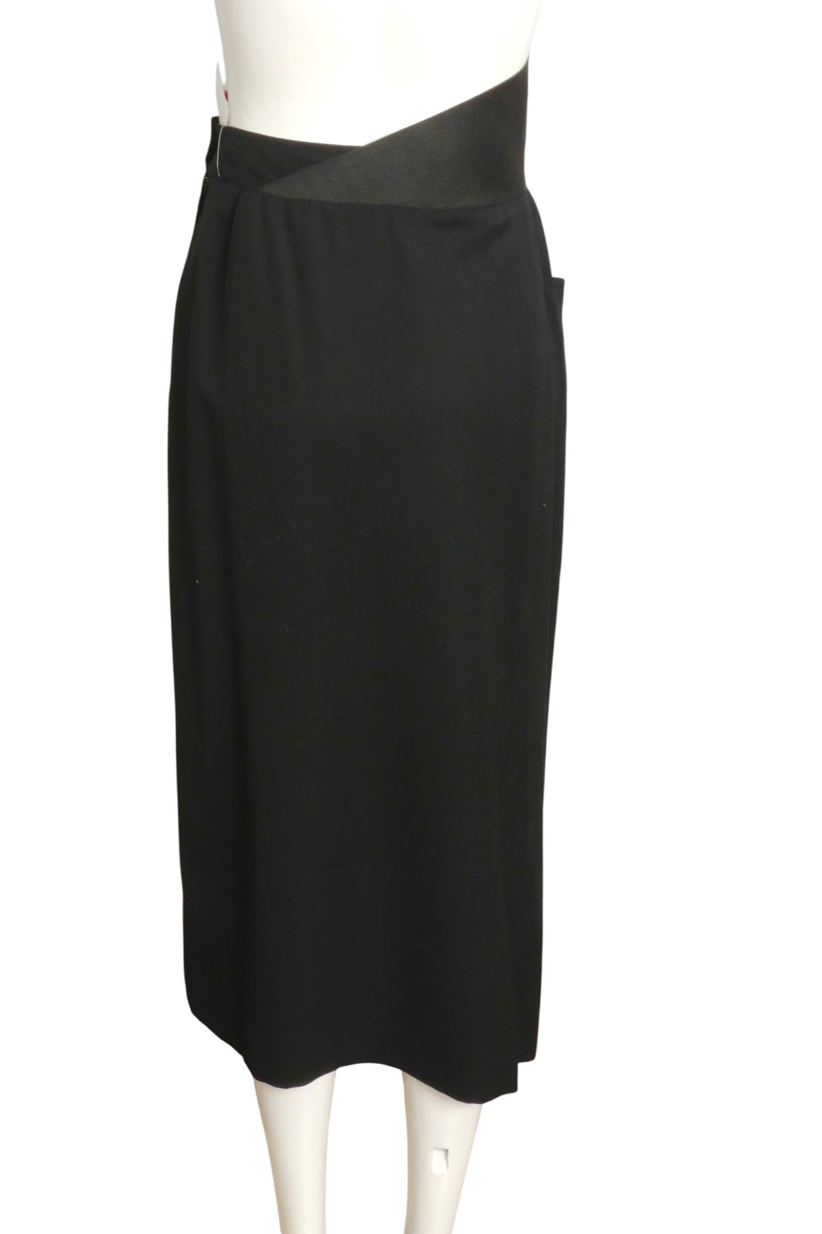 Description: Step into retro glam with this 1980s Gianfranco Ferre midi skirt! Featuring a wide waistband that flatters your figure, it gracefully sculpts a sleek silhouette. The eye-catching asymmetrical elastic panel wraps around your waist with a bold geometric pattern, perfectly capturing that iconic 80s vibe. Plus, a slouchy pocket on the right hip adds a fun, practical twist. This black wool skirt in size 12 is your ticket to effortless style with a playful edge!