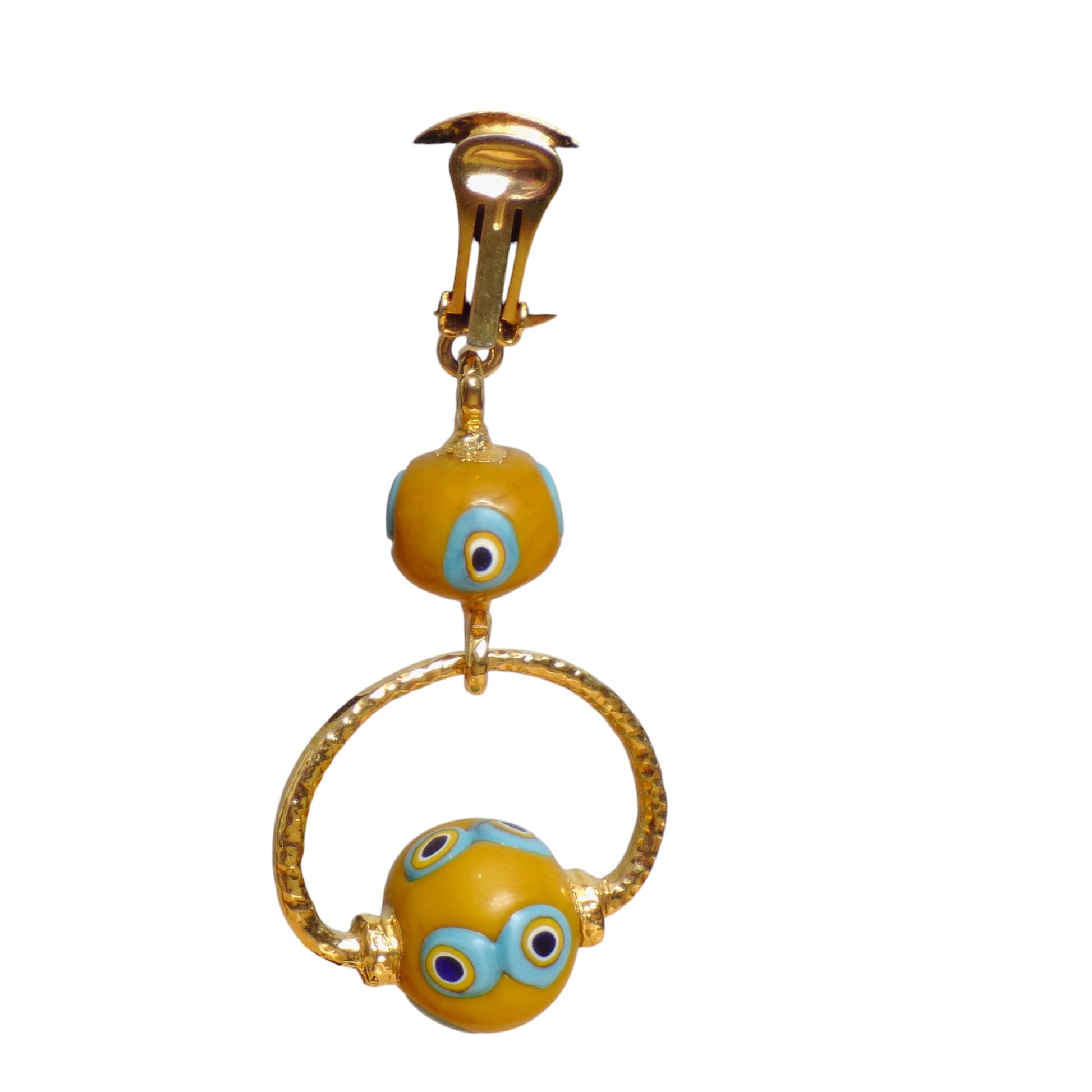 Description: We love these fabulous 1980s Italian clip back earrings in hammered gold tone metal with yellow and blue polymer beads.