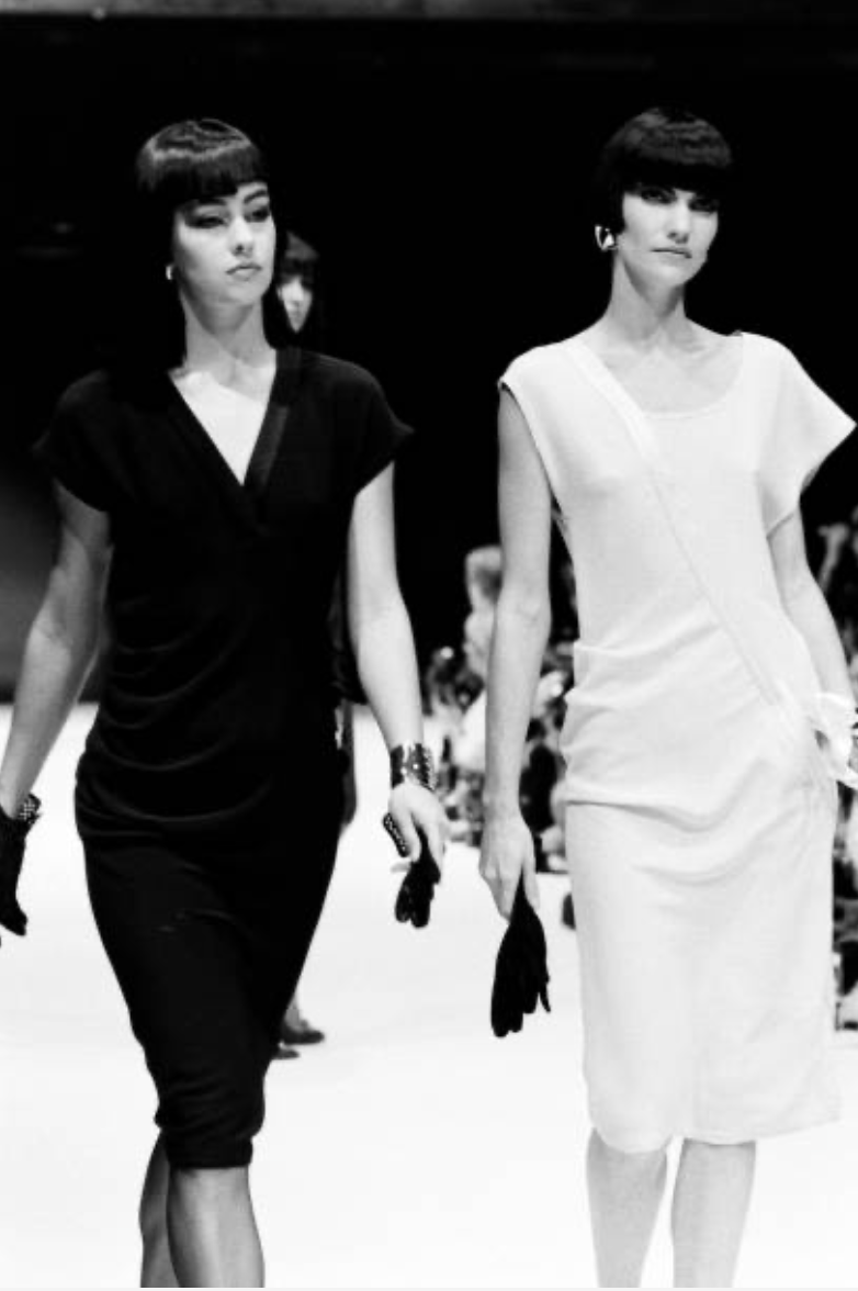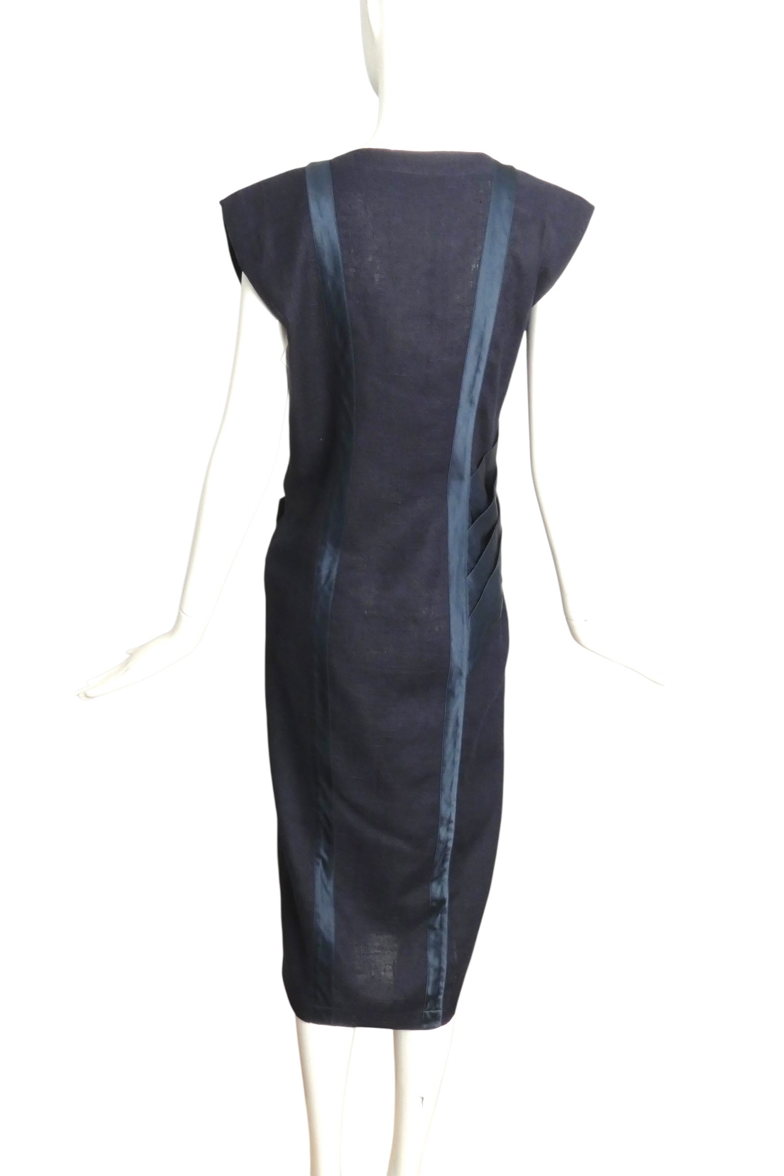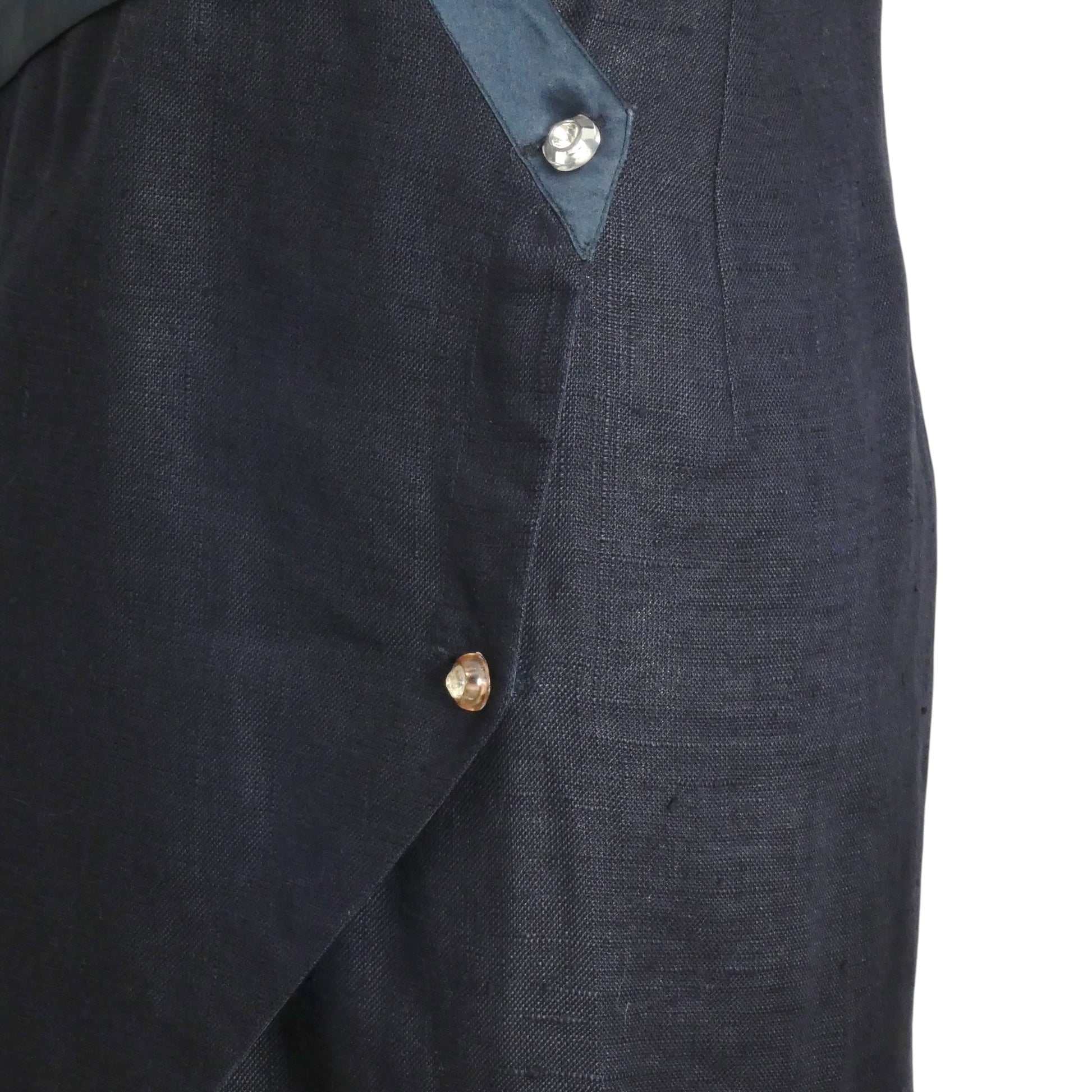 Description: This exquisite 1980s Gianni Versace wrap dress combines navy linen with silk accents for a sophisticated silhouette. It fastens with distinctive lucite and rhinestone buttons on the left side, while a pleated satin drape elegantly wraps around the waist to the side back. Two satin panels appliquéd over the back princess seams add refined dimensionality. Perfectly tailored, this dress highlights expert craftsmanship and vintage luxury, ideal for collectors and fashion connoisseurs seeking a statement piece from the era.