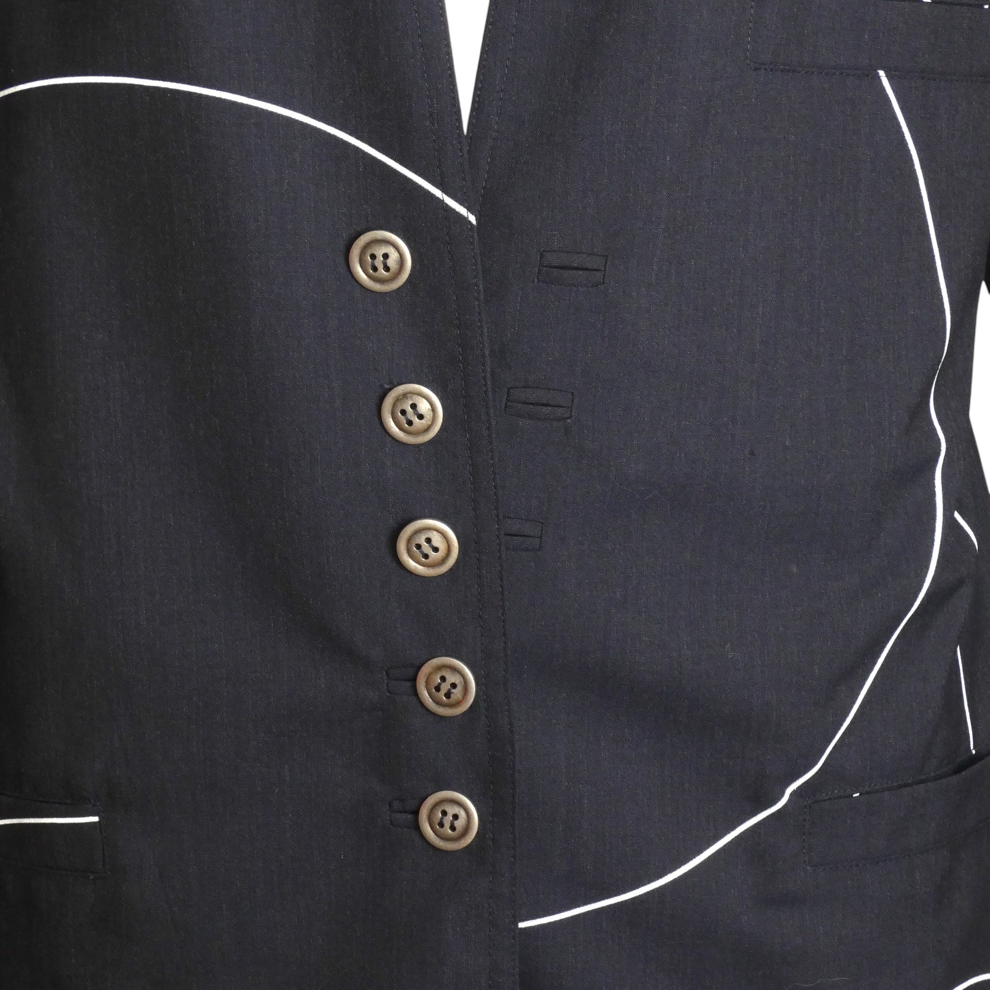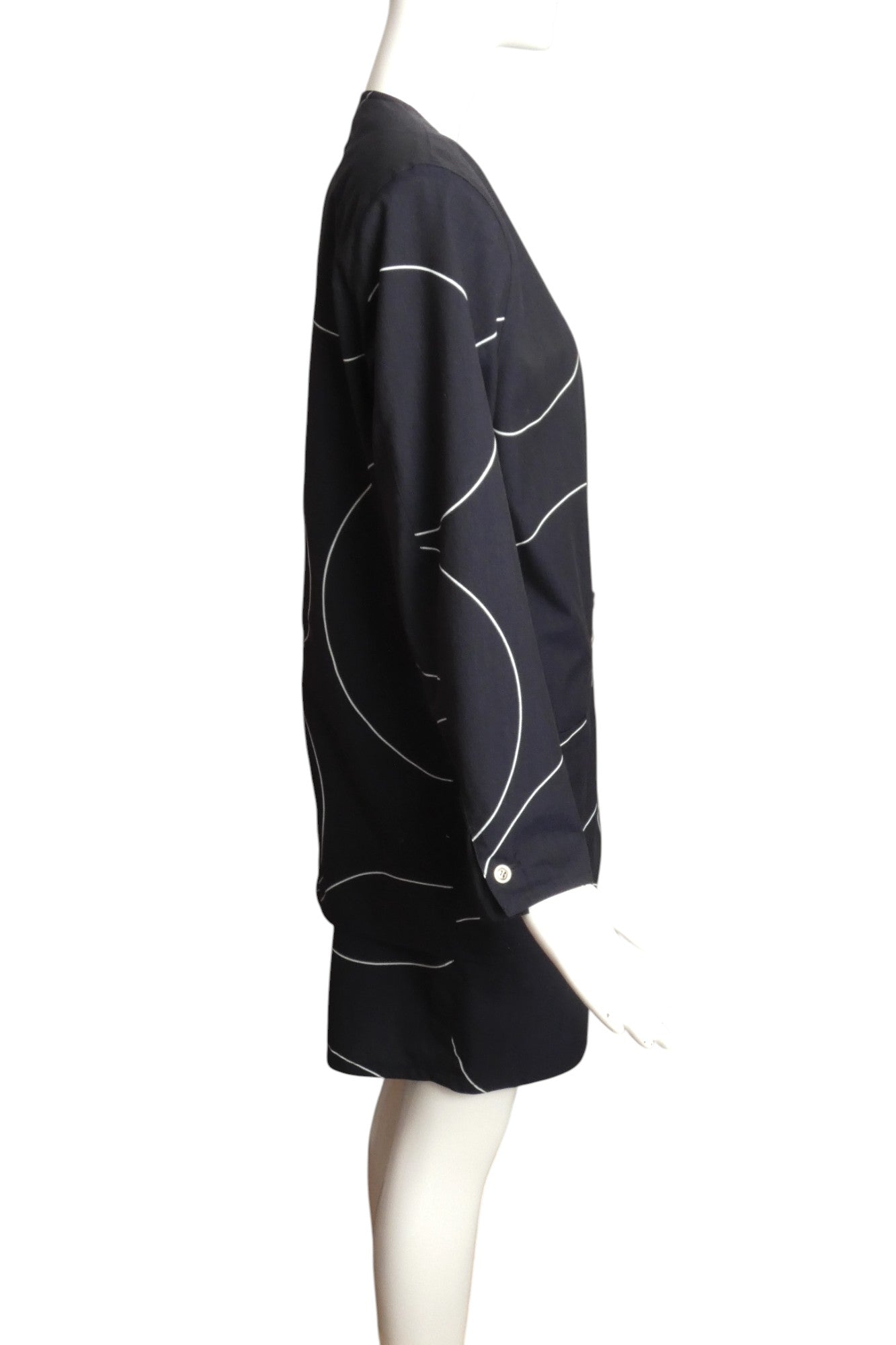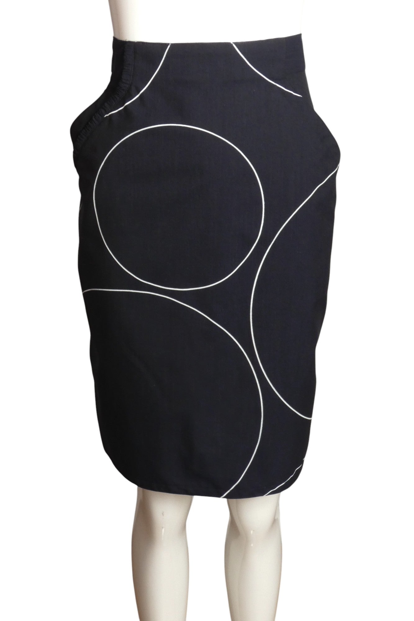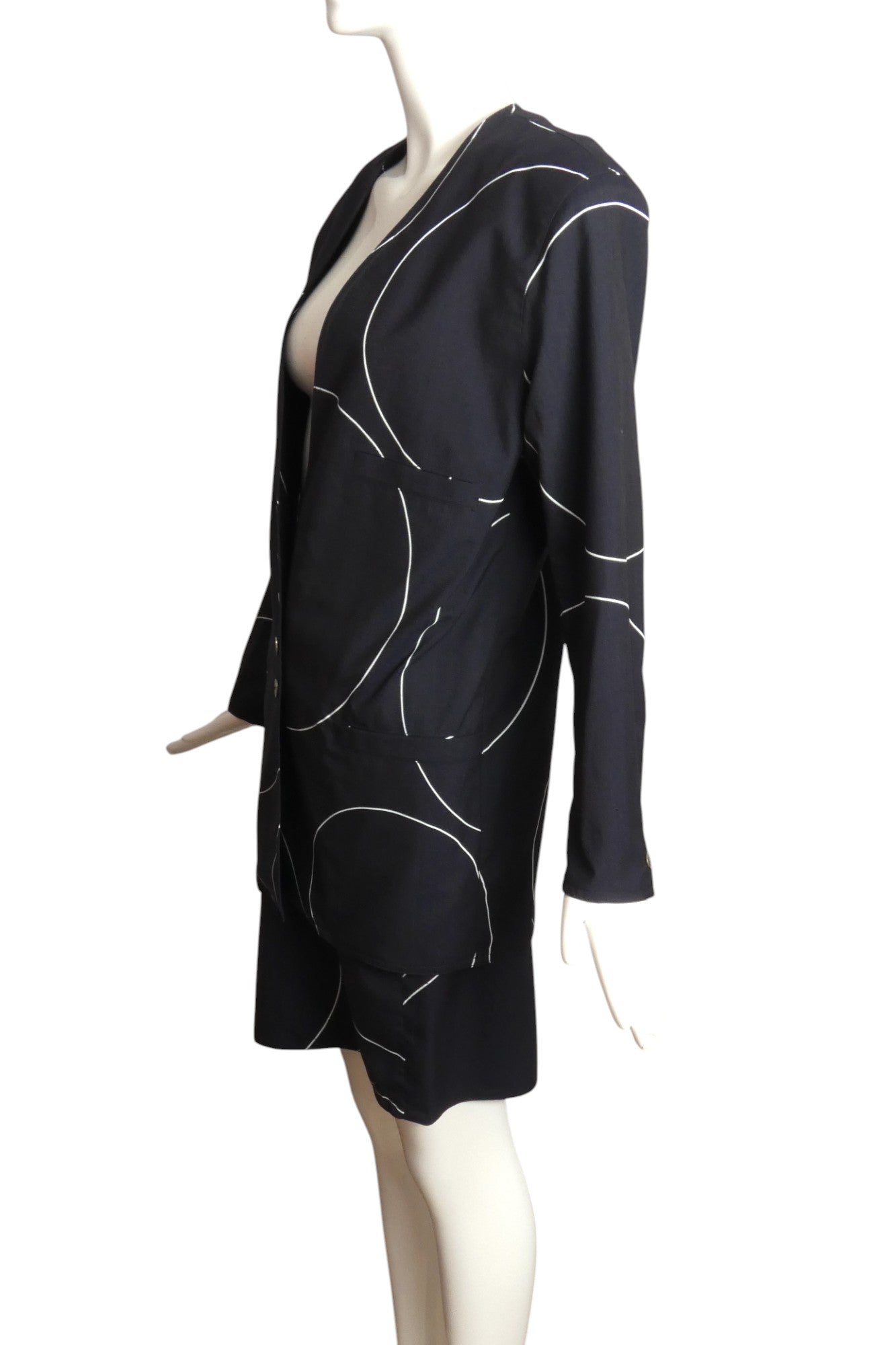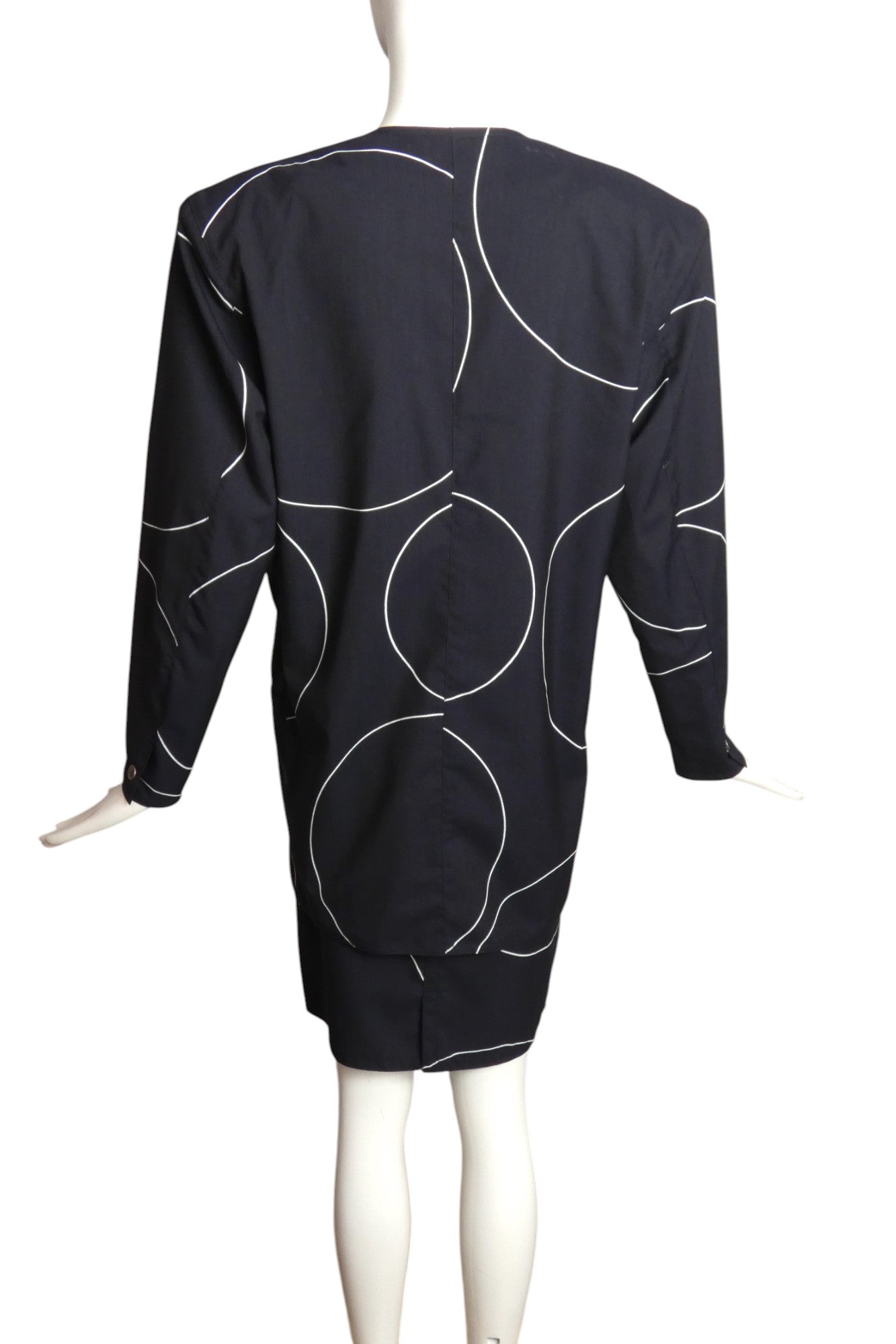 Description: 1980s Cotton ensemble featuring a striking black base adorned with white circular outlines. The blazer showcases the quintessential 80s profile—dramatic square shoulders, cinched waist, and extended length—with front button fastening. A sophisticated welt pocket graces the chest while decorative welts enhance the hip area. Completing this power suit, the sleek high-waisted skirt offers a tailored fit through waist darts instead of a traditional waistband, complemented by convenient slouch pockets at the hips.