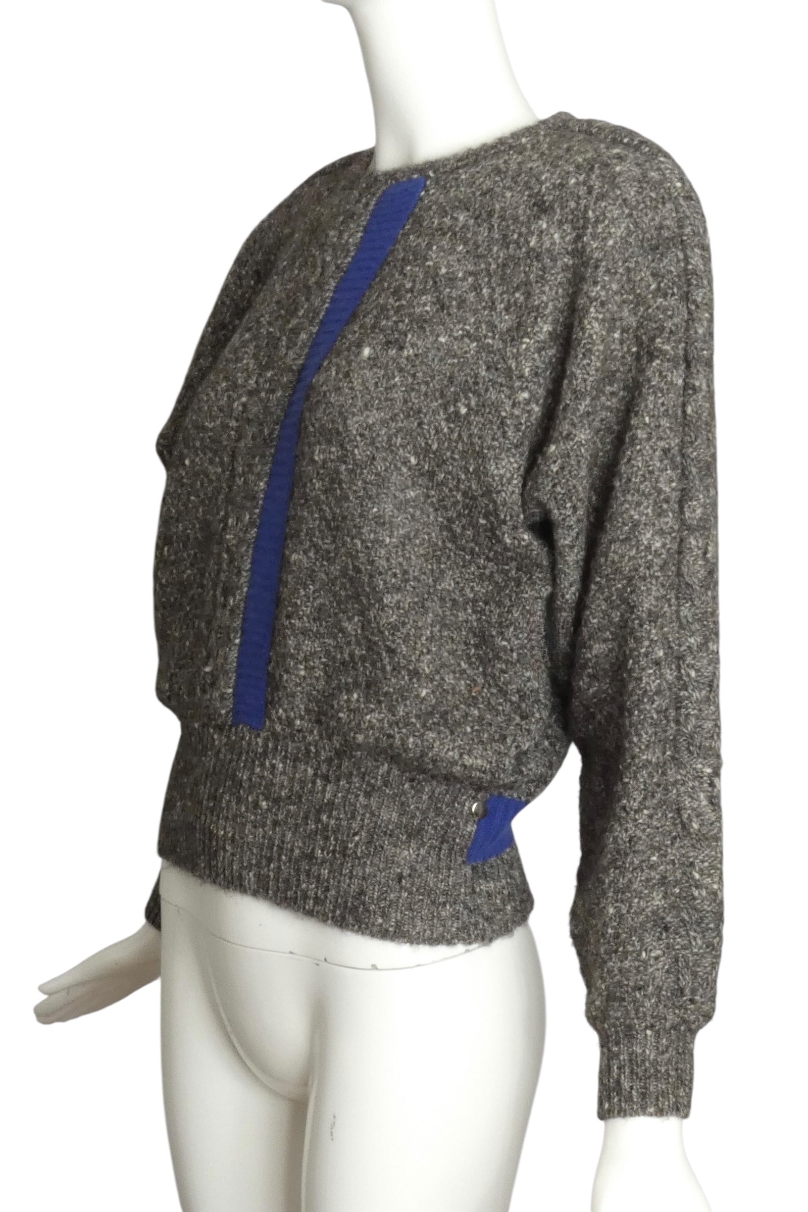 Description: This 1980s Gianni Versace wool sweater in size 6 offers timeless warmth and style. Featuring a distinctive grey stripe down the front accentuated by a blue ribbed knit stripe on the side, it exemplifies sophisticated design details from the era. The wide ribbed waistband and wristbands provide a structured fit and added comfort, making it a refined choice for vintage fashion enthusiasts.