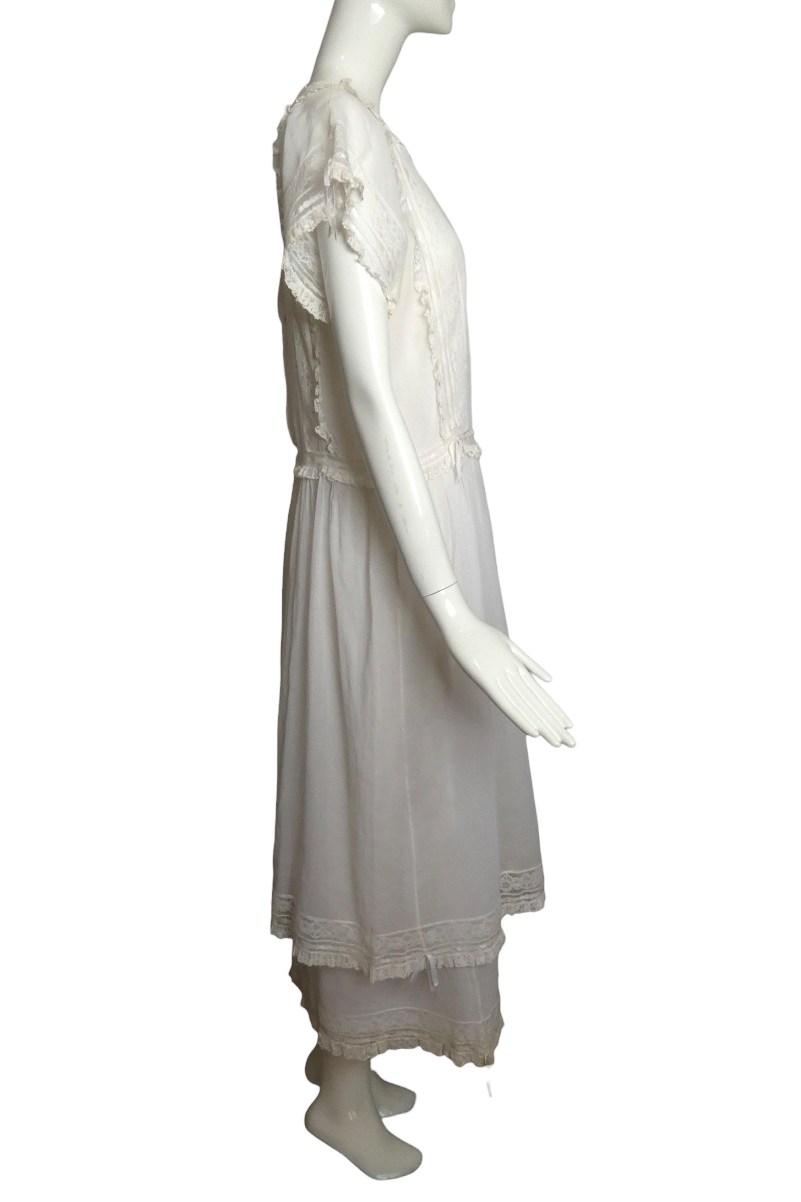 Description: This exquisite Gina Fratini maxi dress exemplifies 1970s romantic elegance with its Edwardian-inspired silhouette. Crafted from crisp white lawn, the dress features a delicate slip foundation trimmed in fine machine lace with charming ruffled edges. The fitted bodice showcases a square neckline and short sleeves, while intricate white lace insets and lace-edged ruffles create dimensional detail throughout. Ivory ribbons weave through the lace panels, finishing with delicate bows for an authentically vintage touch. A true collector's piece that captures the era's sophisticated femininity.