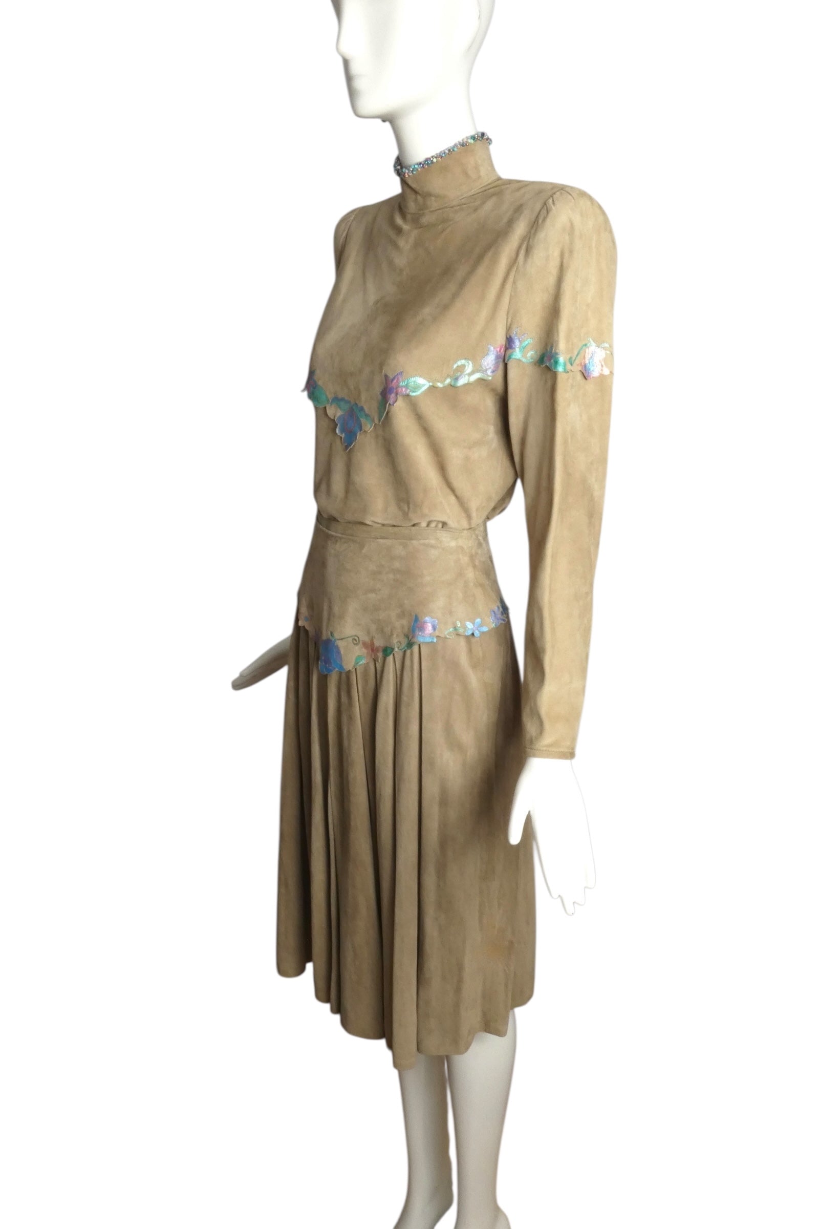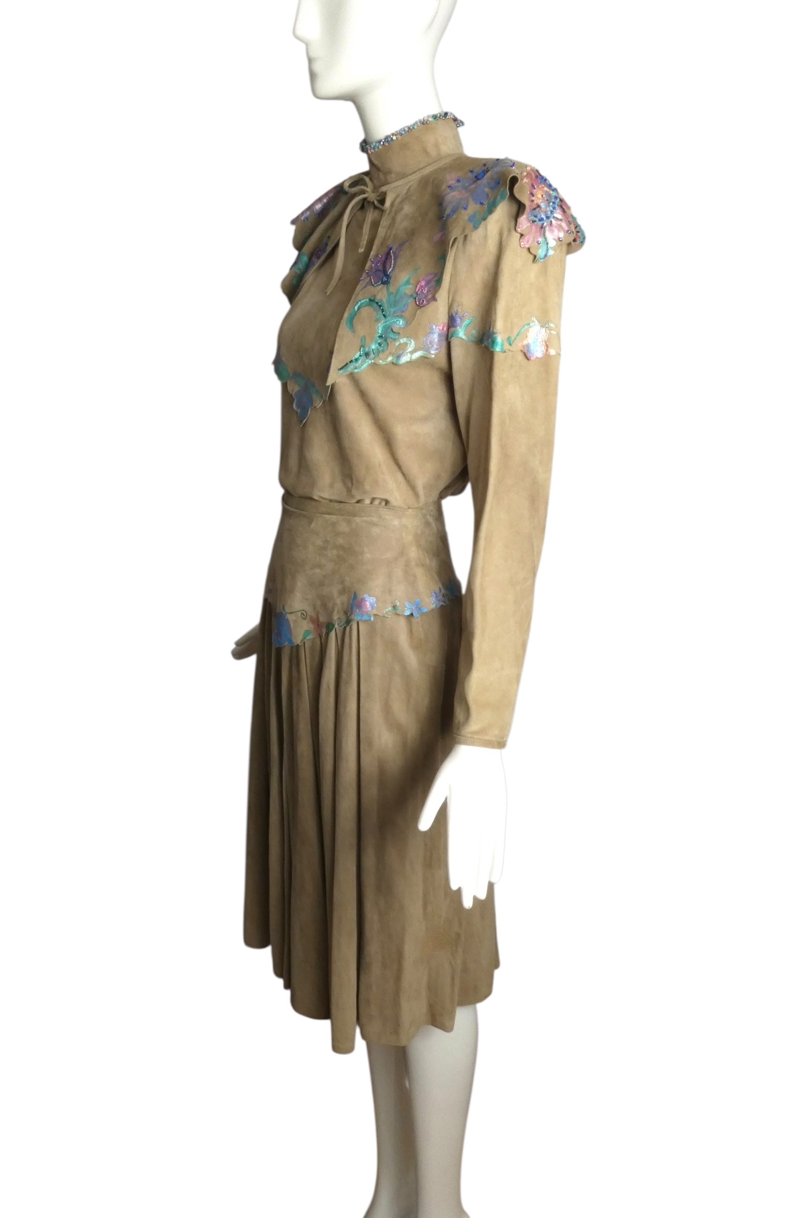 Description: This exquisite 1980s three-piece ensemble showcases artisanal craftsmanship with hand-painted taupe suede adorned in iridescent floral motifs and intricate beadwork accents. The blouse features a structured bib front with standing collar and contrasting trim, complemented by a detachable cape collar that drapes elegantly across the shoulders with front ties. The coordinating skirt presents a substantial hip yoke with generously pleated construction, creating a sophisticated silhouette characteristic of the era's refined design sensibilities.