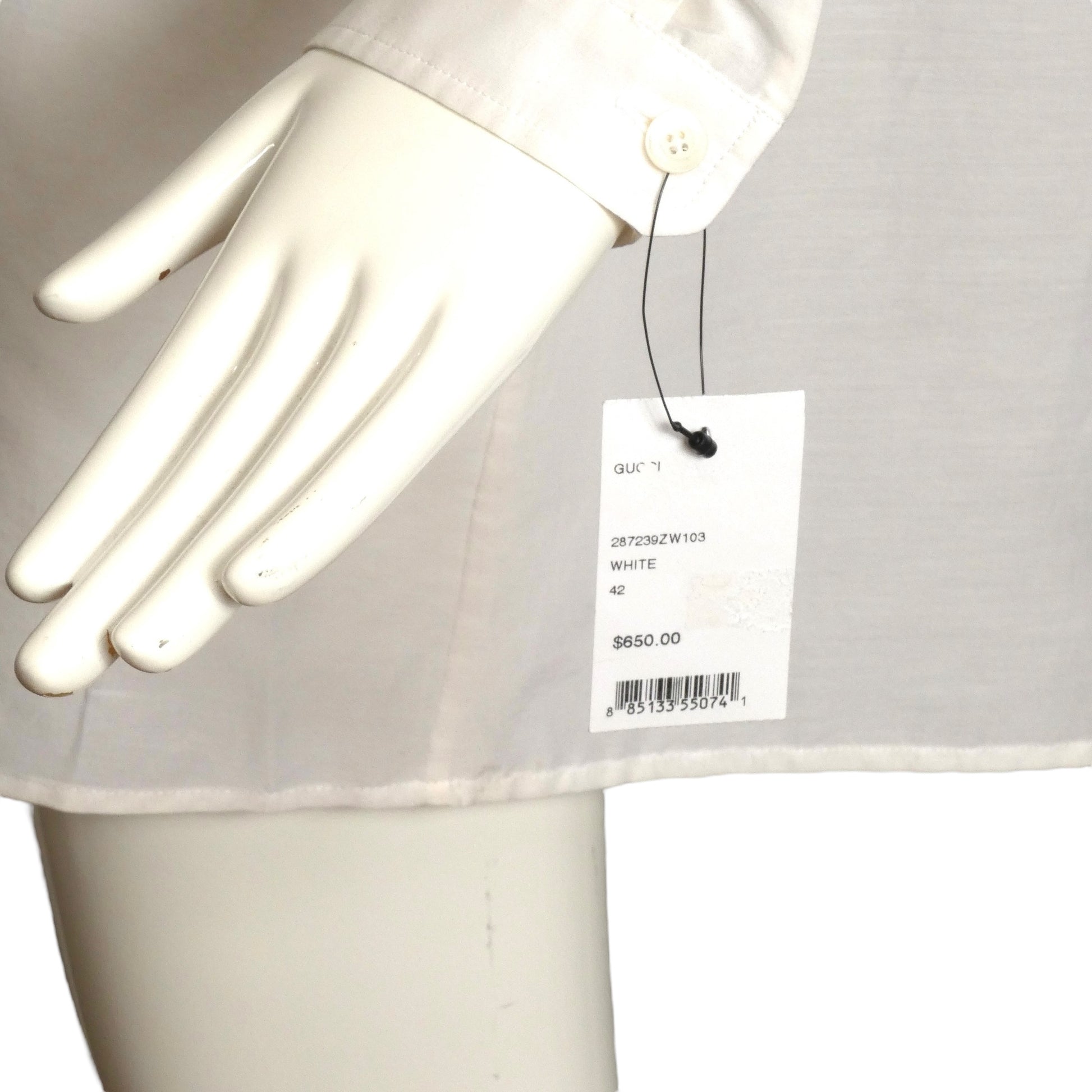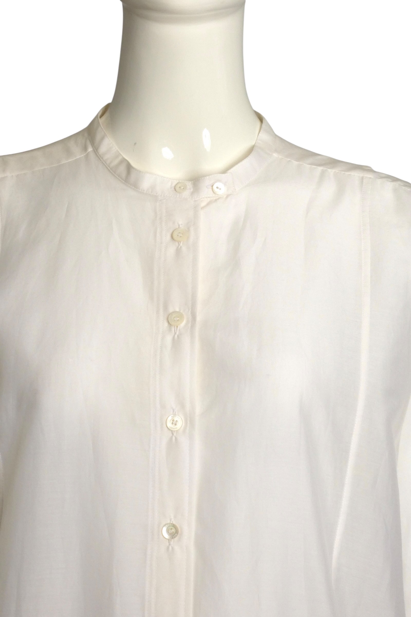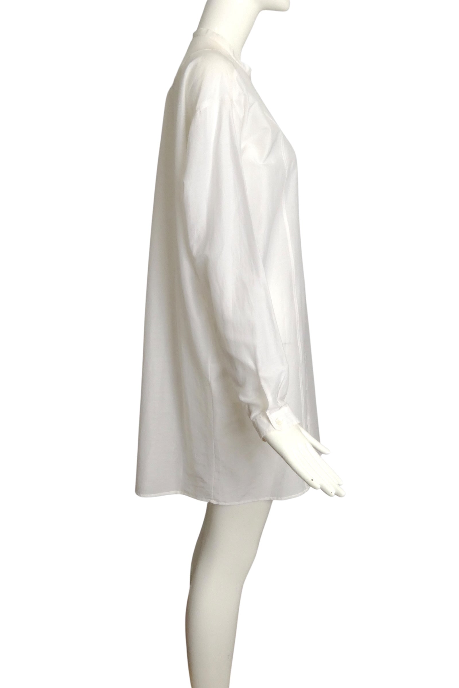 Description: This 2011 Gucci white cotton batiste shirt dress in size 8 offers exceptional lightweight comfort ideal for warm weather. Designed as an oversized shirt, it features a classic neckband and button closures running down the front for effortless style. The long sleeves finish with button-closure cuffs, combining functionality with refined detail. Brand new with store tags attached, this piece embodies Gucci’s timeless craftsmanship and elegance, perfect for a polished yet relaxed summer look.