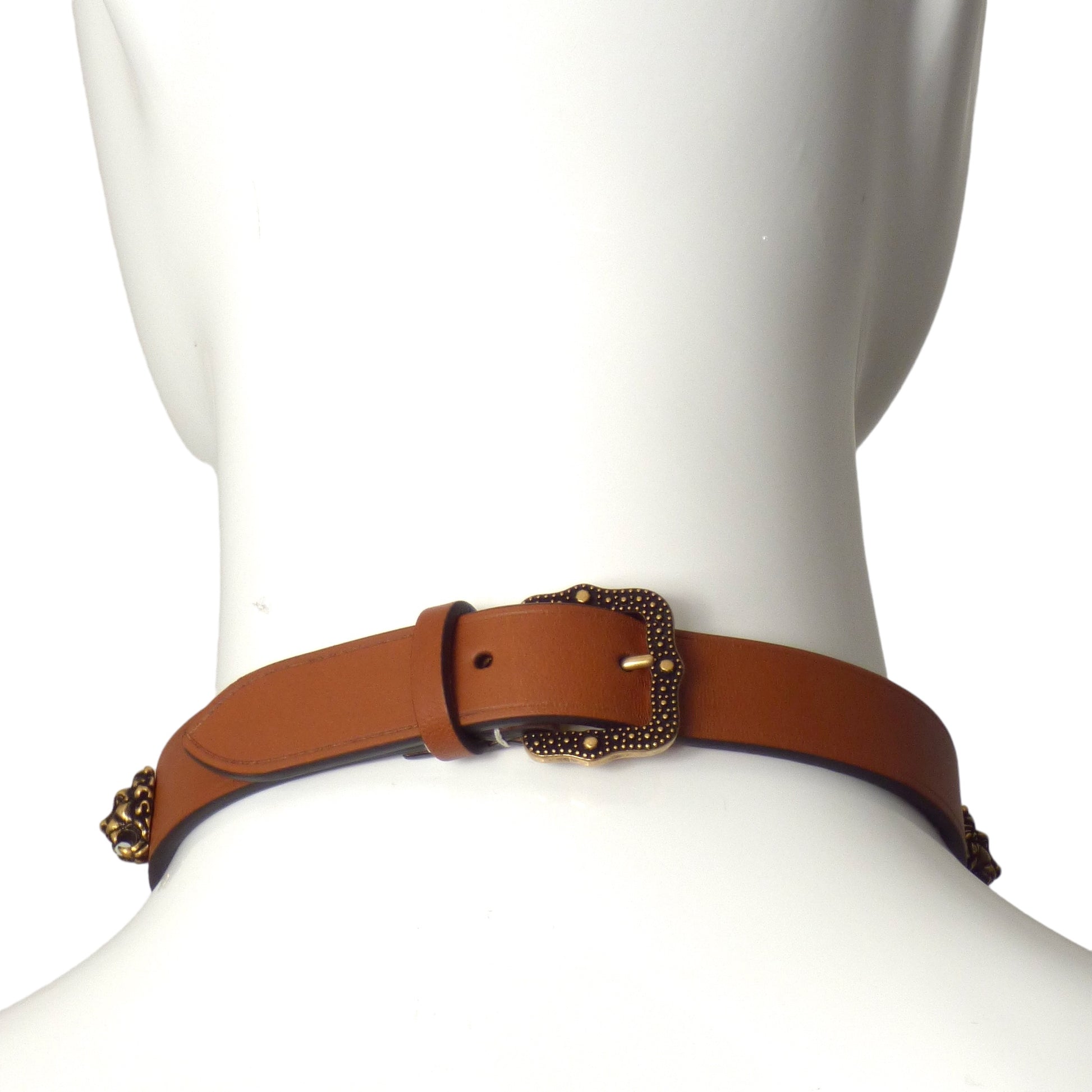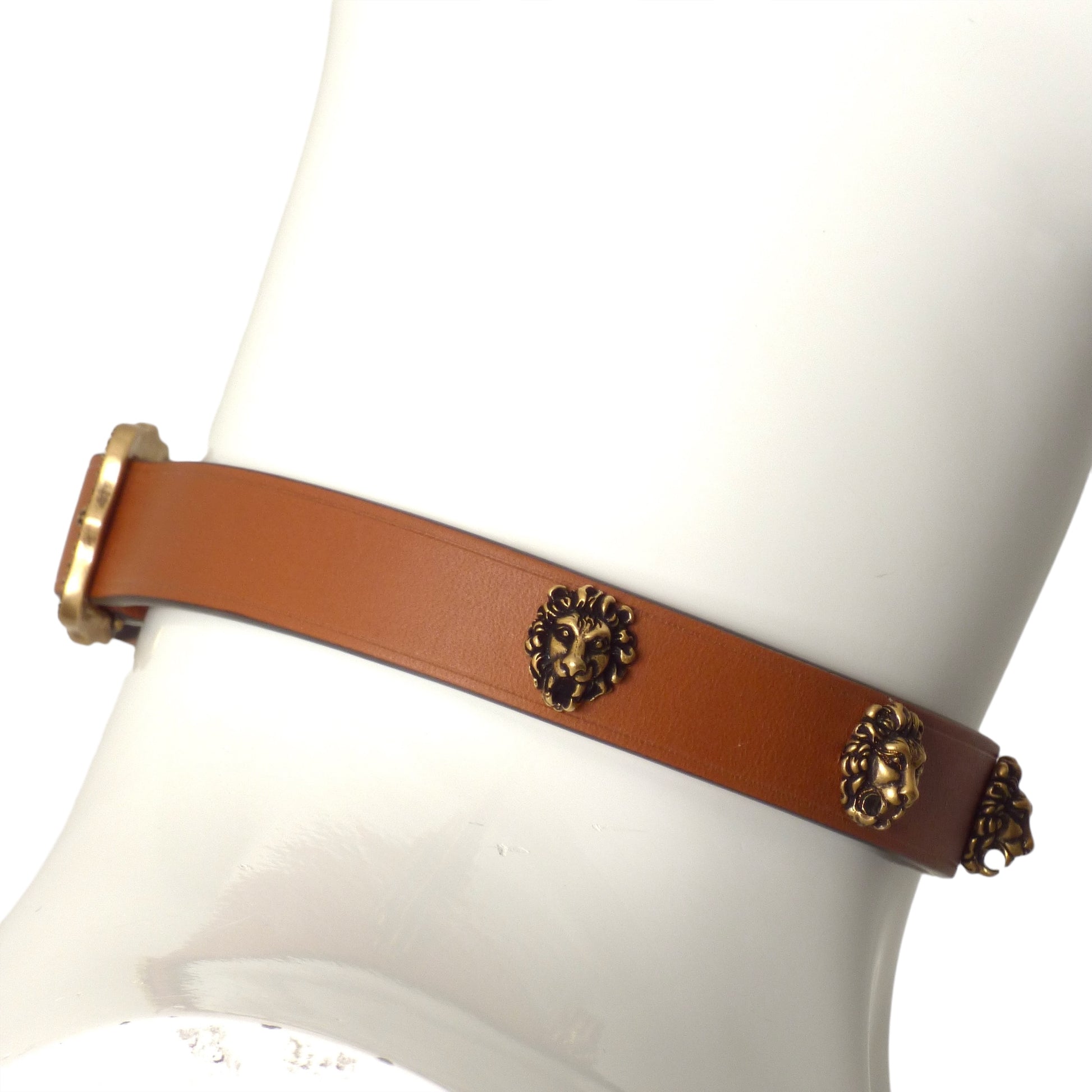 Description: Experience the wild side with Gucci's collection featuring powerful representations of creatures from the animal kingdom. This edgy leather choker features brass lion heads around the center, secured with a buckle closure at the back. Dare to make a statement with this bold and rebellious accessory.