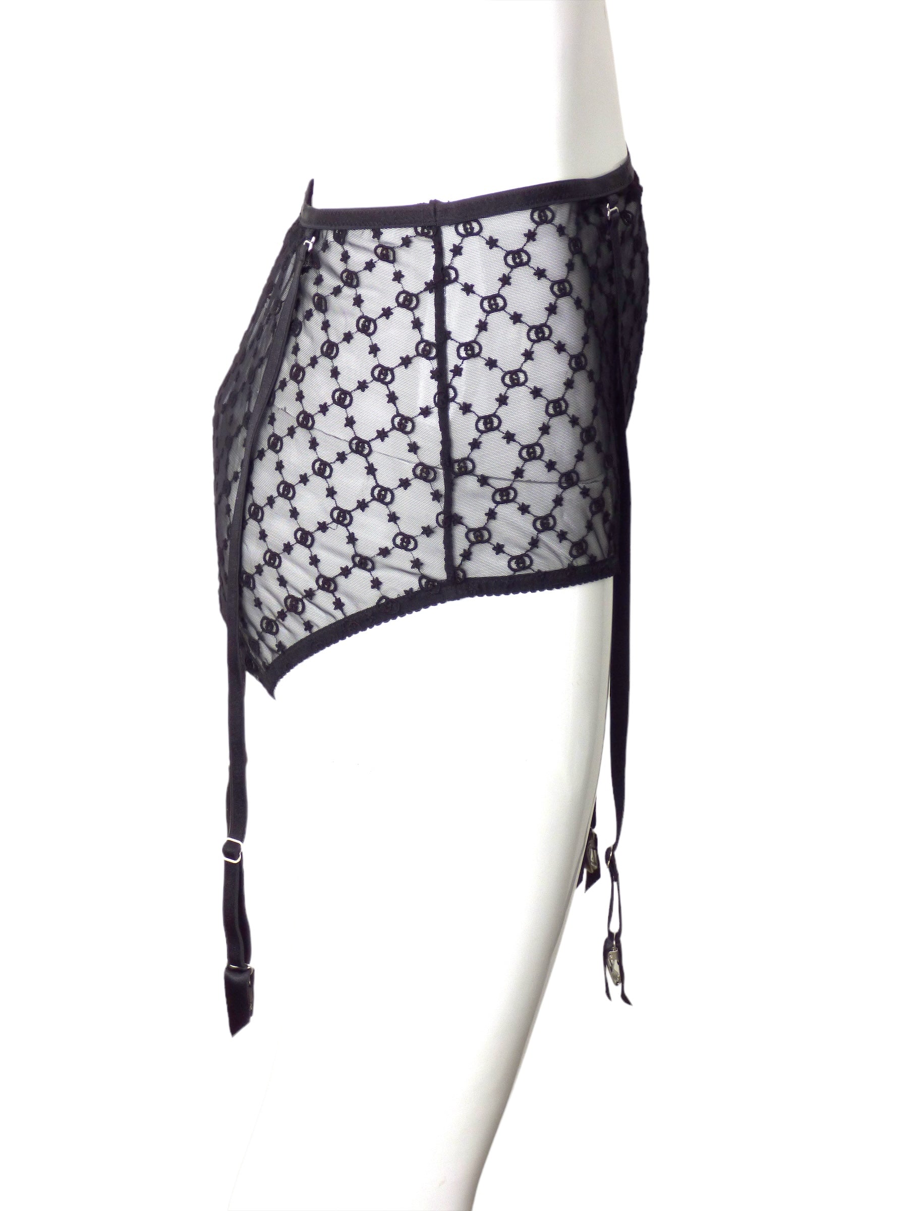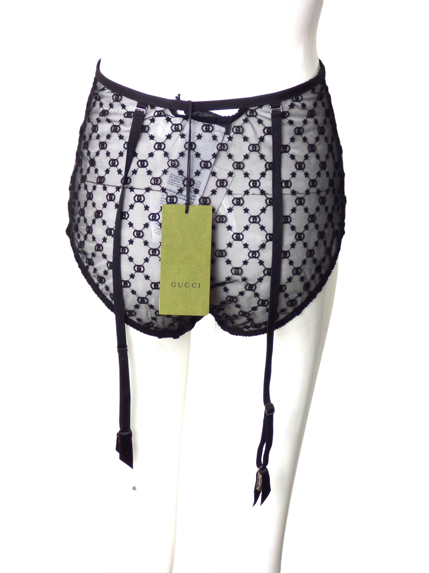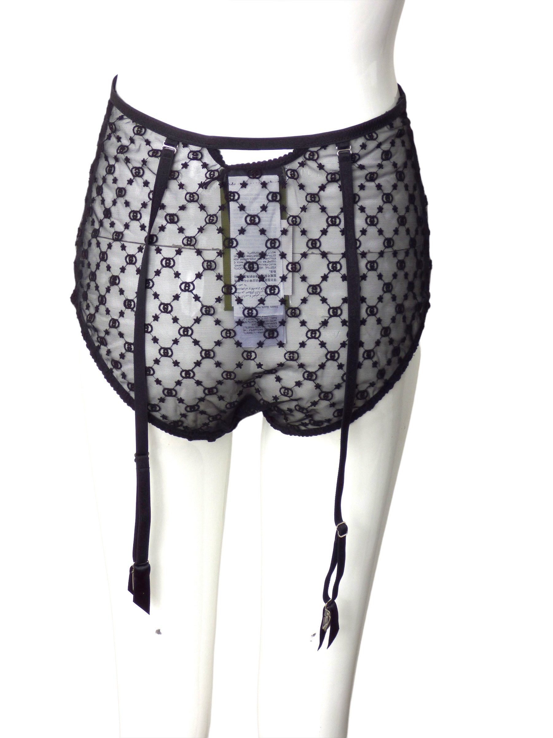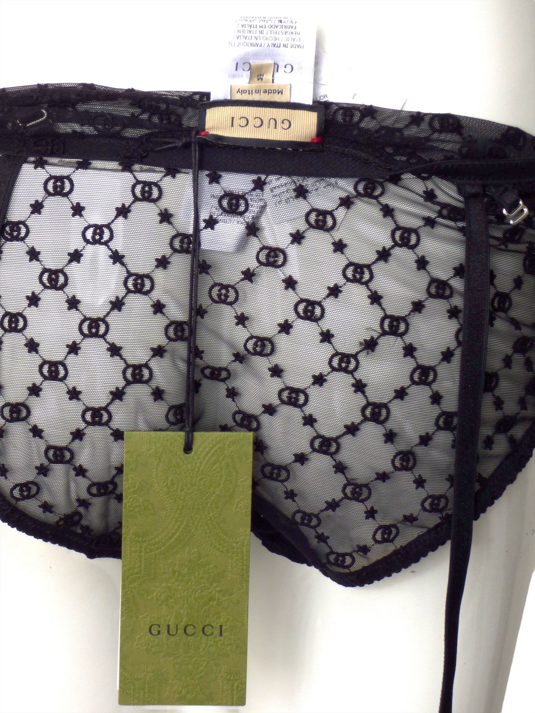 Description: Elevate your lingerie collection with these exquisite black mesh panties from the 2022 runway collection. Featuring delicate embroidered stars and "GG" logos, these panties exude luxury and style. The elastic waistband ensures a comfortable fit, while the removable garters add a touch of sensuality. Complete with store tags attached, these panties are a must-have for any fashion-forward individual.