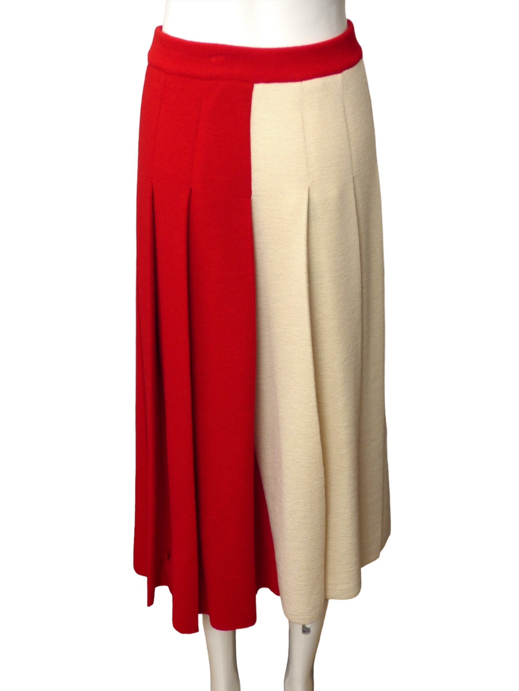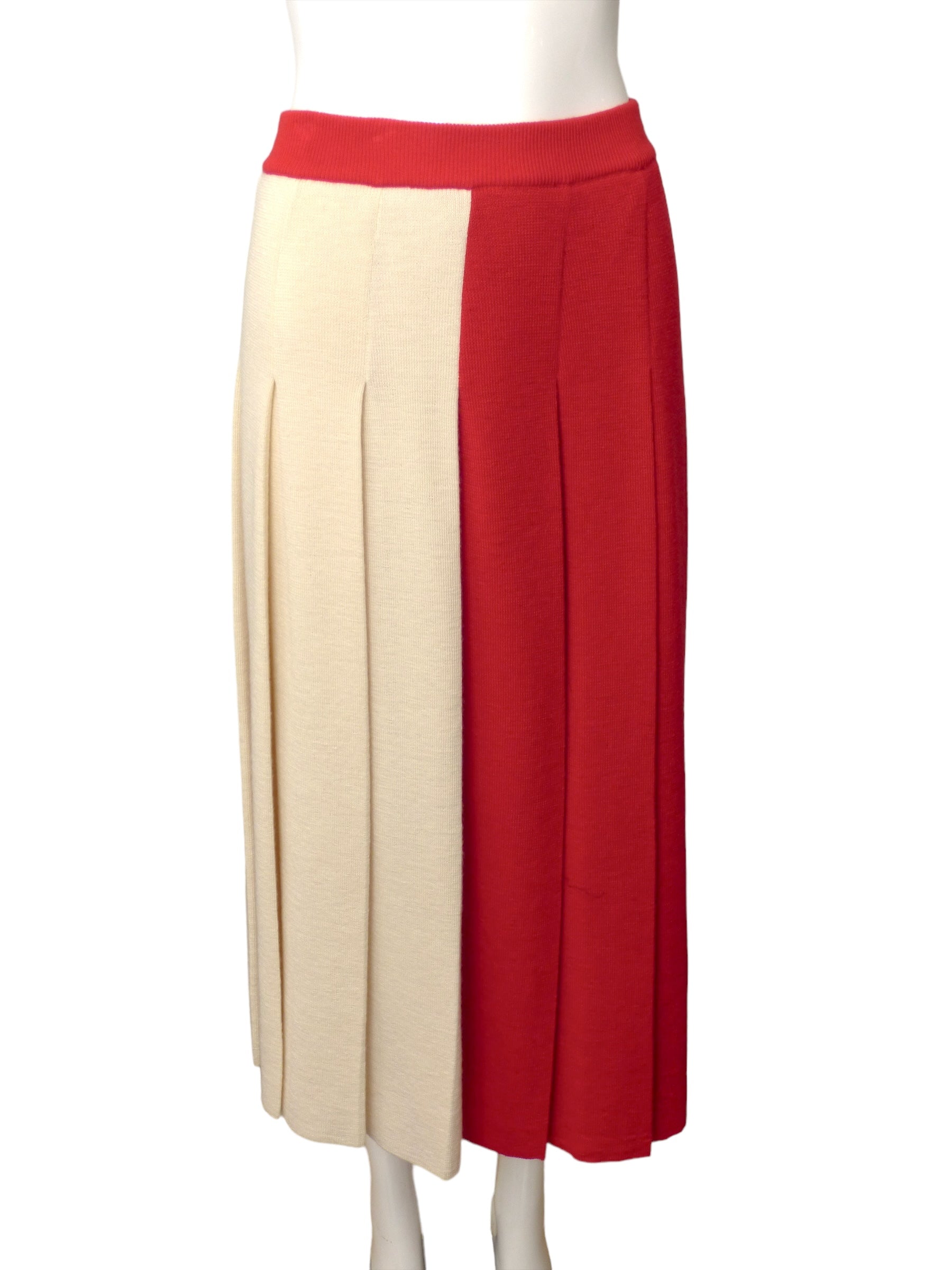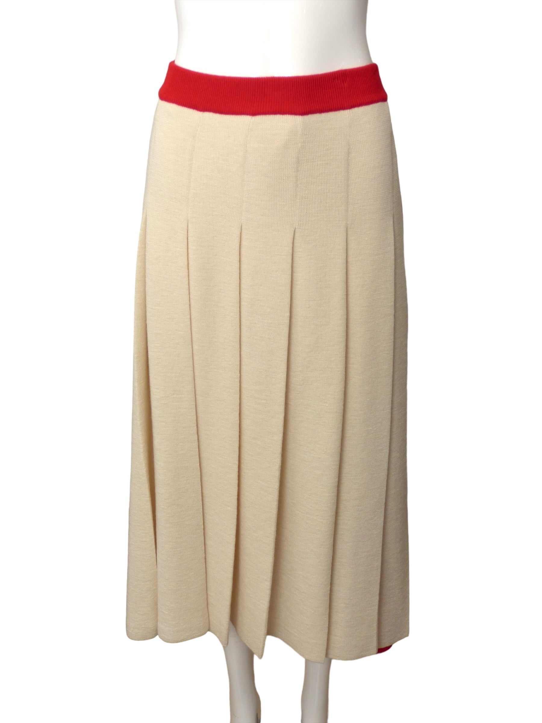 Description: Explore the elegance of the 2023 cruise runway collection with this stunning wool knit skirt in red and ivory. Featuring a wide waistband and full side pleated skirt.