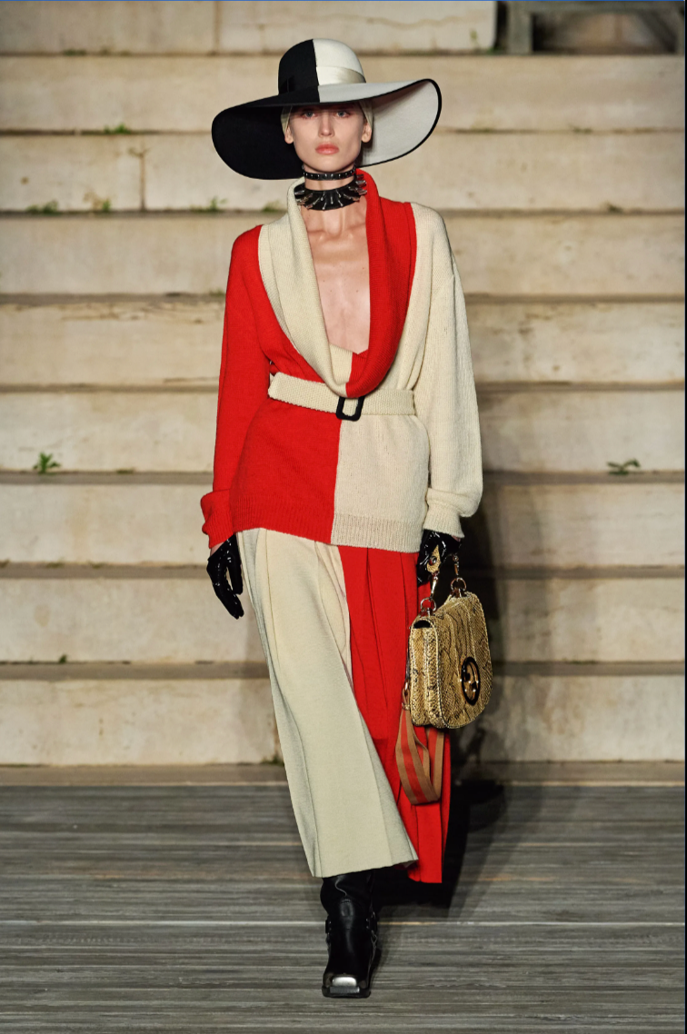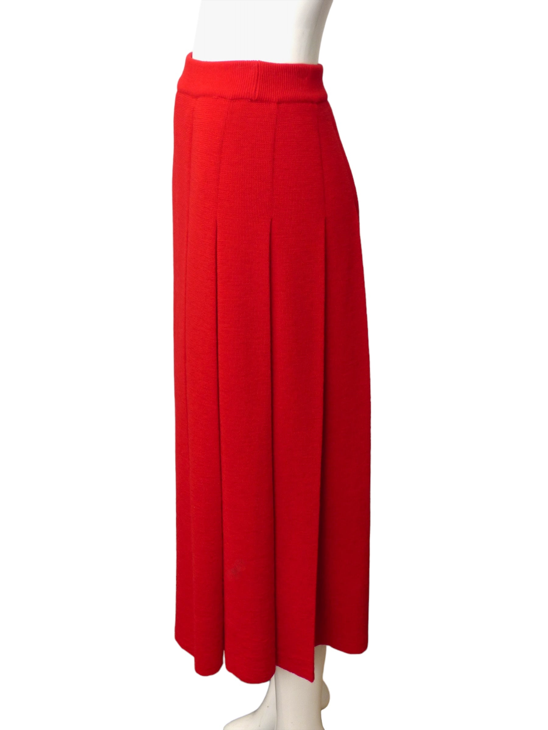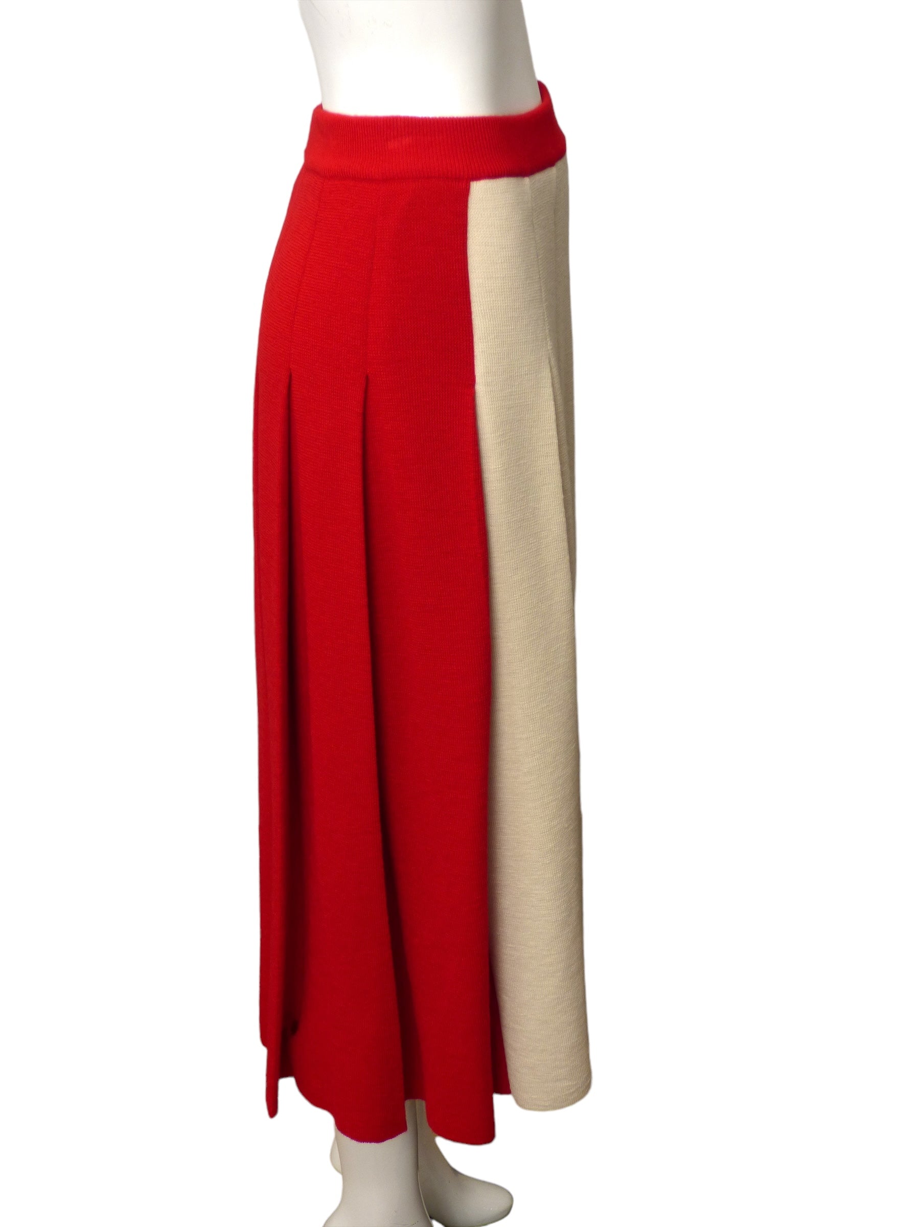 Description: Explore the elegance of the 2023 cruise runway collection with this stunning wool knit skirt in red and ivory. Featuring a wide waistband and full side pleated skirt.
